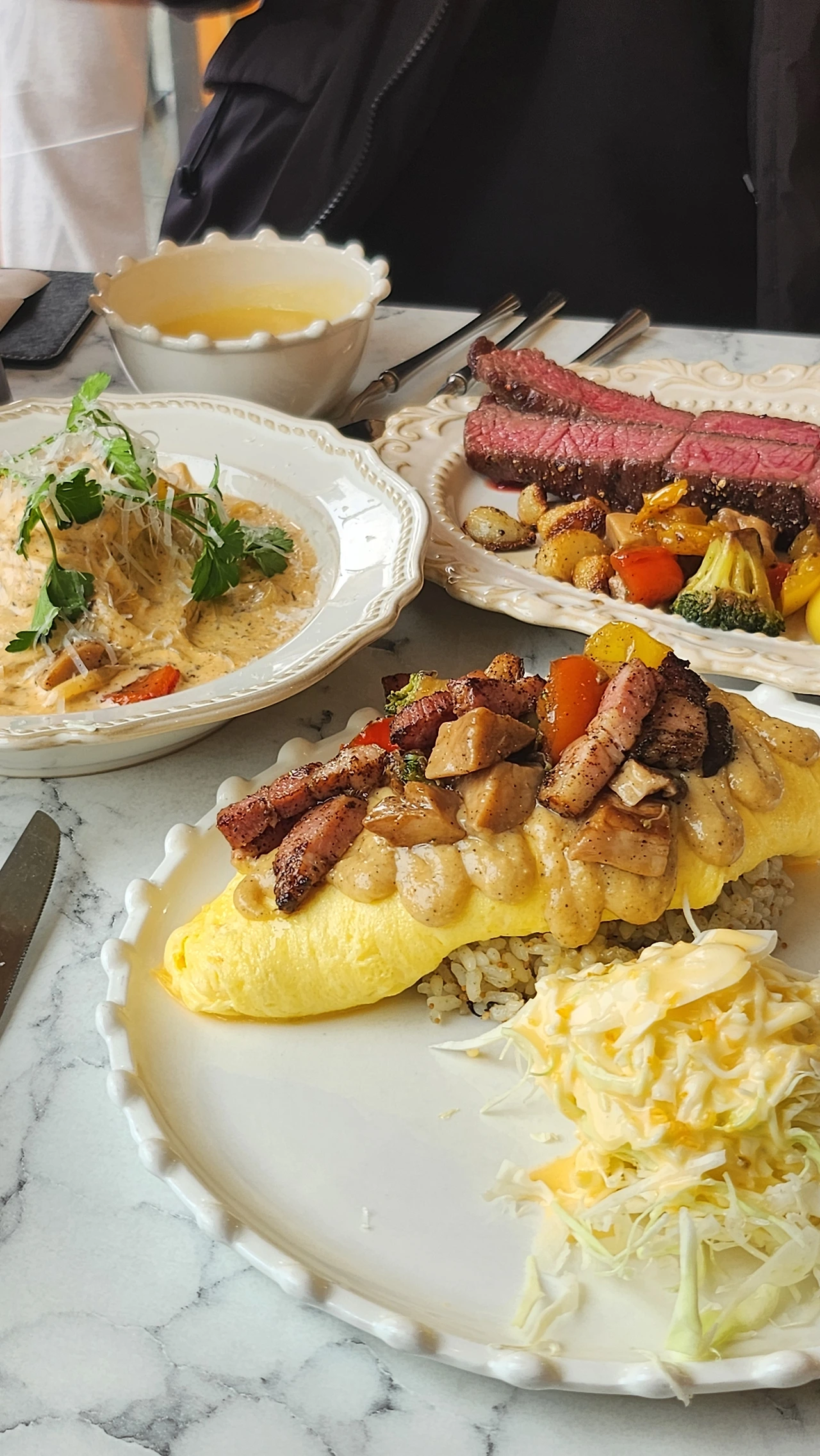 점심으로 행궁동에 위치한 에그궁에 갔다. 오믈렛, 스테이크, 파스타가 주메뉴인 곳인데 메뉴 하나하나 다 만족스러웠다. 10년 전엔 대학생이었어서 이렇게 많이 시키면 돈 때문에 벌벌 떨었었는데 직장인이 된 지금 이 시점에는 마음껏 시켜 먹을 수 있는 것이 감회가 남달랐다.