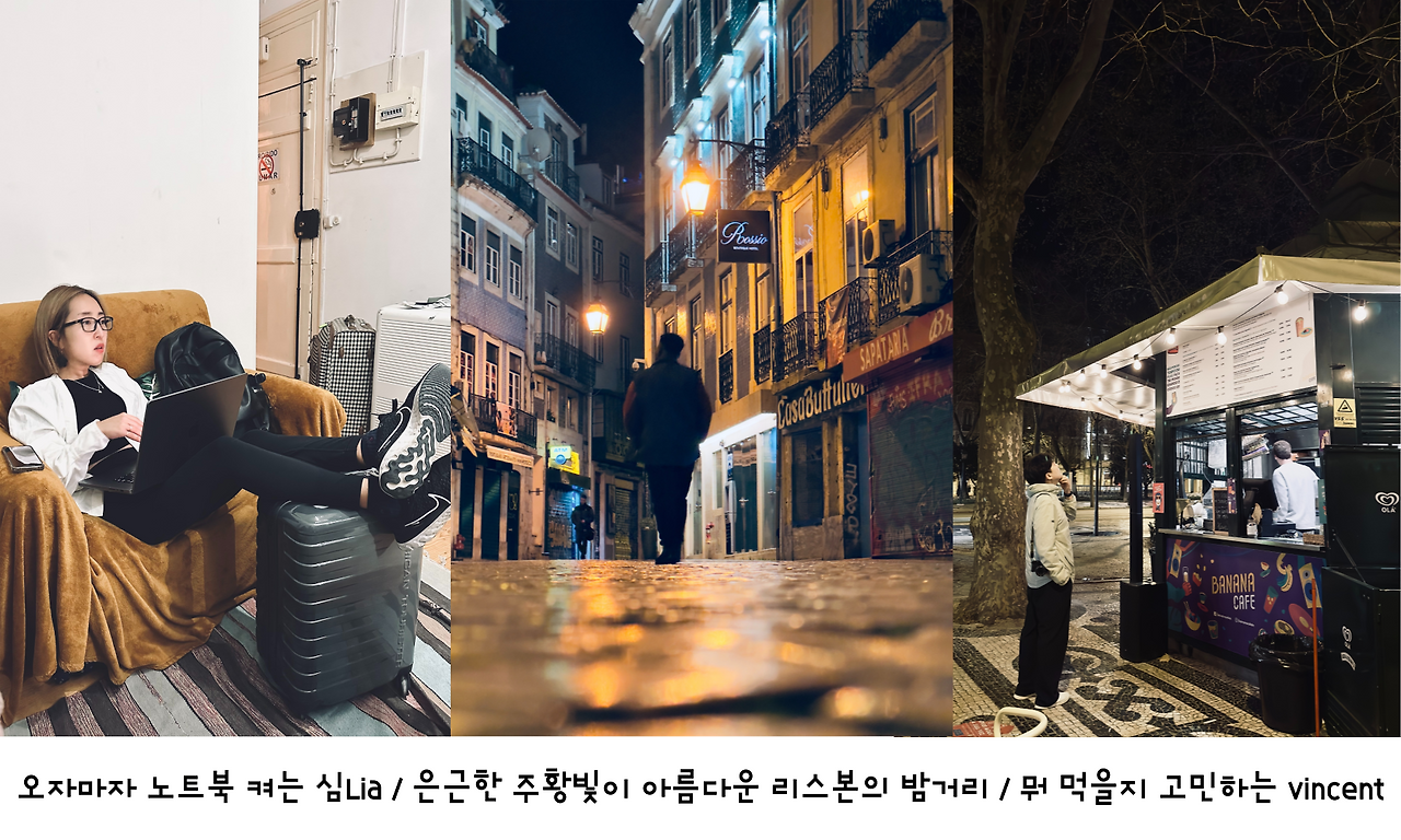 리아는 숙소에 도착하자마자 노트북을 켰다. 나와 승래는 배를 채울 요깃거리를 사러 곧장 밖으로 나갔다. 처음 본 유럽의 밤거리, 리스본의 밤은 아름답다. 물론 낮도 좋지만, 본의 아니게 5박 6일간 머문 리스본은 낮보다 밤이 아름다웠다. 리스본의 밤은 은근한 주황색 전구 불빛들이 타일로 된 거리 바닥에 윤슬마냥 반짝거리고, 노랗고 빨간 트램들이 아직 꺼지지 않은 밤거리를 아주 여유롭게 가로지른다. 그리고 이런 이국적인 분위기가 내가 이곳에서 분명한 이방인임을 다시 한번 알게 해 준다. 낯선 밤거리를 한참을 배회하다 'BANANA CAFE'라는 한국의 편의점? 푸드트럭? 과 비슷한 곳에서 고기파이 몇 가지와 맥주를 사들고 승래와 나는 다시 숙소로 돌아갔다.