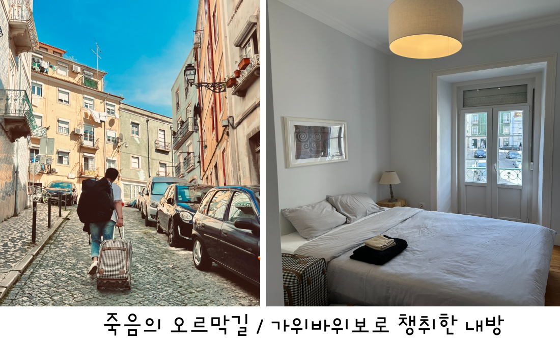 리아, 승래, 나, 우리 셋은 인천공항을 떠난 지 20시간, 비행시간만 15시간이 넘는 장거리 비행 끝에 나의 첫 유럽 여행인 포르투갈 리스본 국제공항에 도착했다. 나에게는 비행자체가 엄청난 챌린지였는데 다행히 무사히 비행을 마치고 이국땅을 밟을 수 있었다. 우리의 최종 목적지는 축구선수 크리스티아누 호날두의 고향으로도 유명한 마데이라 제도이지만, 리스본에서 다시 비행기를 타고 들어가야 하기 때문에 이양 온 리스본에서 3박 4일간 머무르고 가기로 했다. 그리고 우리는 이미그레이션을 채 통과하기도 전에 우리가 대책 없고 계획 없는 'P'(MBTI)라는 사실을 다시 한번 깨달았다. 시차 계산을 잘못해 당장 오늘 지낼 숙소가 없는 것이다. 맙소사... 부랴부랴 숙소 예약 어플을 열어 오늘 묵을 숙소를 예약했다. 공항을 나와 조금 전에 예약한 숙소로 가기 위해 택시를 탔다. 여기는 신기한 게 공항에서는 우버를 부를 수가 없었고, 셋다 짐이 너무 많았기 때문에 우버보다는 비싸지만 일반 택시를 타게 됐다.(택시는 경찰이 잡아준다 신기방기) 택시를 타고 "리스본 - Santa Maria Marior"에 위치한 숙소에 도착했다. 엘리베이터가 없는 3층 건물 숙소였는데 우리가 묵을 곳이 3층이었고, 캐리어를 버리고 싶었다. 꾸역꾸역 짐을 들고 들어가 보니 급하게 구한 거 치고는 꽤 괜찮은 곳이다.