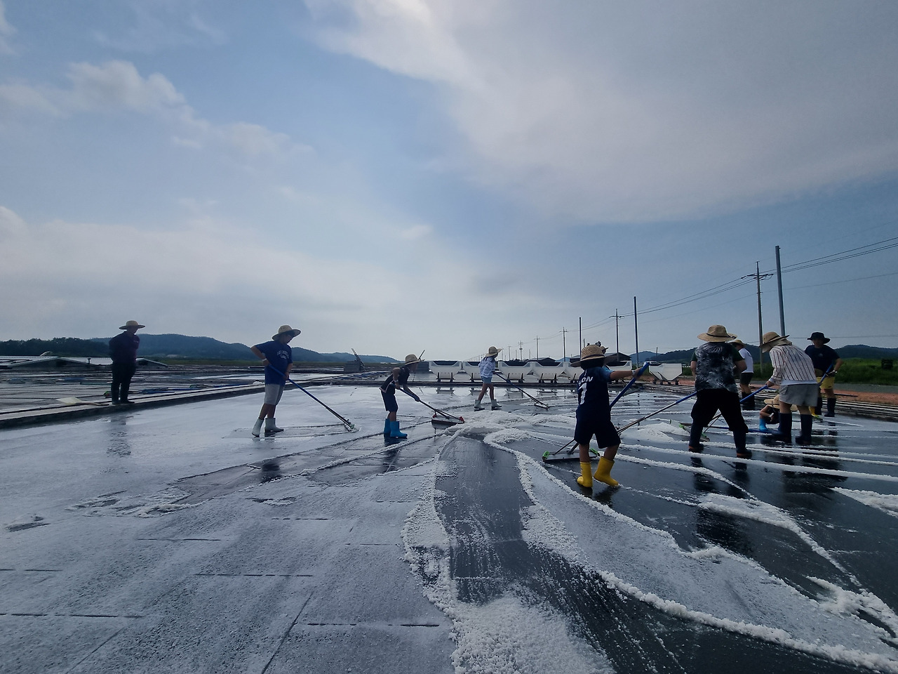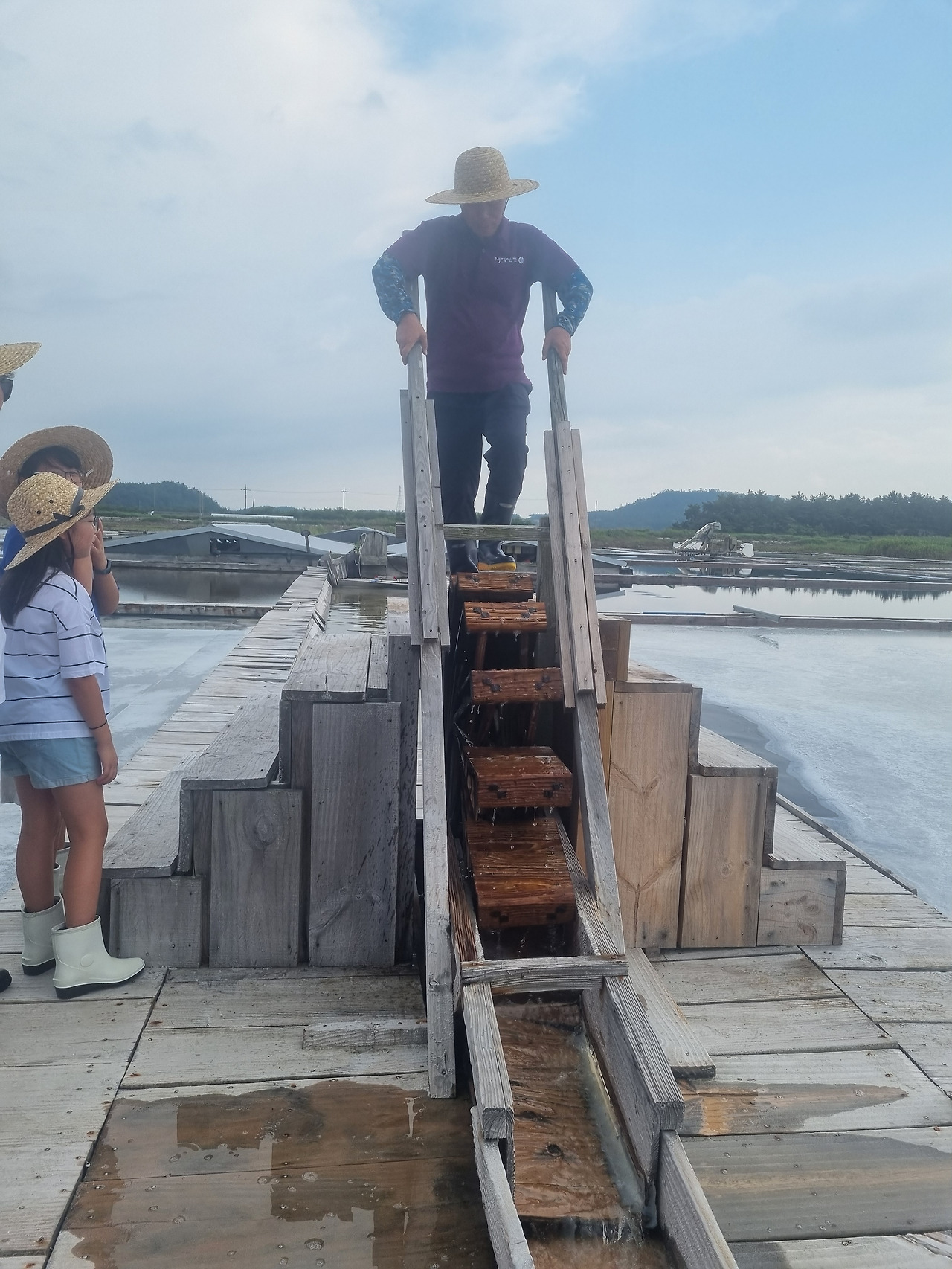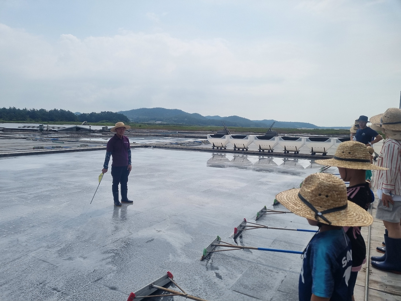 처음 강의실 같은 곳에서 천일염을 만드는 과정을 쉽게 설명해 주셨다. 나는 염전에 바로 바닷물을 넣고 그냥 기다리면 소금이 만들어지는 줄 알았다. 따로 염도를 높이기 위해 물을 저장하고, 그 물을 우리가 흔히 아는 염전인 증발지로 수차를 돌려 채워놓고 증발지에서 증발되어 소금이 만들어지면 대파라는 밀대도구를 이용해 소금을 모은다. 이렇게 만들어진 소금을 저장해 물을 뺀다고 한다. 우리는 수많은 과정 중 처음으로 증발지에서 대파라는 도구로 소금을 모으는 체험을 하였다.