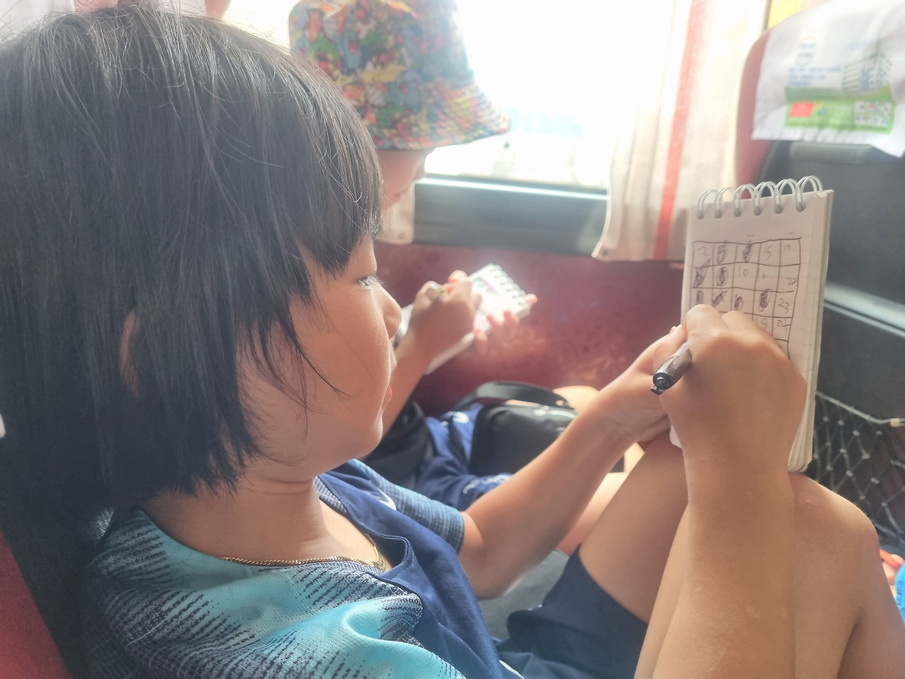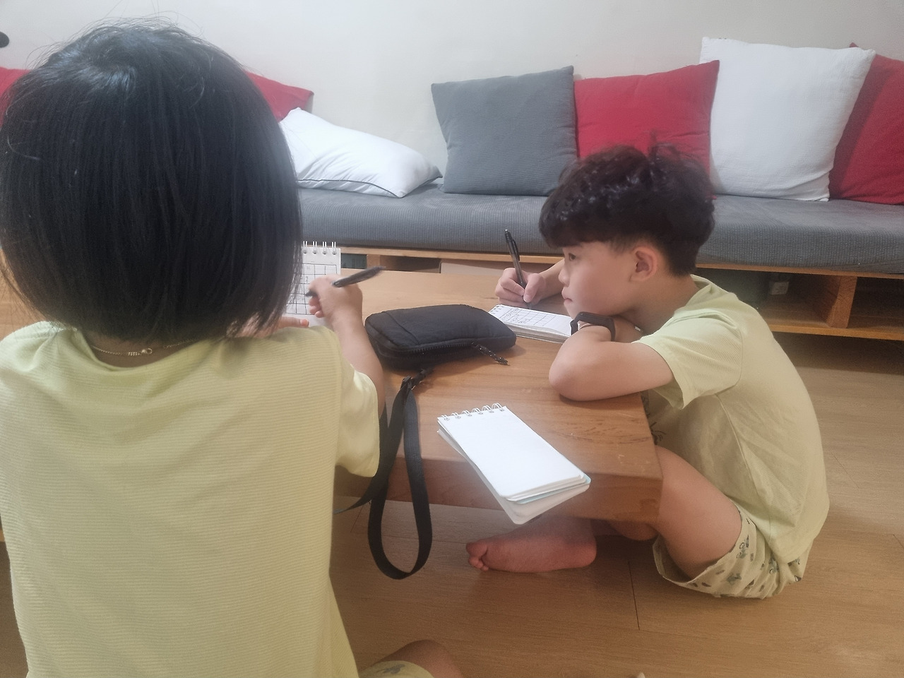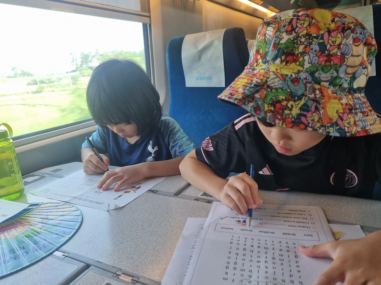 오송에서 목포행 기차를 타고 서로 마주 보며 엄마와 약속한 1일 1영어 학습지 미션도 수행했다. 이번 여행의 허락에 결정적인 역할을 했던 것은 수첩과 연필 그리고 영어학습지이다. 이번 여행을 다니며 아이들에게 손선풍기와 수첩을 하나씩 사주었다. 버스나 기차를 이용한 여행이니 만큼 휴대폰이 없는 아이들에게는 지옥 같은 시간일 수 있다는 생각에서였다. 그래서 스무고개나 빙고게임을 하면서 가겠다고 하여 아내는 선듯허락을 해주었다.