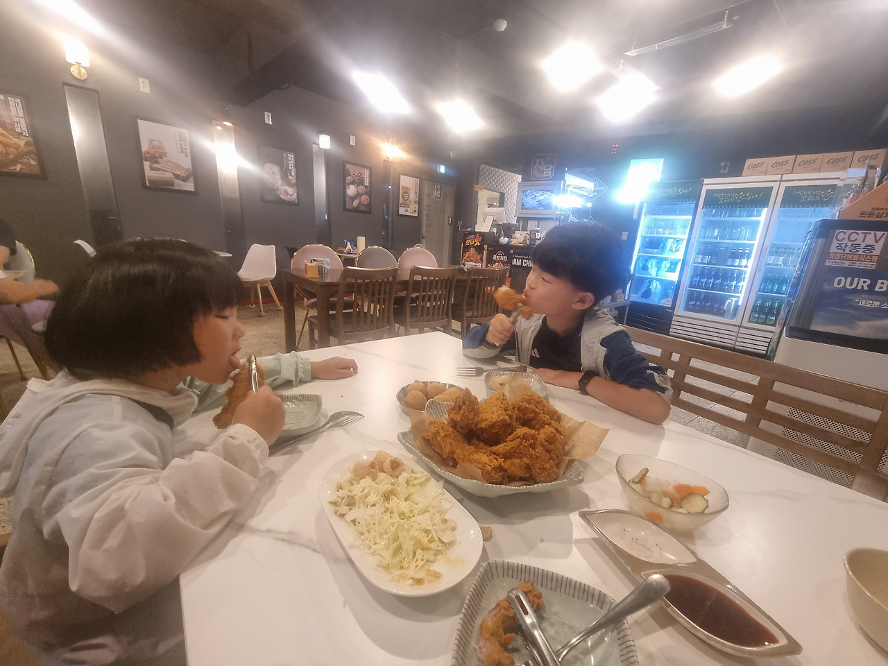 근처 치킨집에서 저녁을 해결하고 게스트하우스로 돌아와 빙고게임을 하고 잠자리에 들었다. 아이들은 게스트하우스 거실 공간을 참 좋아했다. 제주도로 여행하시는 어떤 아저씨에게 간식도 드리고 이야기도 나눴다. 다음에 게스트하우스에 가면 공용 주방을 이용해 봐야겠다.