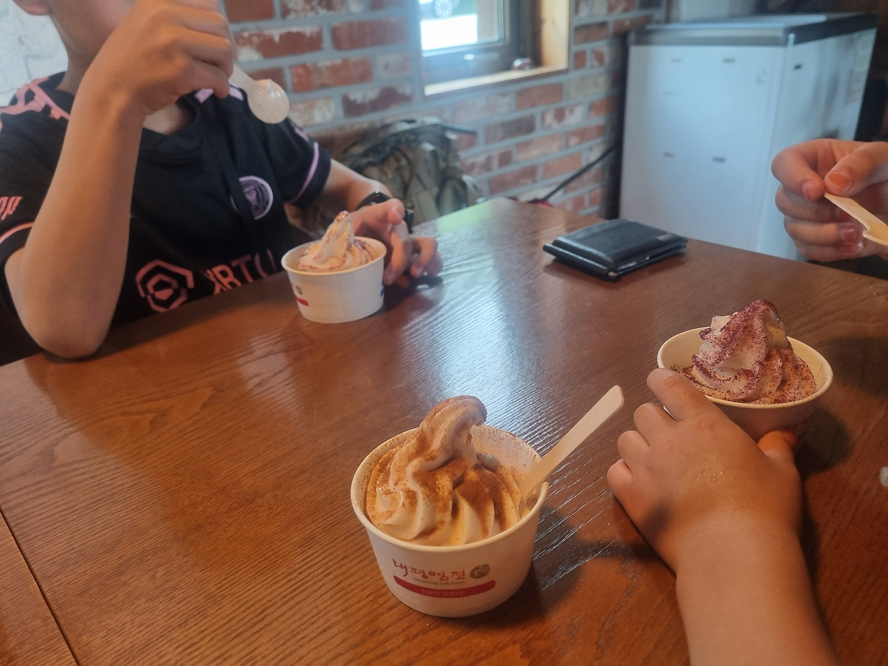 소금박물관 주변에는 소금향카페 말고도 바로 건너에 소금아이스크림 판매점이 따로 있다. 우리는 소금박물관에서 받은 쿠폰으로 아이스크림을 또 먹었다. 그곳에는 아주머니 두 분이 계셨는데 우리에게 많은 관심을 보이셨다. 기특하다. 대단하다는 칭찬도 아끼지 않아 아이들 어깨에 힘이 잔뜩 들어갔다.
