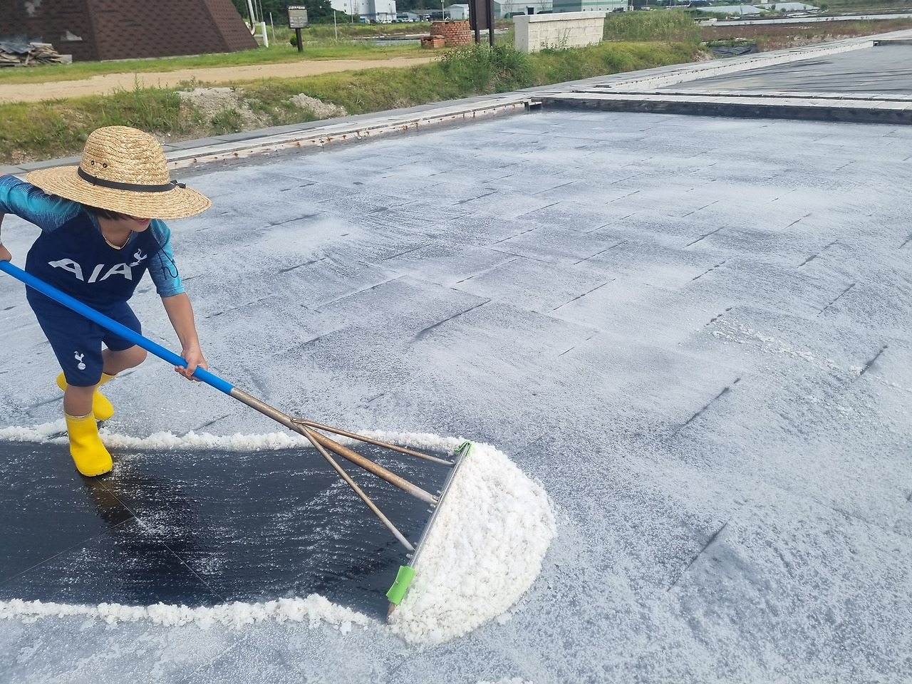 체험은 우리 가족 제외 4팀이 더 있었다. 대부분 초등학생 정도되어 보이는 아이를 동반한 가족이었다. 증발지 한 칸에 물이 증발되고 남아 있는 흩어진 소금을 대파로 모으는 작업은 힘들지만 재미있는 작업이었다. 아이들도 좋아했다. 수확의 기쁨을 느꼈을까? 불과 10분이 채 되지 않아 작은 소금 동산이 만들어졌다.