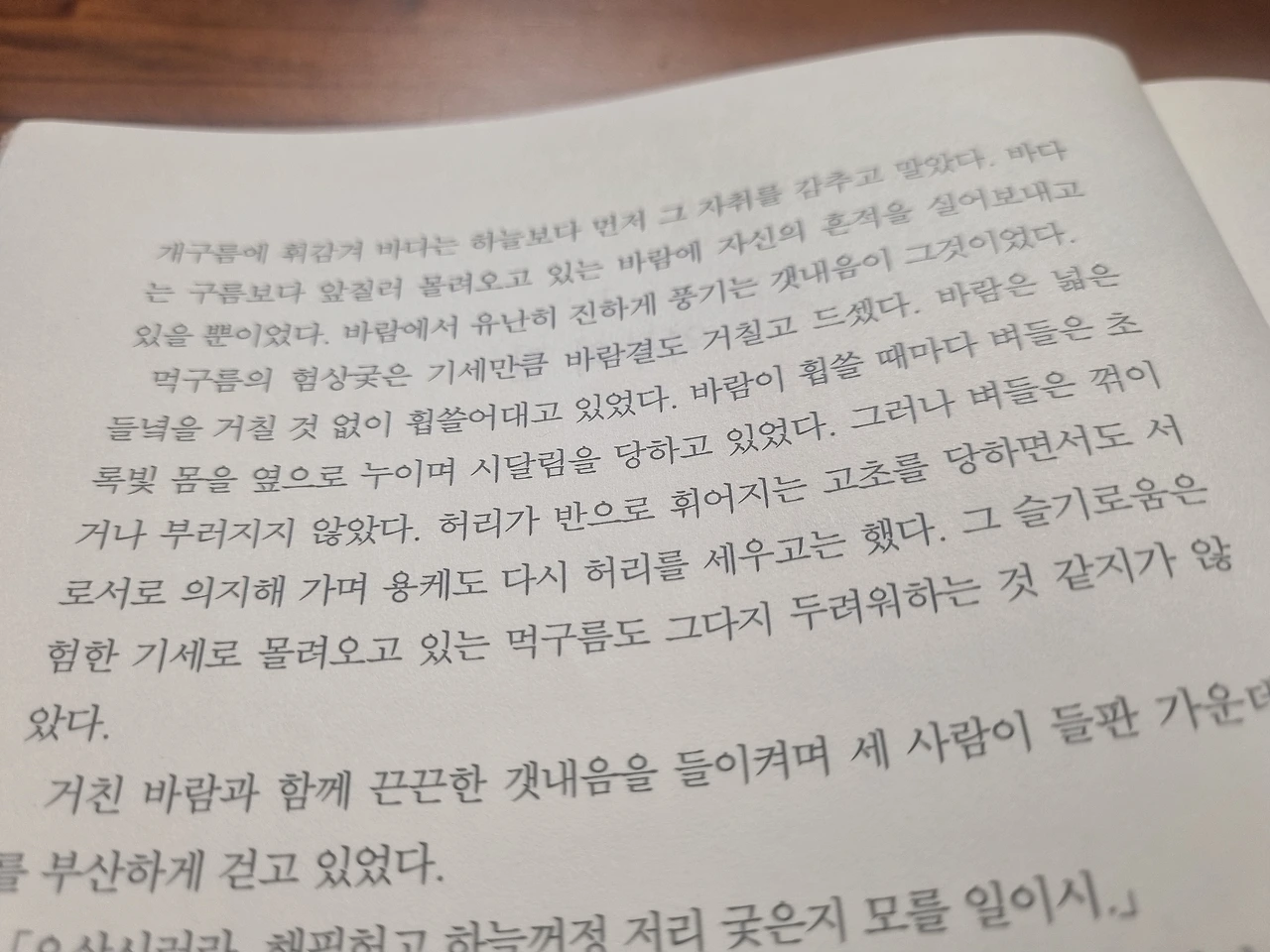 먹구름은 험상궂은 기세만큼 바람결도 거칠고 드셌다. 바람은 넓은 들녘을 거칠 것 없이 휩쓸어대고 있었다. 바람이 휩쓸 때마다 벼들은 초 록빛 몸을 옆으로 누이며 시달림을 당하고 있었다. 그러나 벼들은 꺾이 거나 부러지지 않았다. 허리가 반으로 휘어지는 고초를 당하면서도 서로서로 의지해 가며 용케도 다시 허리를 세우고는 했다. 그 슬기로움은 험한 기세로 몰려오고 있는 먹구름도 그다지 두려워하는 것 같지가 않았다.