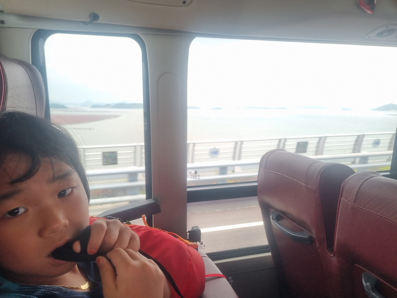증도로 우리를 데려다 줄 작은 시골버스가 왔다. 이 버스 안에는 역시 기사님과 아빠 그리고 아들 둘만 타게 되었다. 아이들은 배도 불러 노곤했는지 금세 잠이 들었다. 그러다 문득 둘째가 잠에서 깨어 울상으로 내게 물었다.