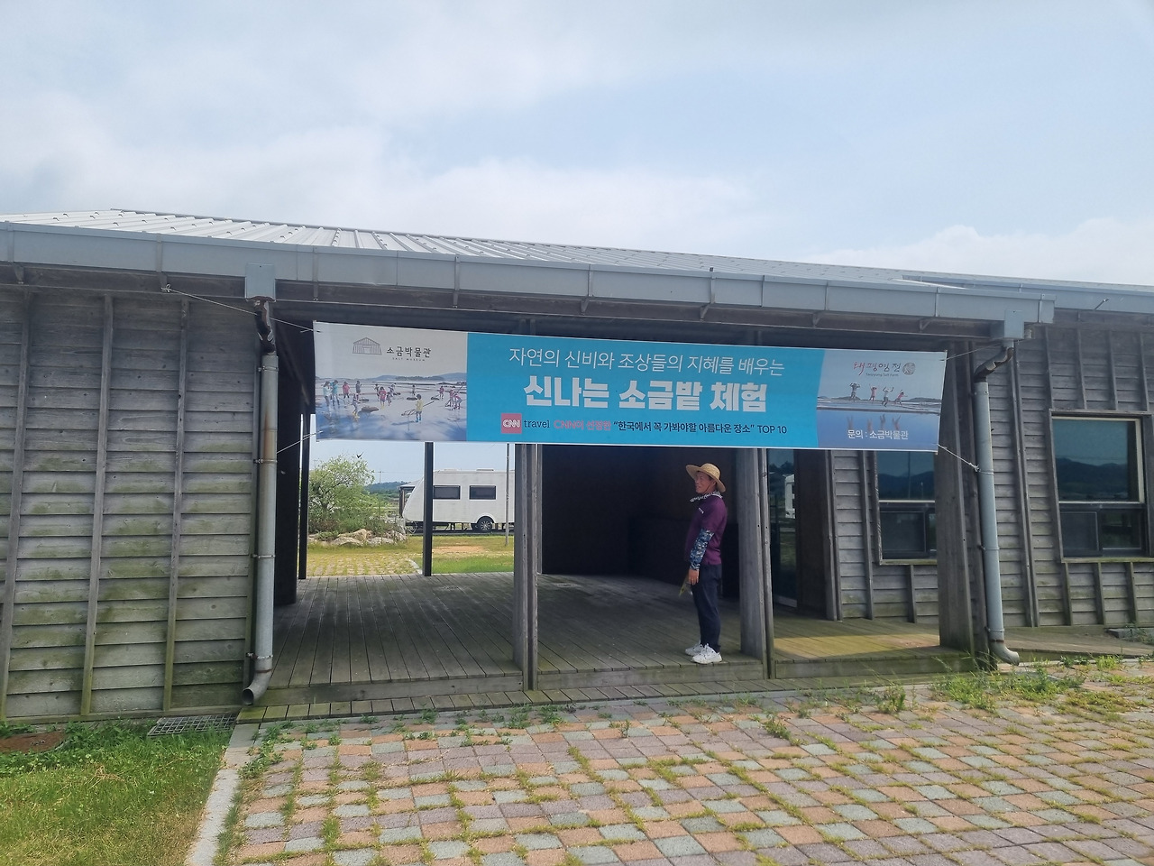아이스크림을 먹고 카페 길 건너편에 위치한 소금박물관으로 갔다. 증도 시내로 나가는 버스가 돌아오는 시간이 촉박하여 박물관 내부를 관람할 수 없어서 아쉬웠다. 배낭을 박물관 내부에 맡겨두고 시원한 물과 밀짚모자를 받았다. 이 밀짚모자는 이때부터 4박 5일간 우리와 한 몸이 되어 배낭여행 동지가 되었다.