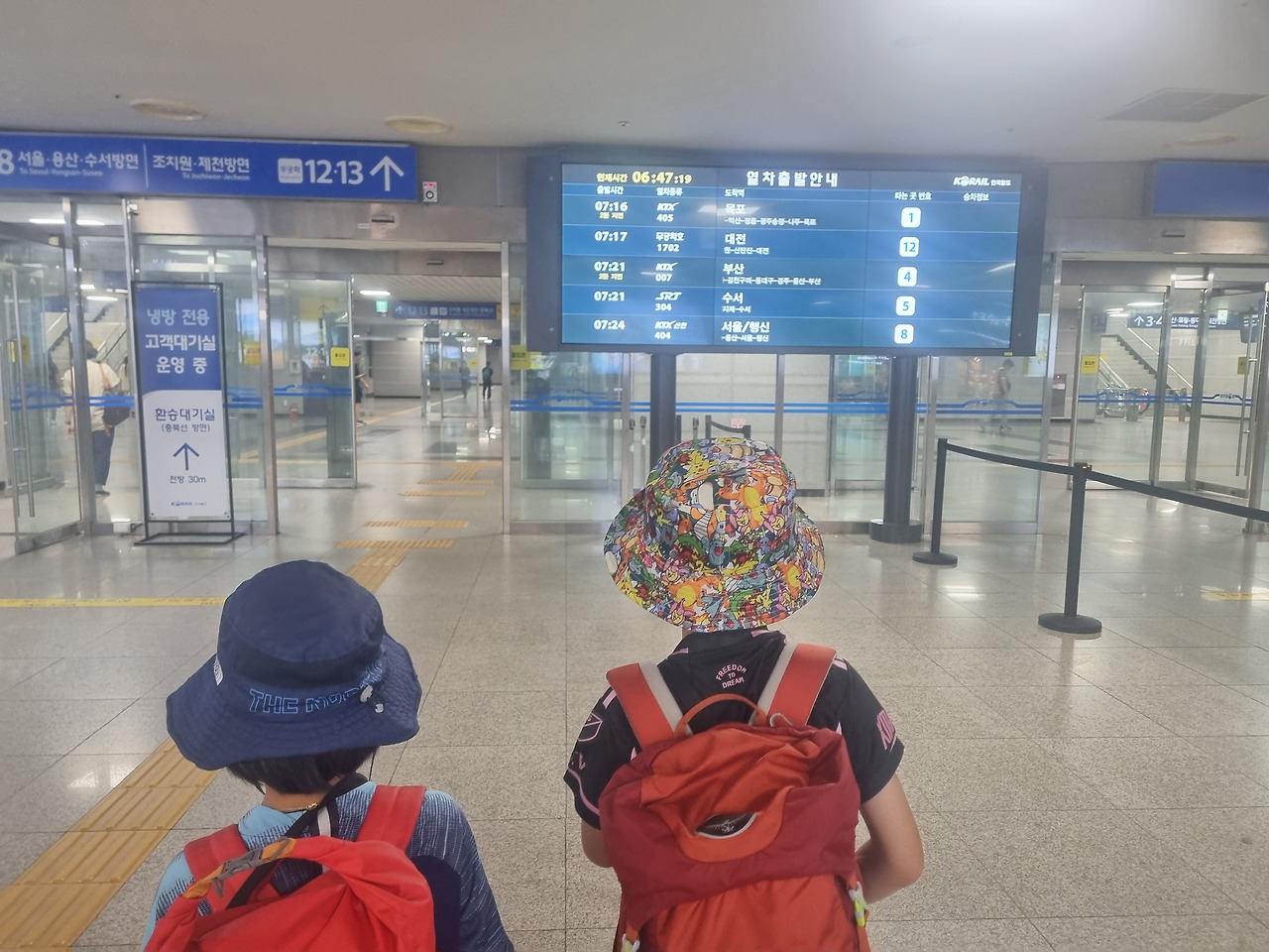 07시 17분 목포행 KTX 열차, 아이들은 기차역 전광판을 보고 먼저 기차 번호와 타는 곳 번호를 찾겠다고 난리가 났다. 가까운 대구에 갈 때도 기차를 잘 이용해 전광판을 찾아보고 스스로 찾아가는 재미가 쏠쏠한 모양이다.