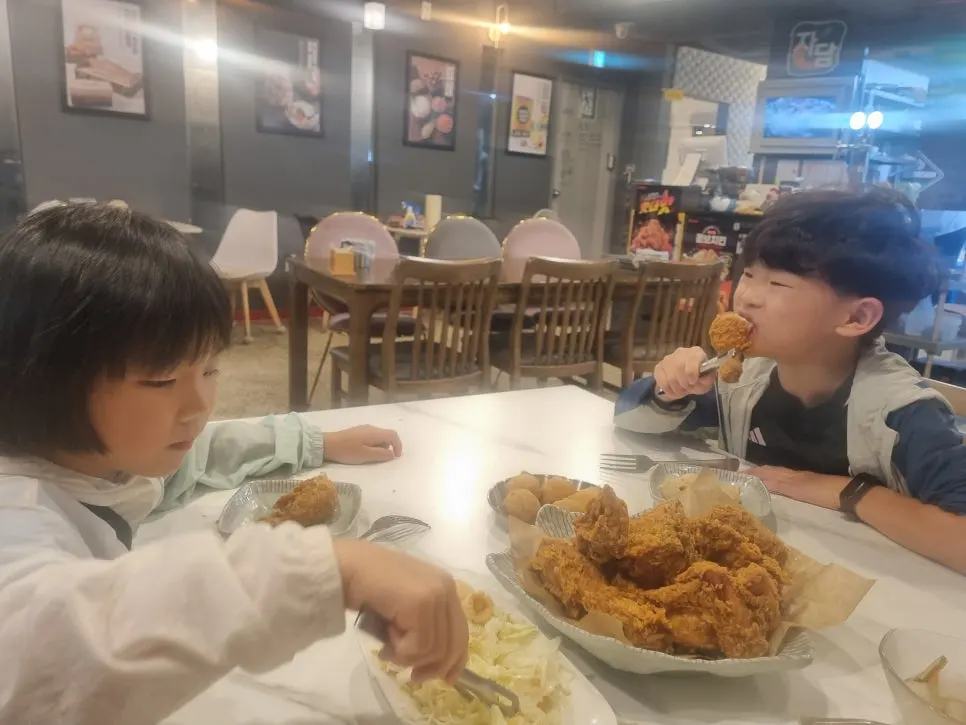 우리 집은 치킨을 배달시켜 먹었기에 아이들은 처음으로 치킨집에 방문해서 치킨을 먹게 되었다. 갓 조리된 치킨이 맛있었는지 앞으로는 우리 집에서도 자담치킨만 먹자고 한다.