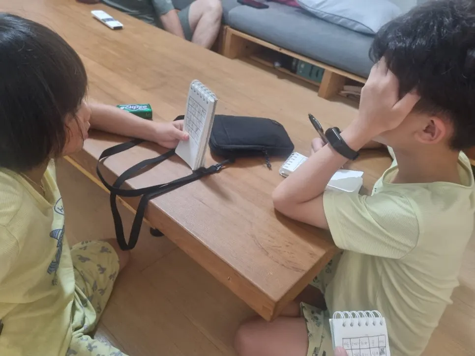 아이들은 수첩을 가지고 서로 빙고놀이를 하고 엄마와 약속했던 1일 1영어 과제도 끝냈다. 아빠는 목포에 도착해서 소금박물관까지 가는 버스 때문에 고민을 하고 있다.