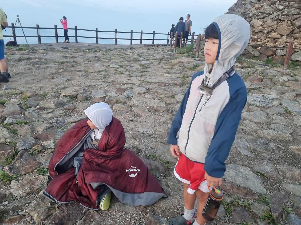 드디어 해가 솟았다. 수많은 사람들이 그 모습을 담기 위해 사진을 찍었다. 역광이었지만 아이들과 함께 사진을 남겼다. 멋진 풍광을 더 구경하고 싶은 욕심이 생겼지만 바람이 너무 세서 지체할 시간 없어 바로 하산을 하였다.