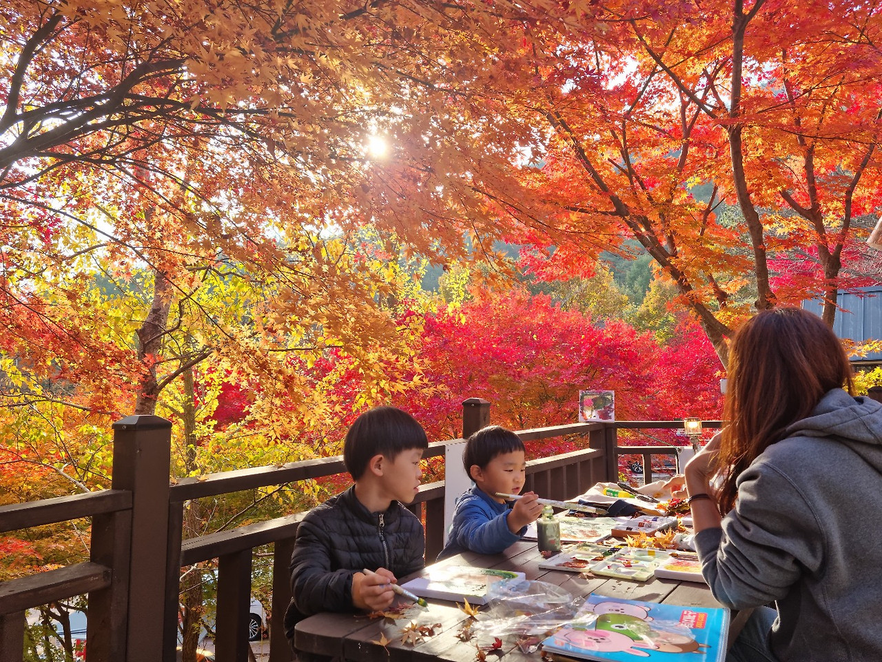 야영장으로 돌아와 아내가 챙겨 온 캔버스에 단풍 그림을 그렸다. 아직도 집안 책장 안에 자리를 꿰차고 있는 그림들이다. 점점 덧칠을 해 가며 진한 흙빛의 작품이 되긴 했지만, 그 그림만 보면 그때 10월의 단풍이 생각난다.