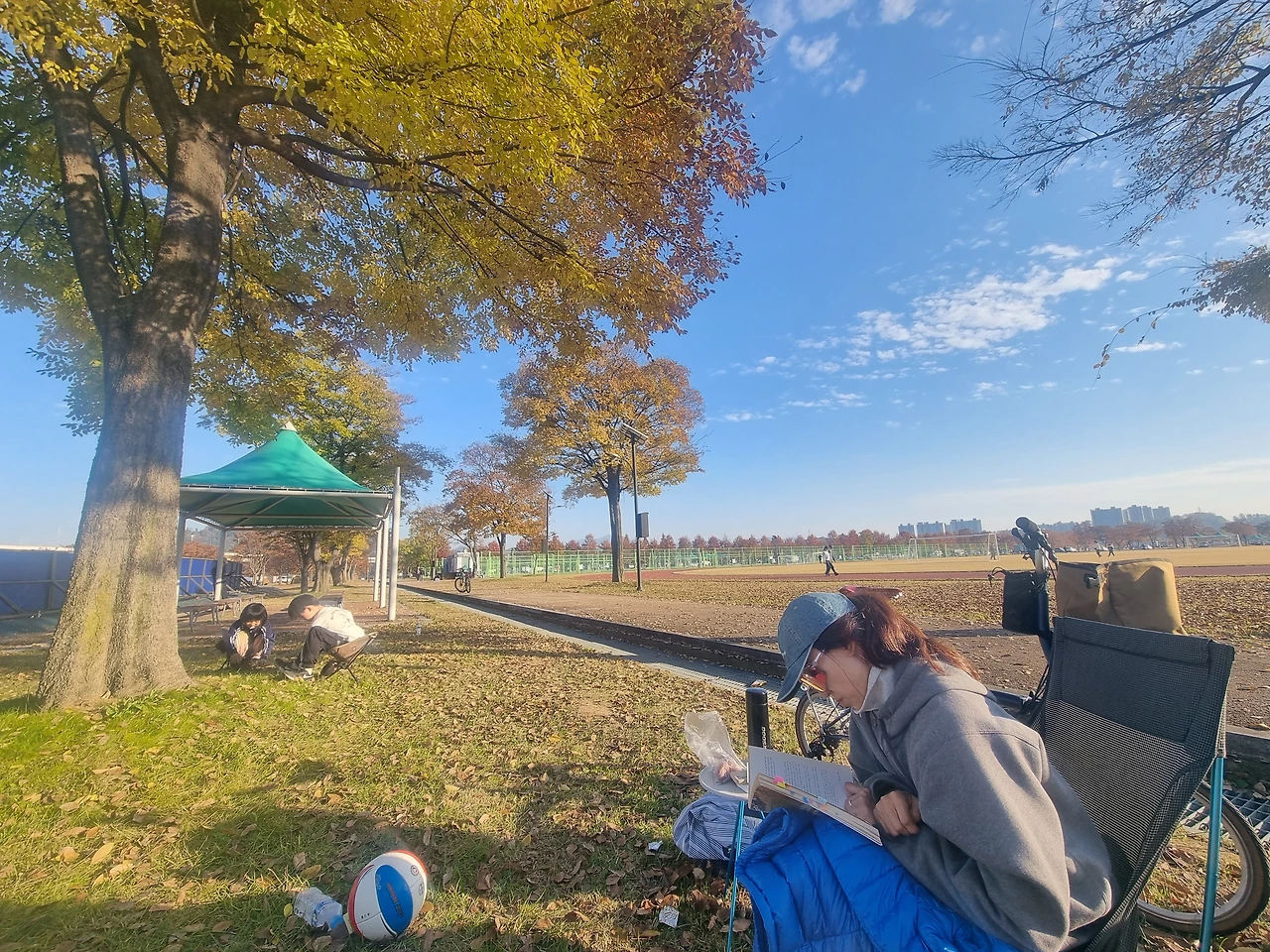 그저 공원에 나와 의자 하나 펴놓고, 책도 읽고 핸드폰도 하고, 아이들과 축구공 가지고 야구공 가지고 놀기 좋은 날씨다.