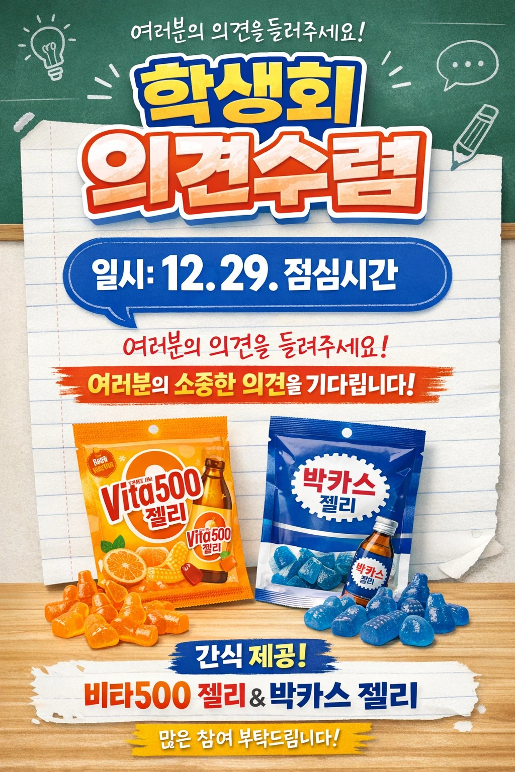 연말에 학생회 의견수렴 행사를 주관하게 되었다. 각 반마다 붙일 포스터 고민을 하다가 챗지피티에게 프로그램 개요 등 간단한 정보를 줬는데 너무나 놀랍게도 멋지게 만들어줬다.