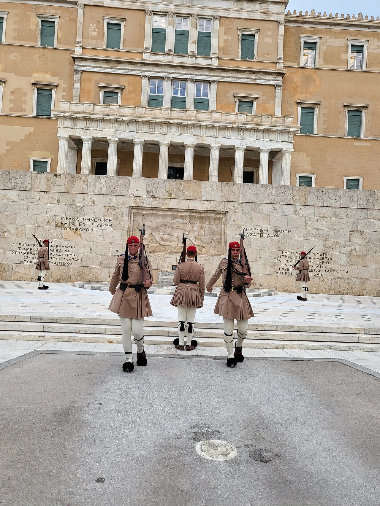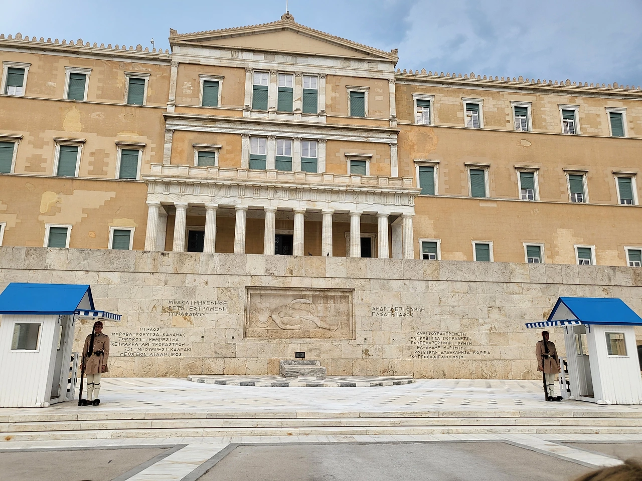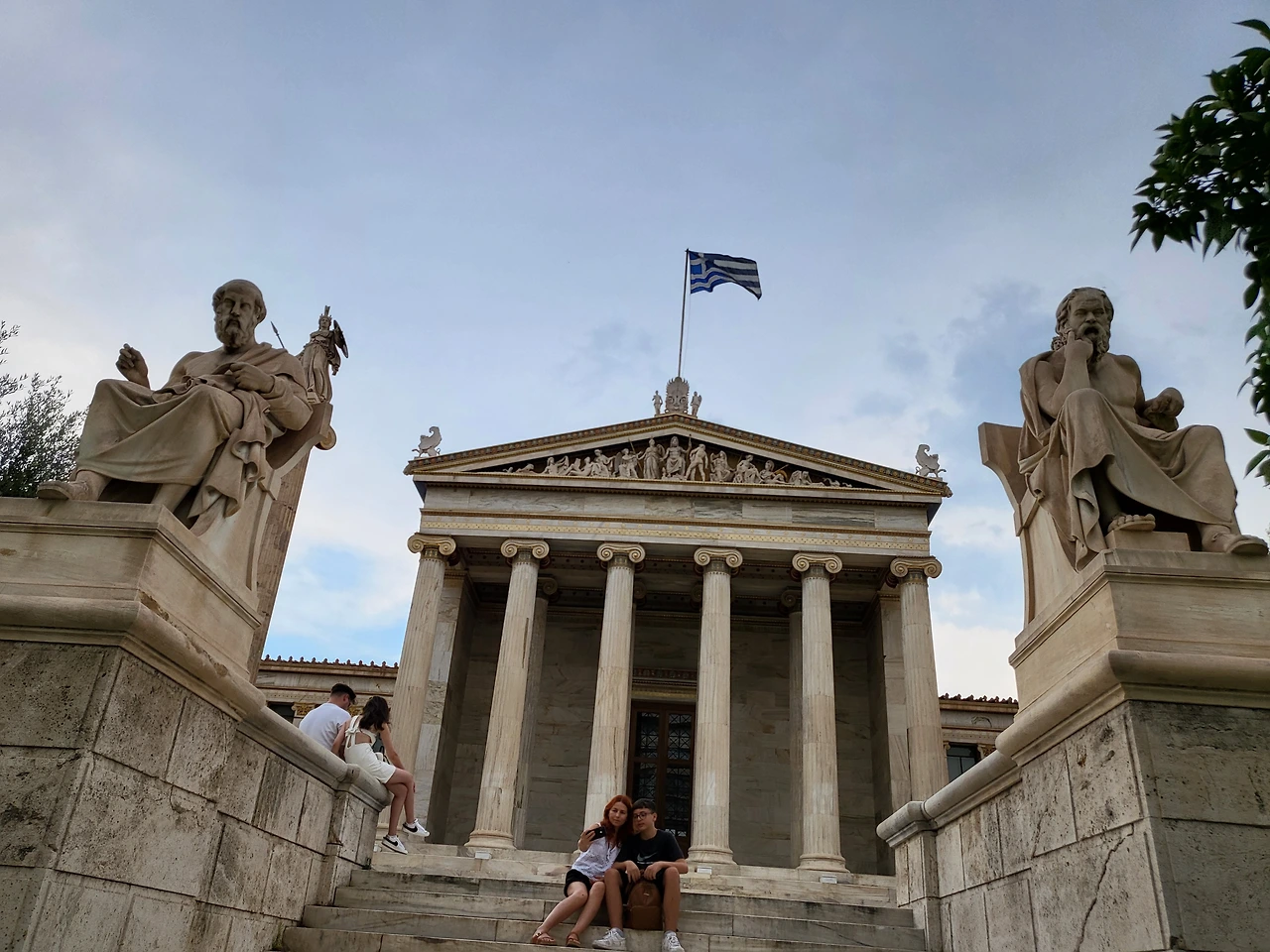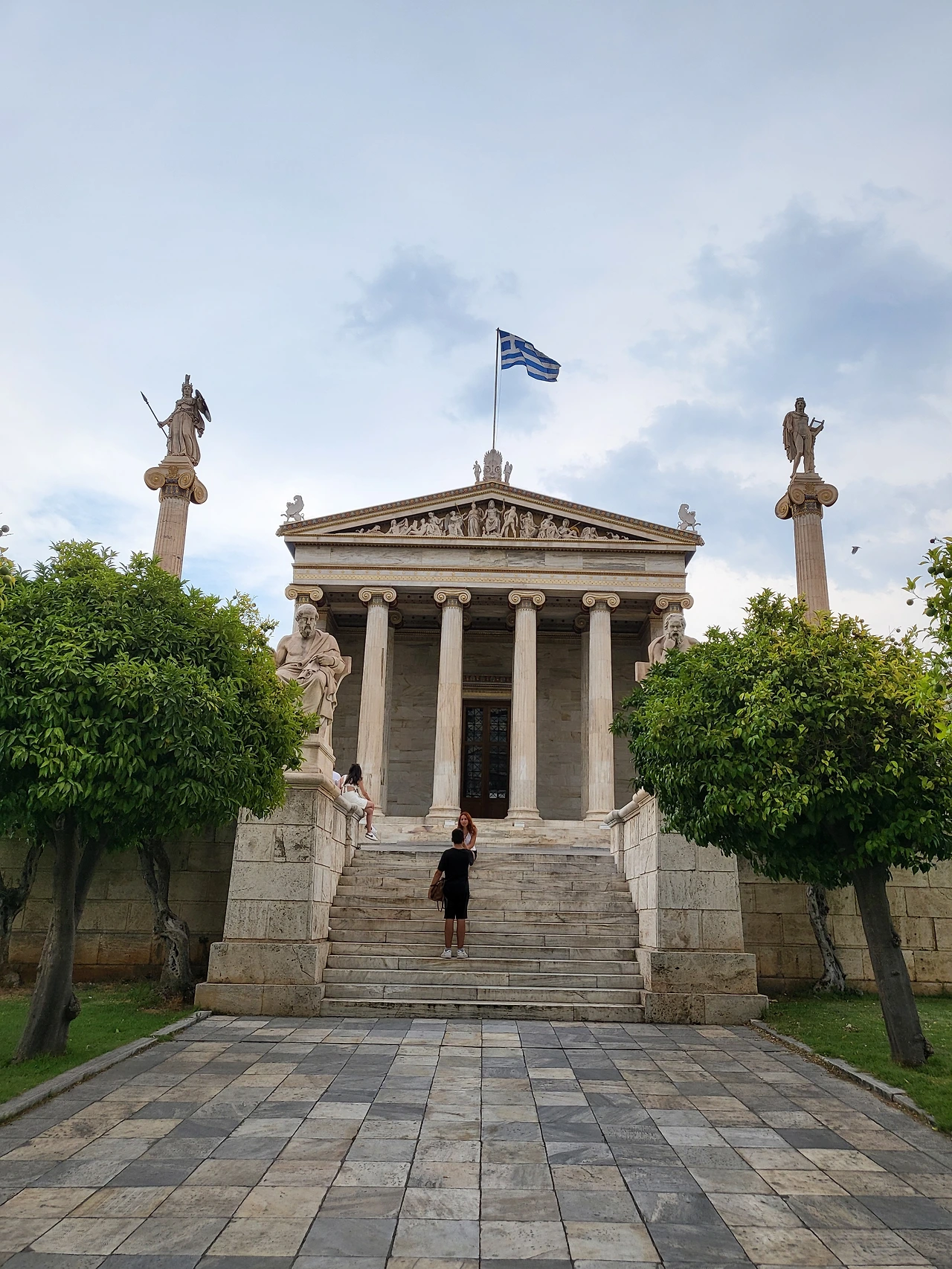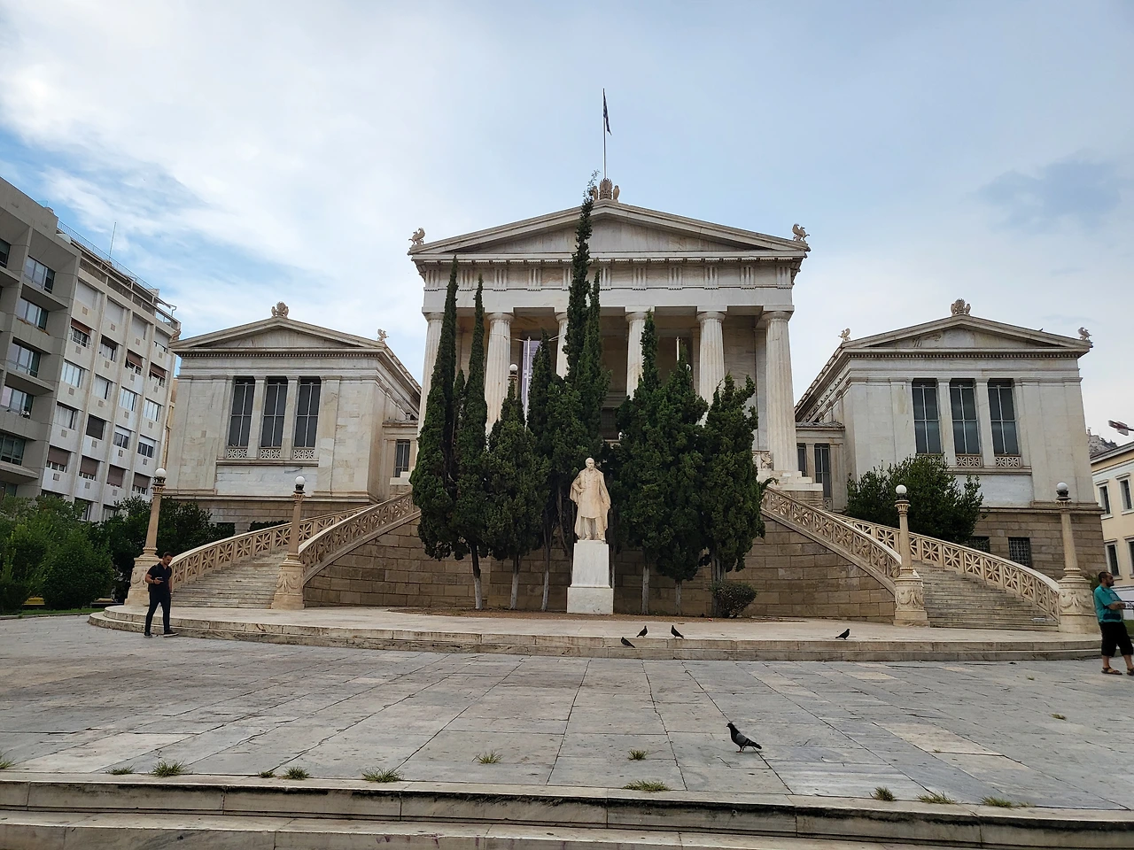 나는 종점까지 가게 되어있지만 신타그마 광장에서 내렸다. 아직 환한 시간인 데다가 신타그마 광장 주변엔 볼거리가 많다. 바로 볼 수 있었던 위병교대식은 시간이 좀 늦어서 한 시간 뒤에 보는 걸로 하고 발걸음을 아테네 학술원 쪽으로 옮겼다. 늦은 시간이라 들어갈 수는 없었지만 그 외관은 충분히 감상할 수 있다. 건물은 신전처럼 생겼는데 양쪽의 크고 높은 이오니아식 기둥에는 각각 지혜의 여신 아테나와 태양신 아폴론이 서 있다. 그들이 내려다보는 자리에는 각각 소크라테스와 플라톤이 앉아있다. 이곳은 아테네로 돌아오면 다시 가볼 것이다.