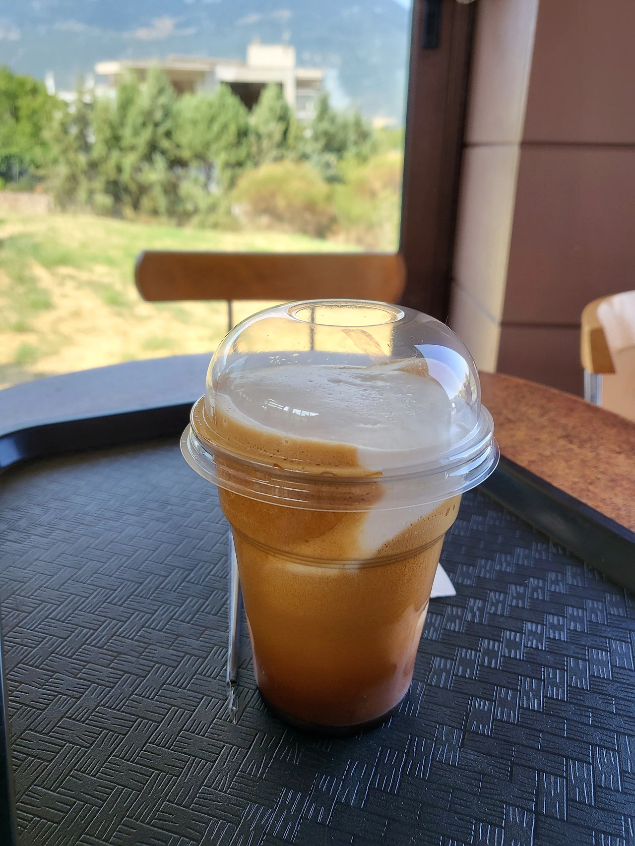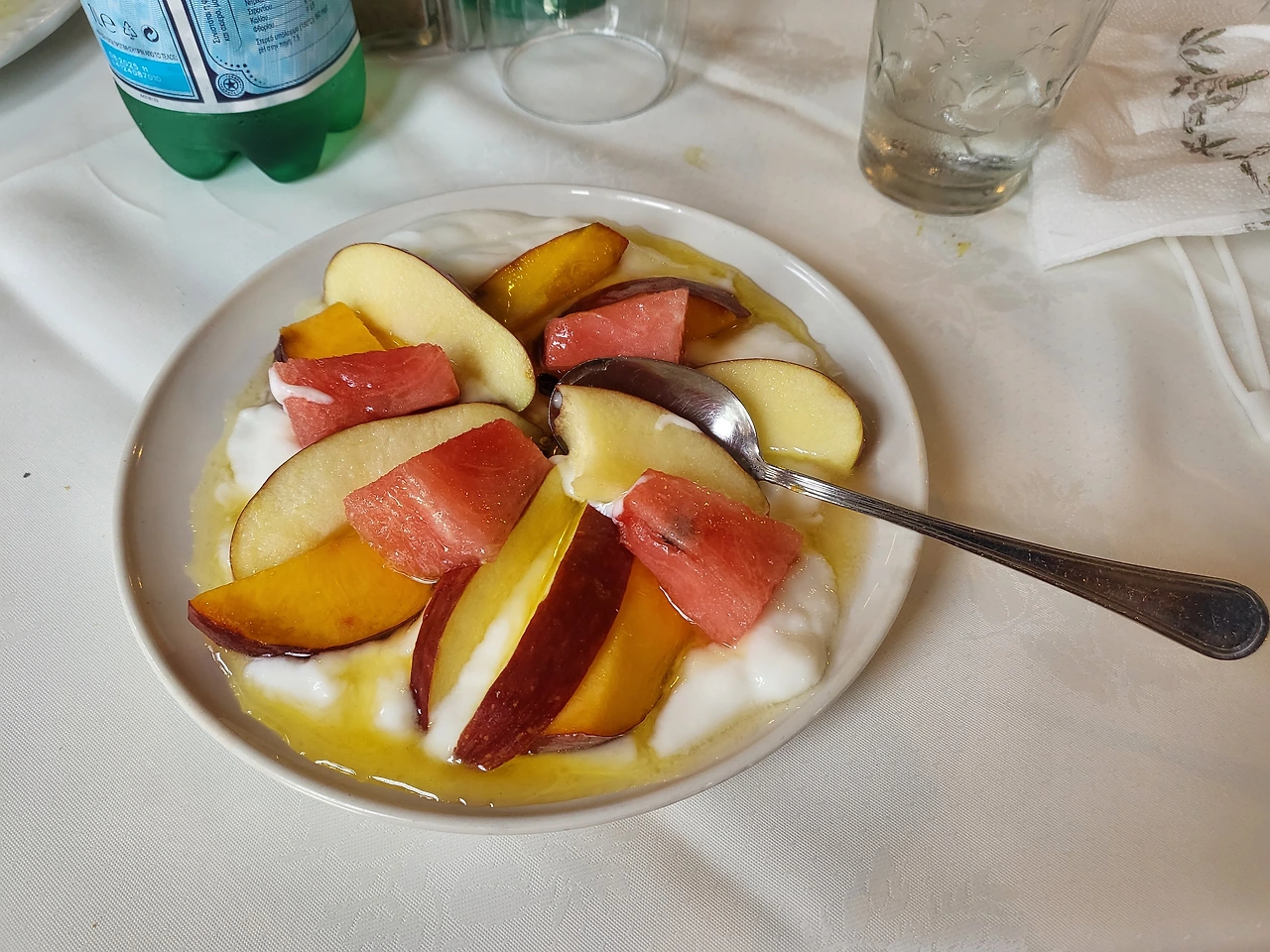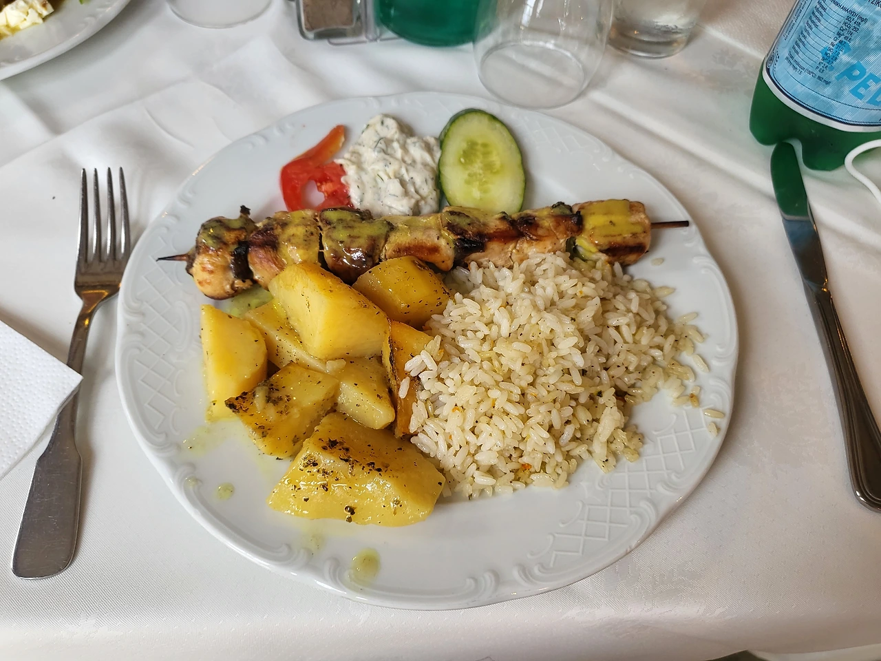 돌아오는 길에 점심 식사를 위한 레스토랑에 들렀다. 점심을 포함하지 않은 티켓을 구입했기에 이곳에서 내가 먹고 싶은 것을 시켜 먹었다. 치킨 수블라키, 과일과 꿀이 들어간 요구르트에 탄산수. 딱 기분 좋은 점심 식사였다.