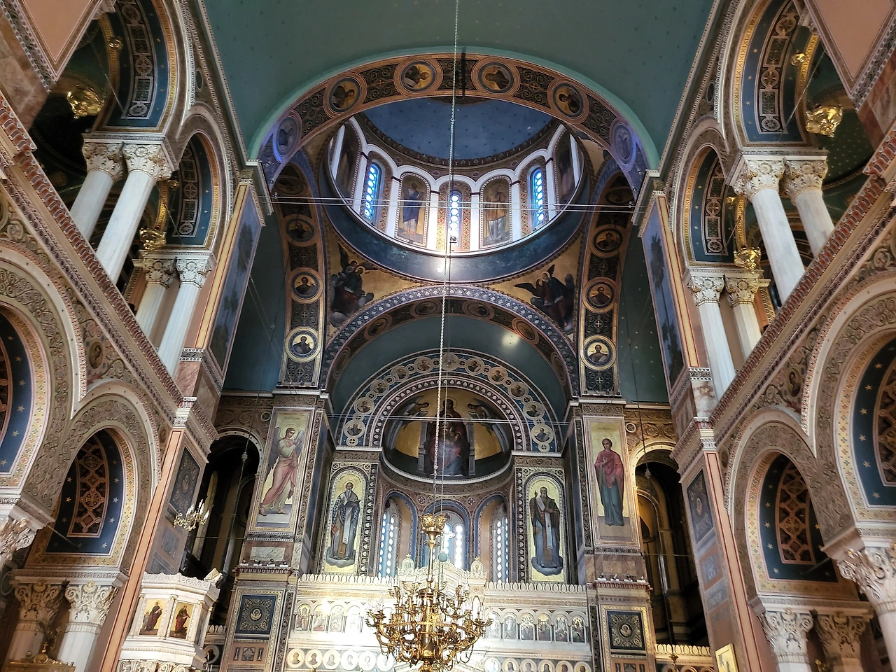 아테네 대성당이 눈앞에 펼쳐졌다. 그리스 정교회 성당이라 느낌이 조금 다르다. 외관도 그리고 실내도, 어딘가 조금 낯설었다. 그 낯선 느낌이 싫은 것이 아니라 흥미로웠다. 성당 앞 광장은 광택이 있는 석재를 깔아서인지 성당을 어슴푸레하게 반영하고 있었다.