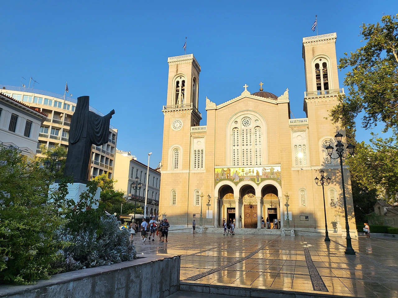 점차 기울어가는 햇살이지만 아직은 환하고 뜨거운 아테네 시내로 나왔다. 숙소 근처의 길이 조금 미끄러웠다. 일반 보도블록도 있지만 대리석처럼 보이는 매끄러운 돌들도 있어서 버켄스탁 샌들이 편하지는 않다. 사실 경사가 조금 심했던 작은 길에서 미끄러져 넘어졌다. 순식간에, 눈길에 슬라이딩하듯이 넘어졌는데 아픈 것보다야 쑥스러움이 가득. 다행히 지나가는 이는 많이 없는 곳이었다. 내일 델피 투어 모임 장소를 확인하고는 다시 아크로폴리스역 쪽으로 나왔다. 이 지역은 사람들이 부산히 다니는 관광 중심지이다. 보행자 거리를 가득 채운 사람들, 그 가운데 일정 부분을 차지한 음식점 야외석에 앉아 식사를 기다리는 사람들이 저마다 각자의 아테네를 즐기고 있었다. 사람들이 가는 방향을 따라 걷다 보니 유적지도 있고 성당도 있고. 걷는 재미가 쏠쏠하다.