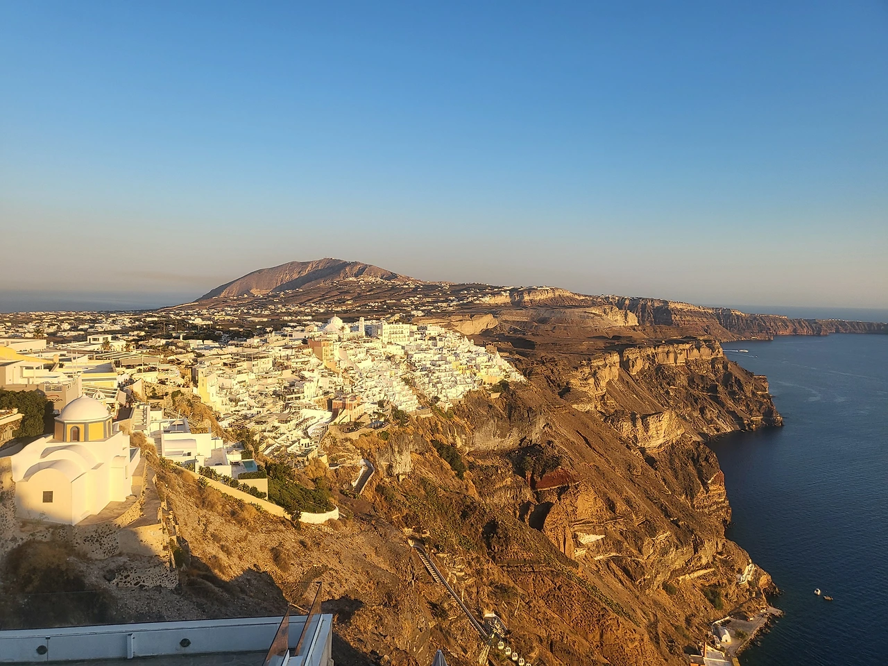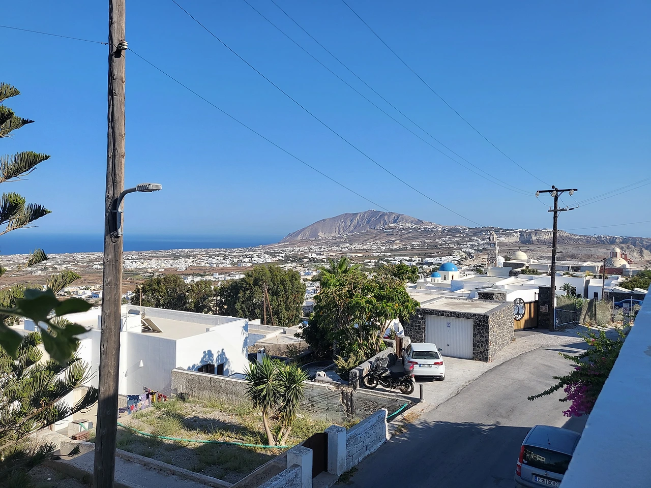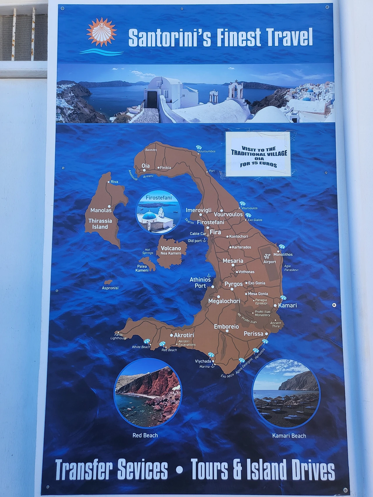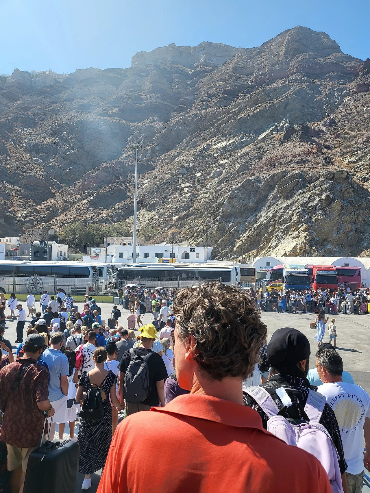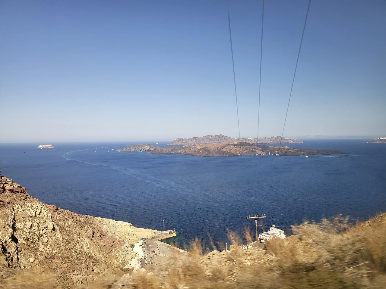 항구에는 렌터카 직원, 택시 호객꾼, 버스 호객꾼들이 손님들을 끌기 위해 곳곳에서 소리치고 있었다. 일반버스를 타면 가장 저렴하게 갈 수 있지만, 여행가방의 무게가 만만치 않아서 나는 10유로의 쉐어링 버스를 탔다. 숙소가 피라 마을에 있어서 아무 생각 없이 피라 중심지에 내리면 된다고 생각했다. 산토리니는 신항구와 구항구로 나뉘는데, 구항구는 산토리니 부근 투어 크루즈들이 사용하는 편이고 내가 탄 페리와 같은 섬과 섬들이나 내륙으로 가는 교통 편들은 신항구를 사용한다. 구불구불한 길을 따라 버스는 피라 마을을 향해 떠났다.