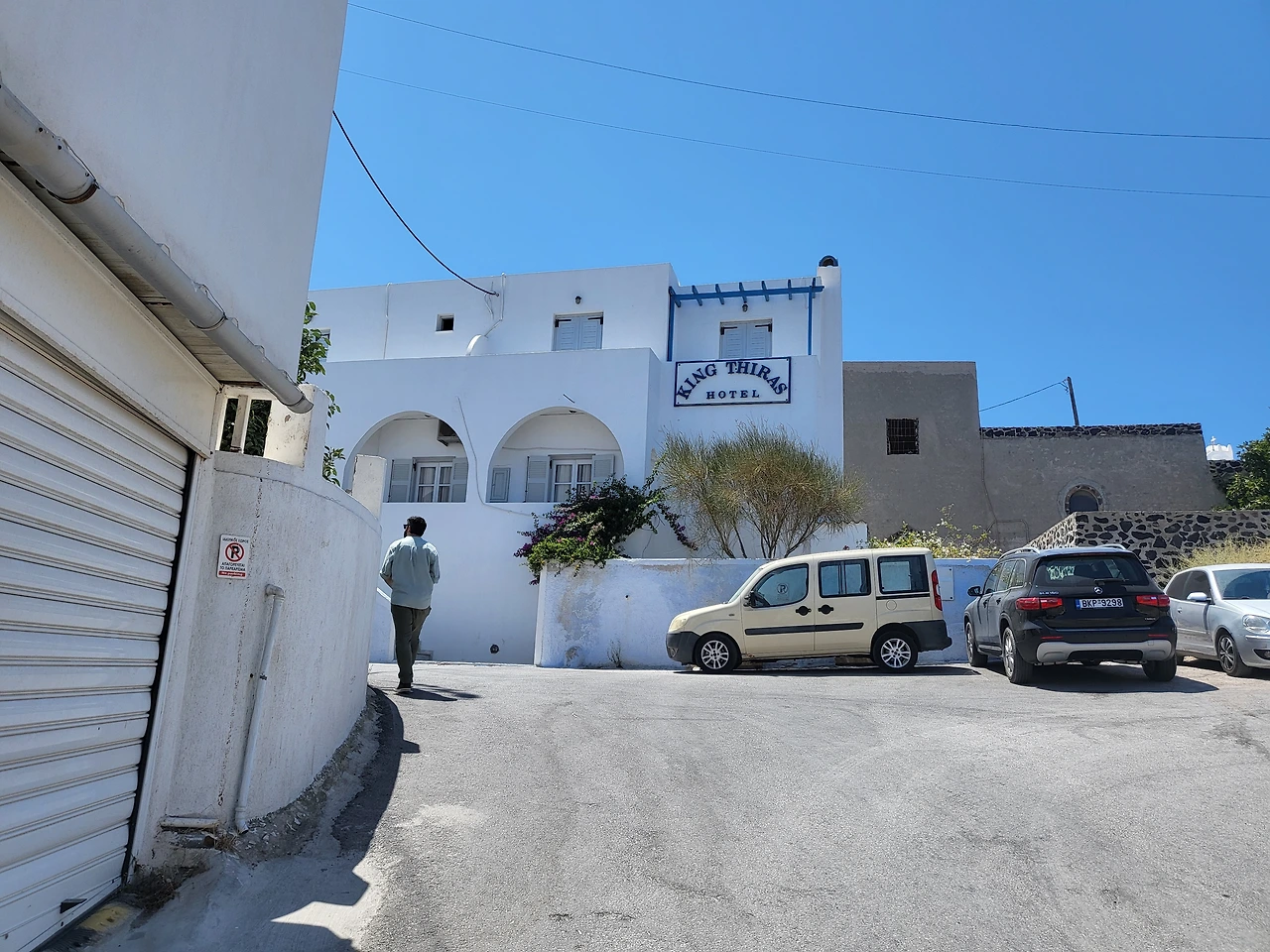 이윽고 피라 중심지에 도달했다고, 버스 기사가 짐을 내려주었다. 나중에 보니 그곳은 확실히 피라 마을 중심지였다. 단지 내 숙소가 그곳에서 계단과 언덕길을 엄청나게 올라가야 하는, 높은 곳에 위치했다는 것이 문제였지. 피라 마을의 좁은 골목과 계단을, 무거운 여행가방을 끌고 또 때로는 들어 올리고 하며 구글맵을 보며 올랐다. 1/3쯤 왔을 때 욕 나올 뻔했다. 하지만 결국 이 무거운 짐을 들고 온 것은 나 자신이 아니던가. 땀이 비 오듯 흐르고 짜증은 있는 대로 났지만, 어쩔 수 없다. 드디어 저 언덕배기에 내 숙소 이름이 보였다. 그나마 다행이다. 천신만고 끝에 숙소 도착. 호텔 리셉션에는 나이 지긋한 그리스인 직원이 기다리고 있었다. 올라오는 게 너무 힘들었다는 내 말에, 그는 산토리니가 원래 이런 곳이라며 그냥 웃는다. 내 여행가방을 들고 그가 안내한 내방은 동쪽에 자그마한 테라스가 있는 트윈룸이었다. 올라오는 동안 너무 힘들었고 아직 햇살이 따가워서 쉬었다 나가기로 했다.