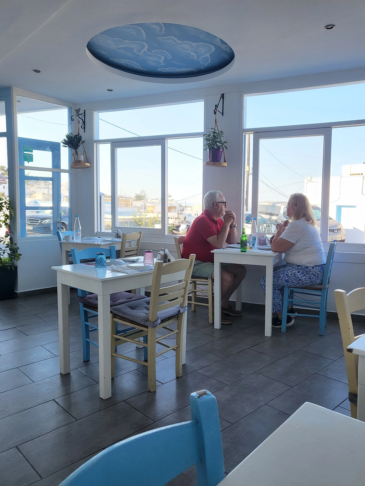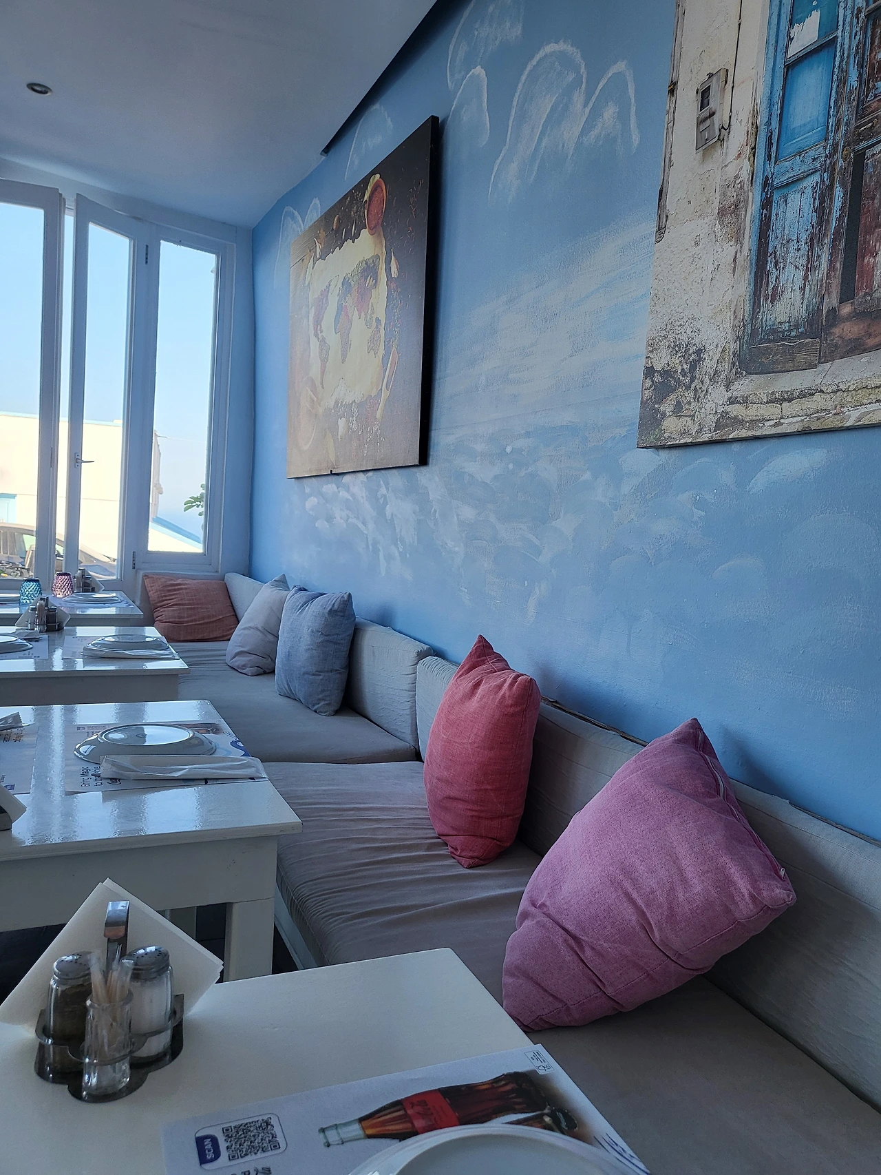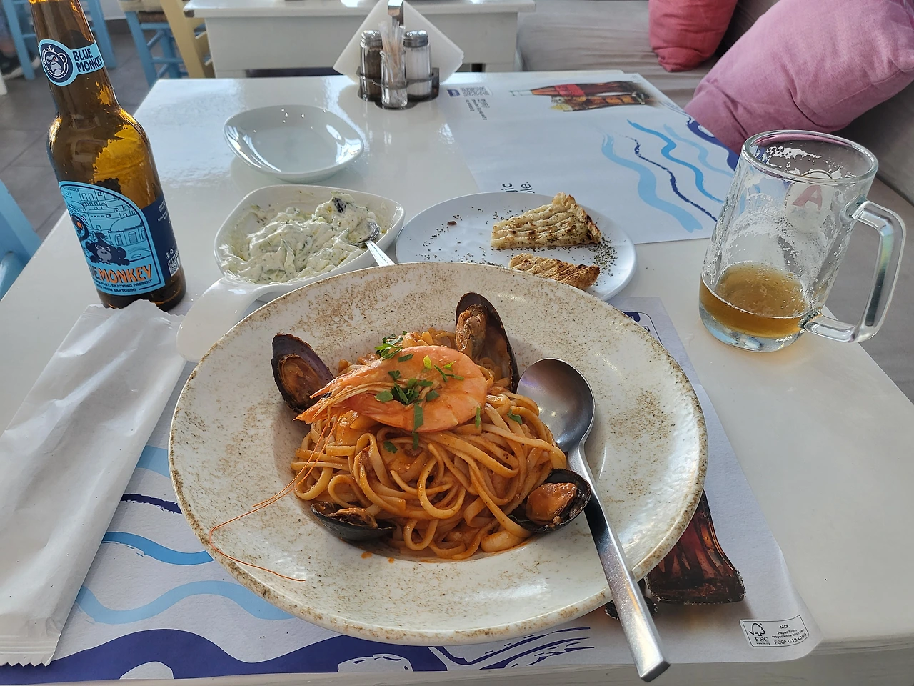 오후 늦은 시간이지만 오늘 식사를 한 적이 없어서 구글맵을 펼쳤다. 근처에 평점이 괜찮은 식당이 있었는데, 그 이름이 No Name이었다. 일단은 식사를 해야 하니 그곳으로 찾아갔다. 해산물 파스타와 피타빵, 차지키 소스에 블루 멍키(Blue Monkey) 맥주. 블루 멍키와 옐로 동키(Yellow Donkey)는 산토리니 지역 맥주라고 한다. 크레타를 출발하기 전, 호텔 조식 이후 첫 식사다. 파스타는 약간 짰지만 나쁘지는 않았다.