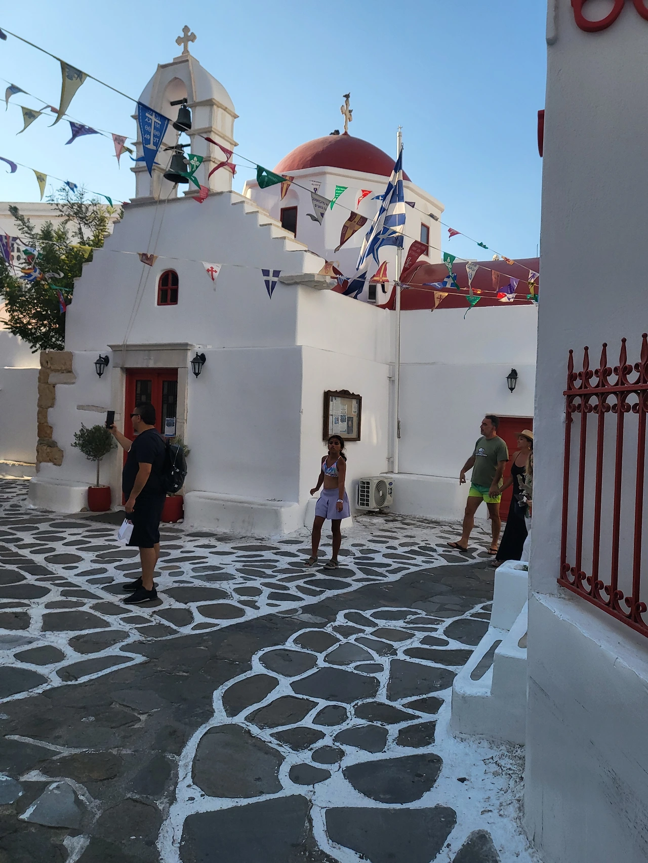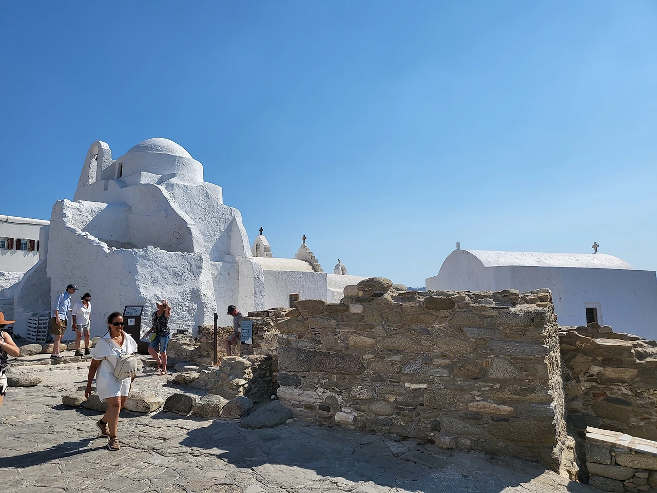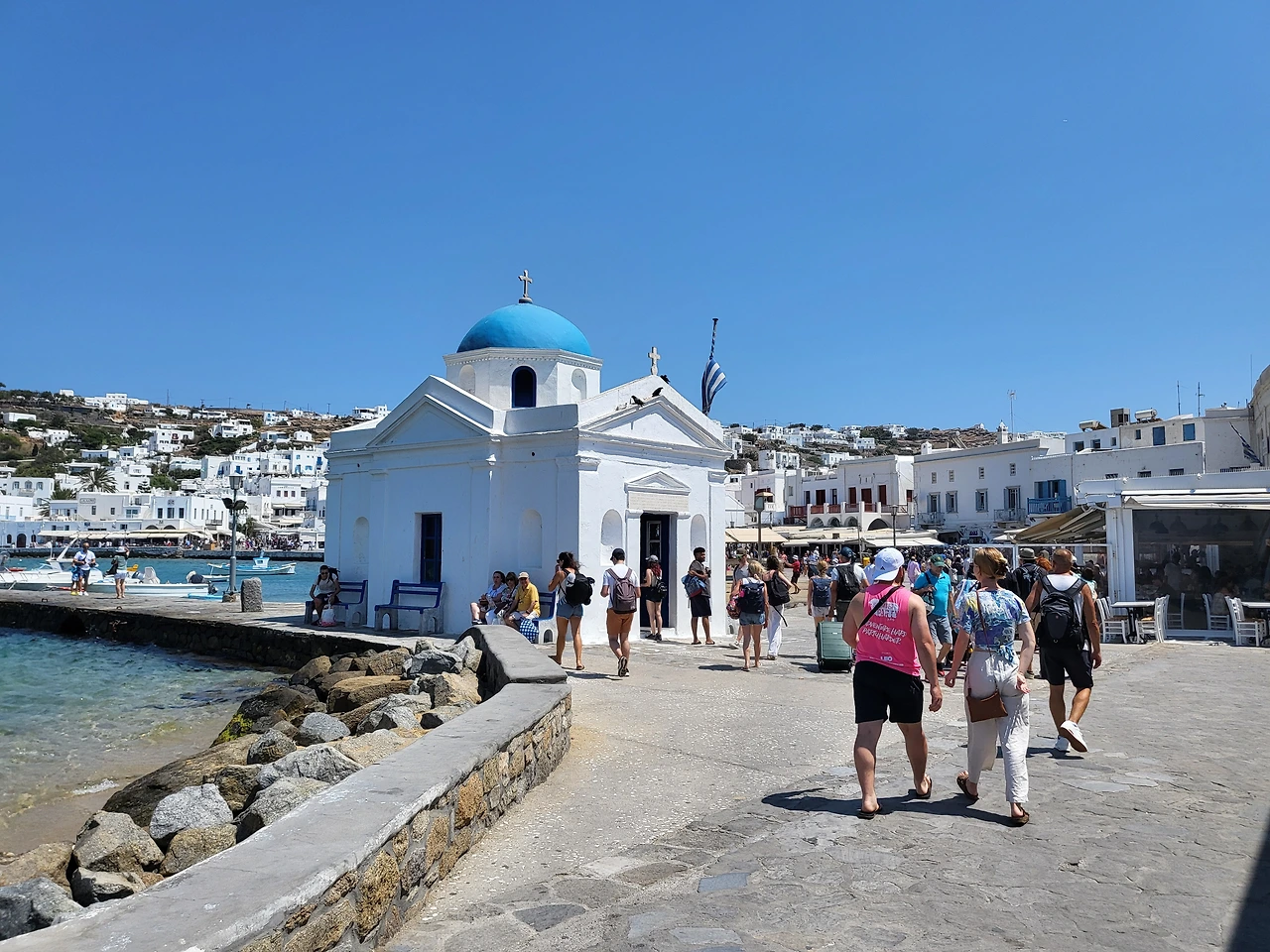 이제 미코노스 구시가지 탐방. 항구 입구에 있는 푸른 돔이 있는 교회의 내부에도 들어가 보고, 구시가지 유적지의 하얀 교회를 지나 보았고, 어쩌다 보니 리틀 베네치아도 지나고 있었다. 저 언덕 위로 미코노스의 풍차들이 보였다.