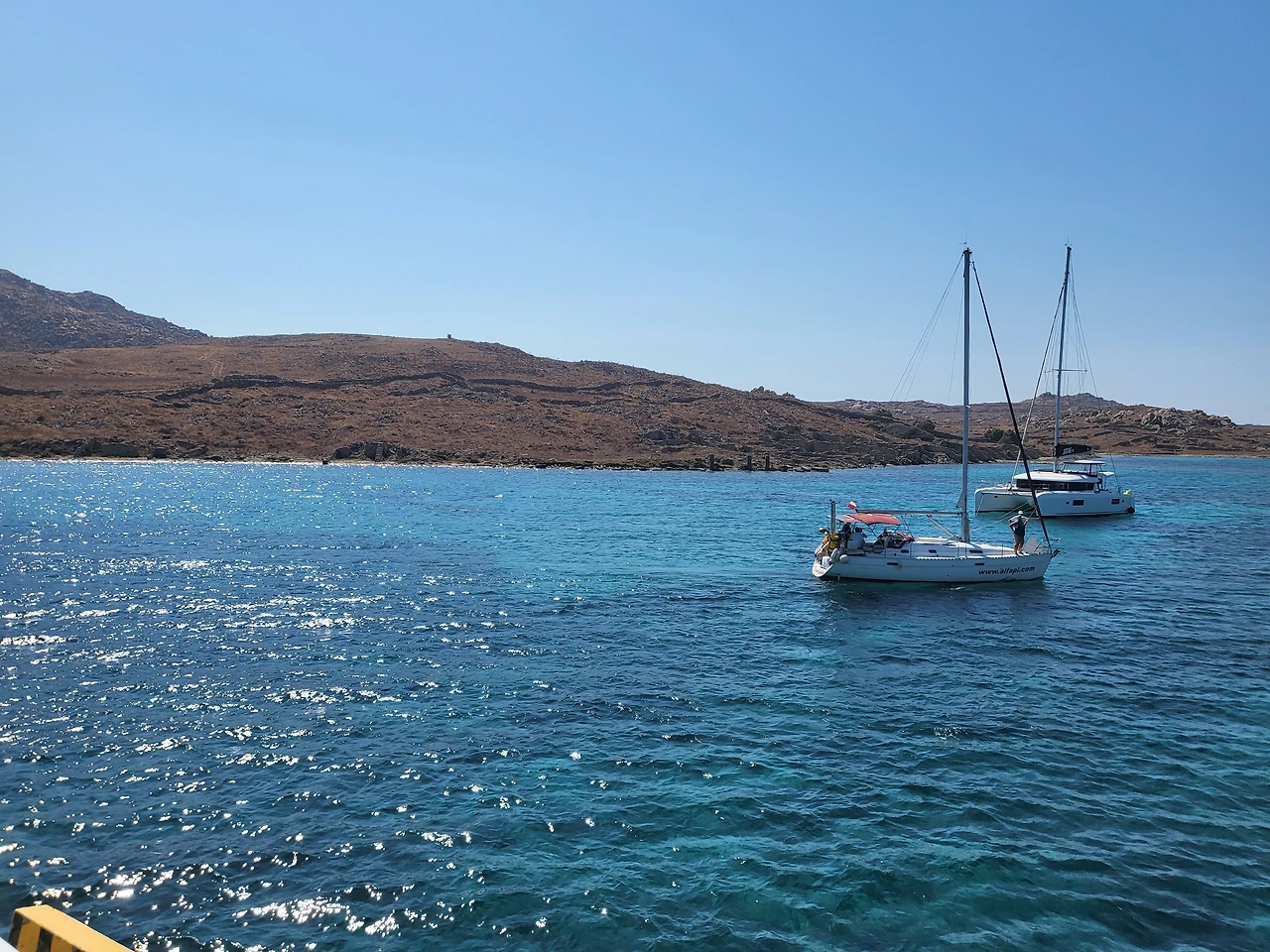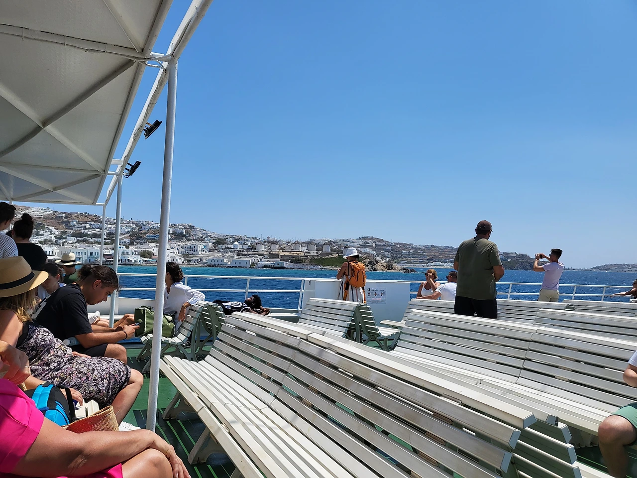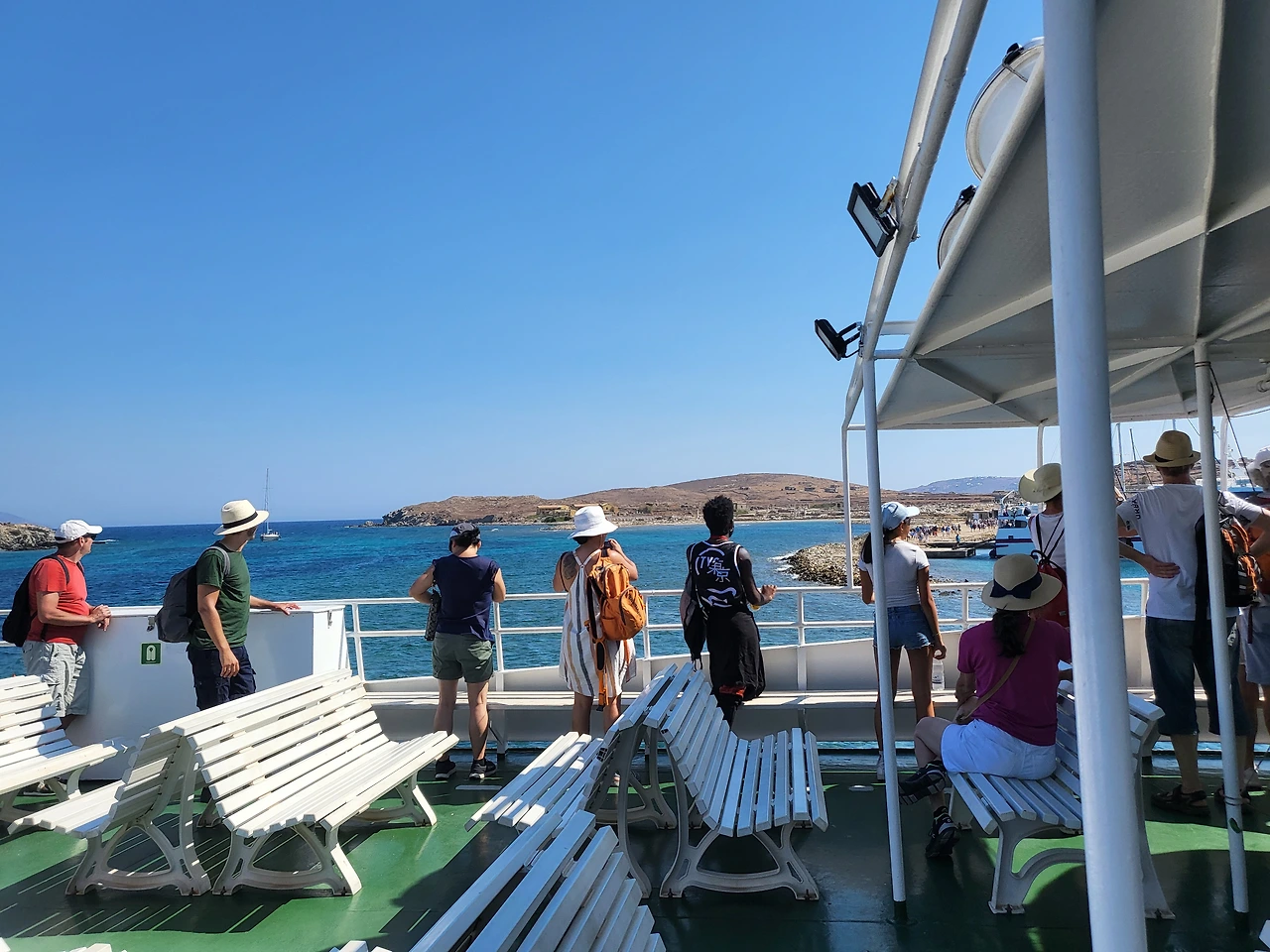 배를 타니 이미 여러 사람들이 승선해 있었다. 그늘 진 곳에 자리 잡고 앉아 배가 출발하기를 기다렸다. 이윽고 배가 천천히 출발했다. 기분 좋고 서늘한 바람을 맞으며 배는 델로스 섬으로 향했다.