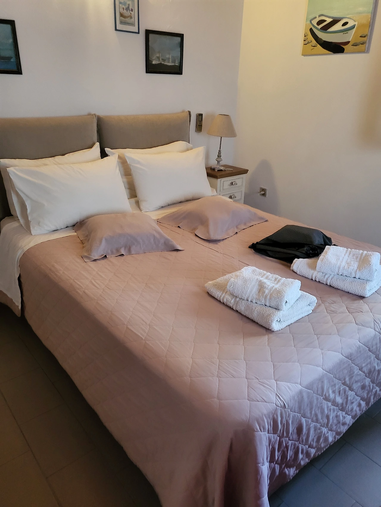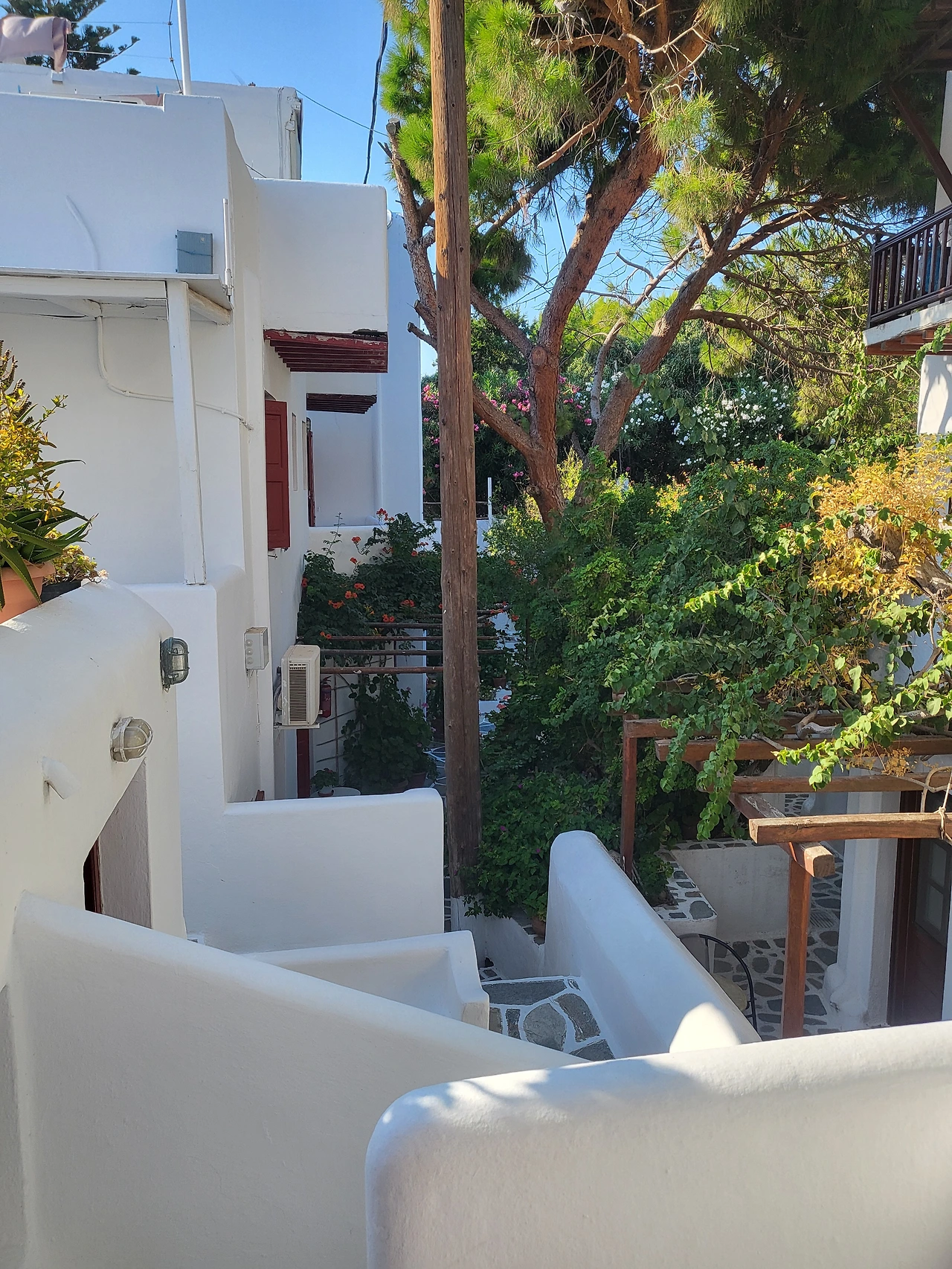 배에서 내려 구글맵을 켜고 숙소를 찾아간다. 골목골목을 몇 번 헤맨 끝에 숙소 이름이 쓰여진 조그마한 간판을 찾았다. 그러나 체크인은 그 부근 호텔에서 하게 되어 있었고 내가 두리번거리니 호텔 직원인 듯한 분이 말을 걸었다. 그녀의 도움으로 체크인을 하고 안내받은 숙소는 작은 간이 부엌이 있는 방이었다. 골목길 끝에 위치한 이 숙소는 공동정원이 있는 미코노스의 아파트형 숙소. 정원이 예쁘다.