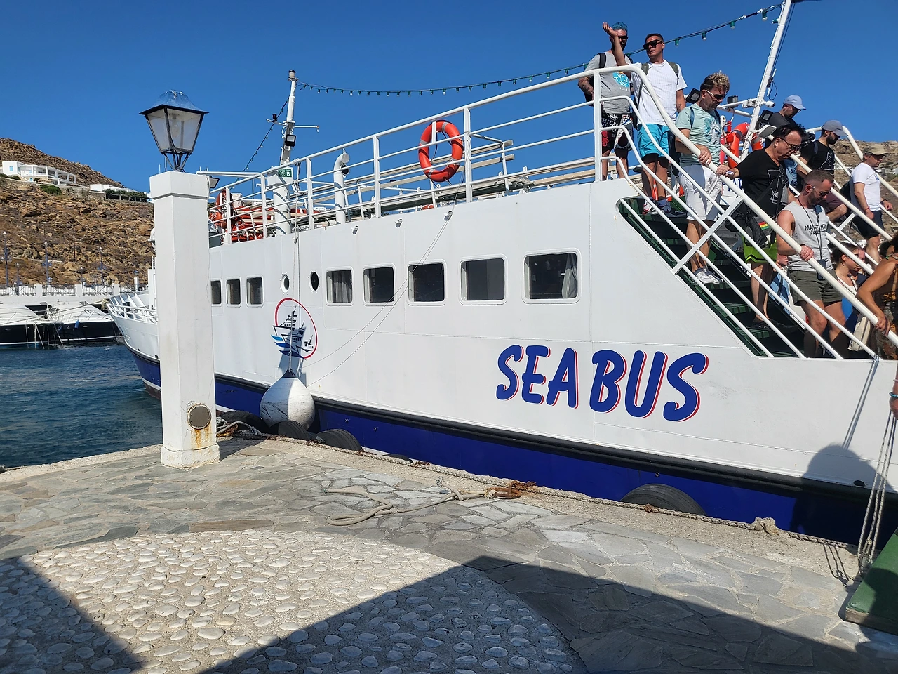 페리가 도착한 곳은 신항구이고 숙소와 예쁜 골목, 풍차는 모두 구시가지에 있다. 신항구에서 구시가지로 가는 교통수단은 Sea bus. 배를 타고 구시가지 중심인 호라(Chora)로 간다. 교통비는 편도 2유로. 종점에서 내리기 때문에 내리라 할 때까지 있으면 된다. 호라까지는 15분 정도 걸린다.