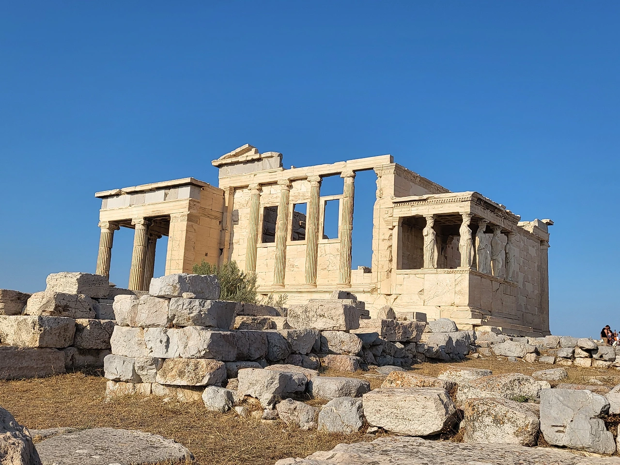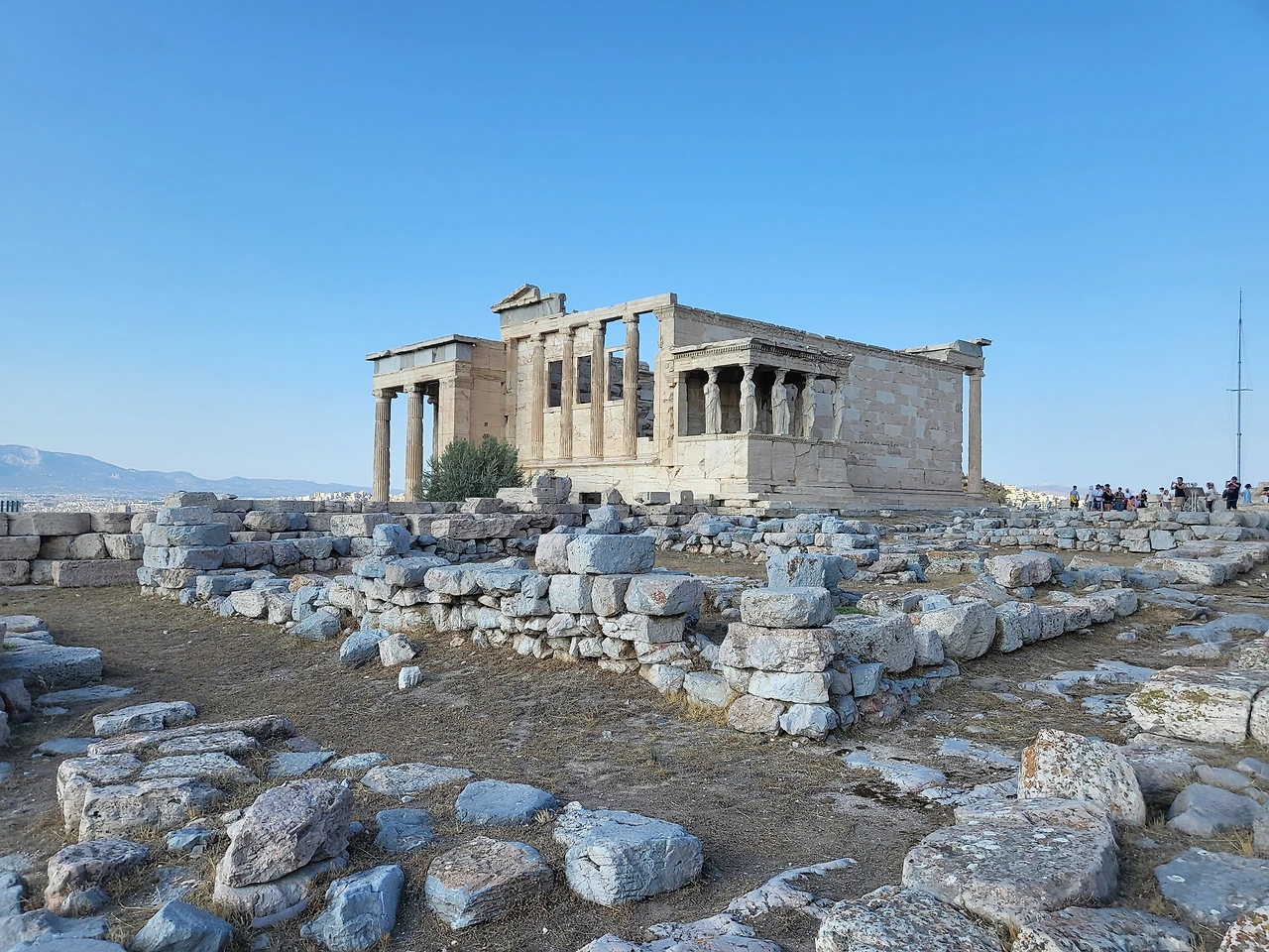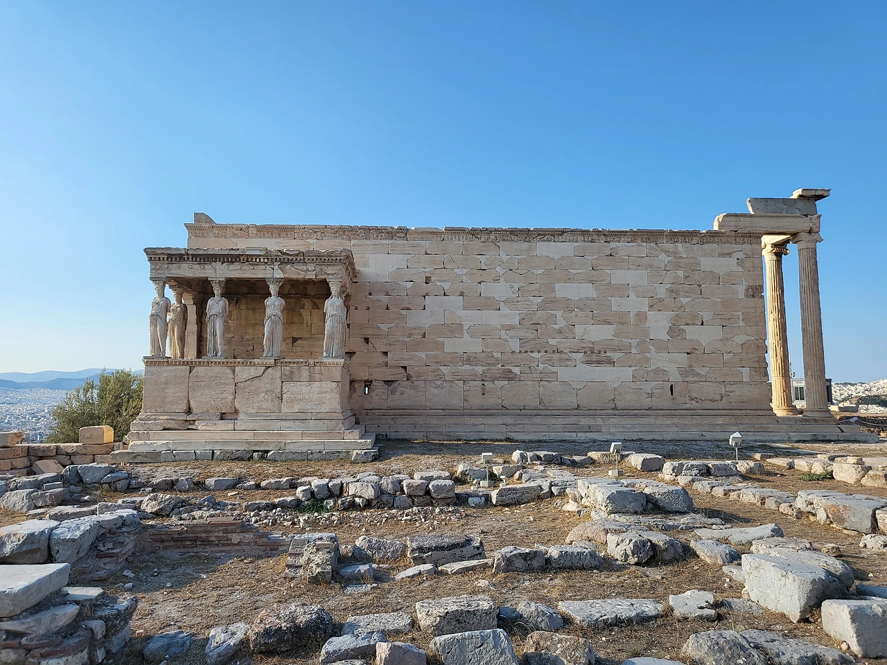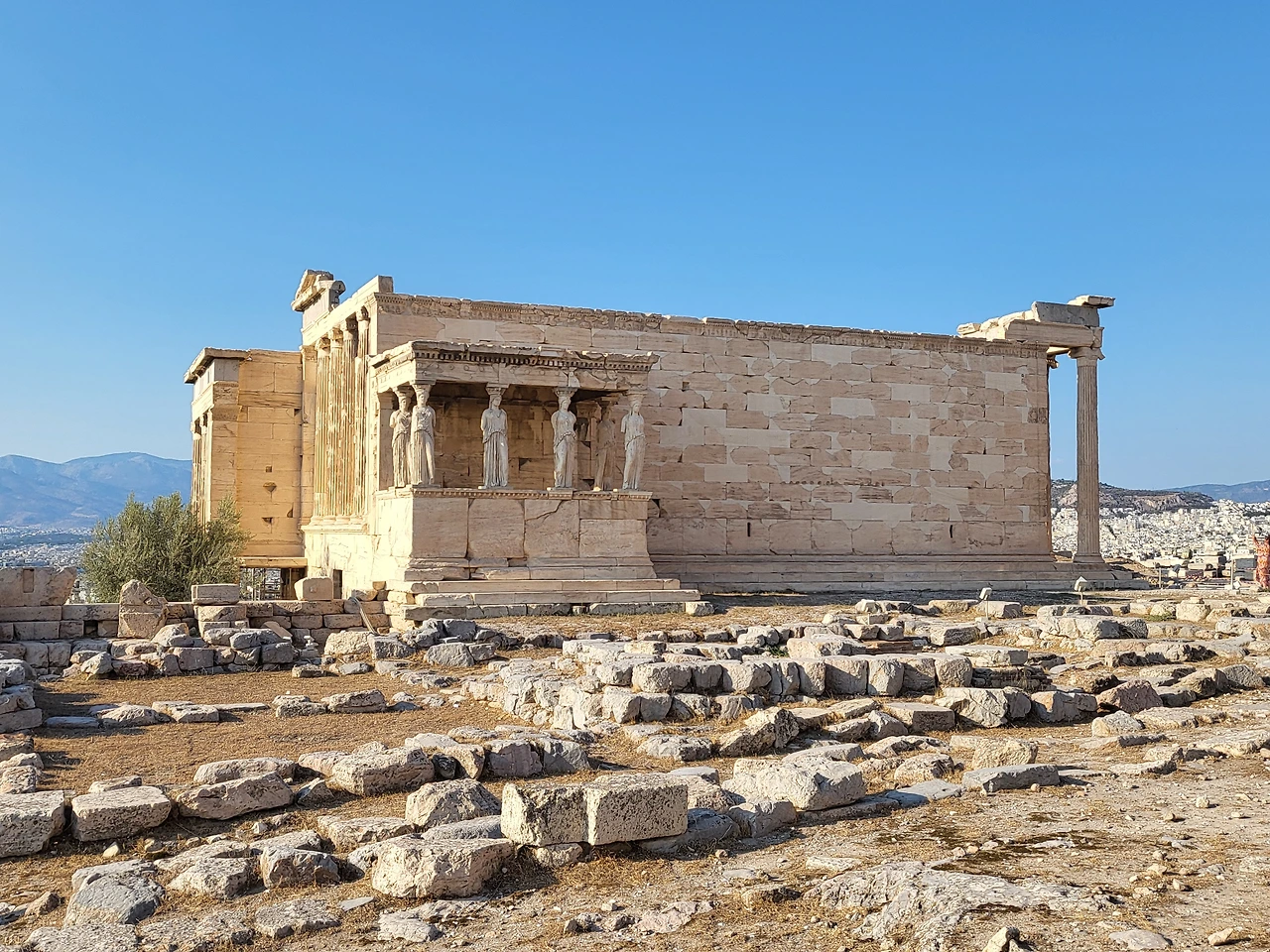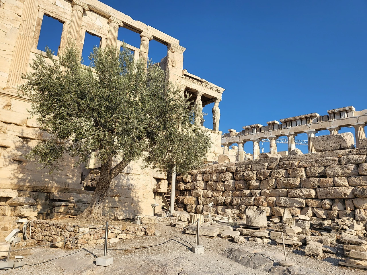 파르테논 신전의 왼편에는 여인들이 기둥이 되어 지붕의 일부를 떠받치는 이오니아 양식의 신전 에렉테이온이 서 있다. 에렉테이온 신전의 기둥을 받치는 여인상 석주는 카리아티드라고 불리며, 이 진품 중 4개는 신 아크로폴리스 박물관에 있고 하나는 수장고에 있으며, 나머지 하나는 엘긴 대리석의 일부로 유출되어 영국 박물관에 소장되어 있다. 에렉테이온 신전 앞에는 올리브 나무가 있는데, 원래 이곳에는 아테네 여신이 아테네 사람들에게 선물로 준 그리스 최초의 올리브나무가 있었다고 한다. 이 나무는 최초의 나무가 불탄 이후에 자라난 나무라고 하니, 여전히 여신의 선물이라 할 수 있을 것이다.