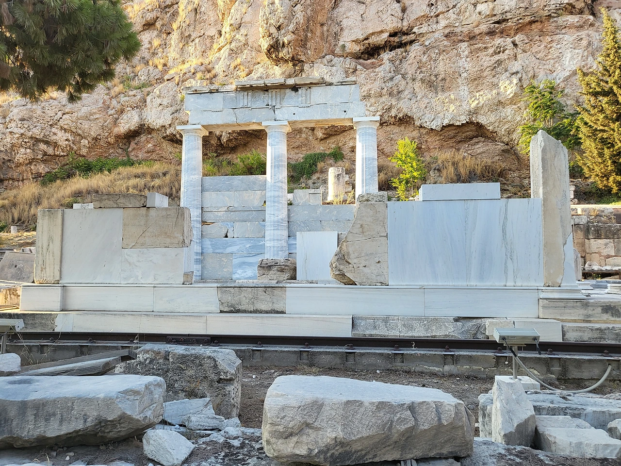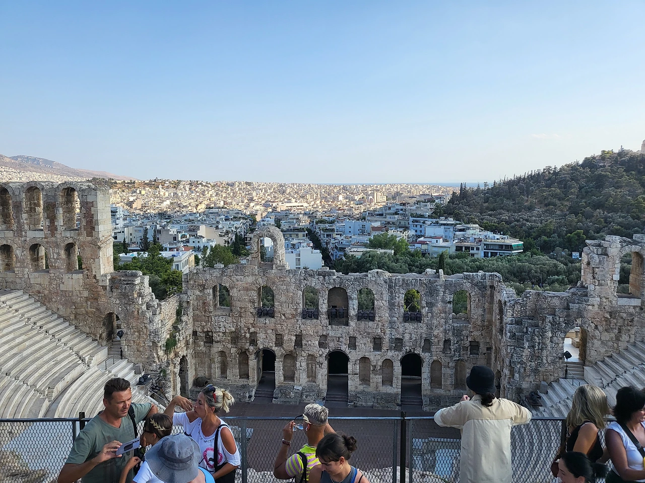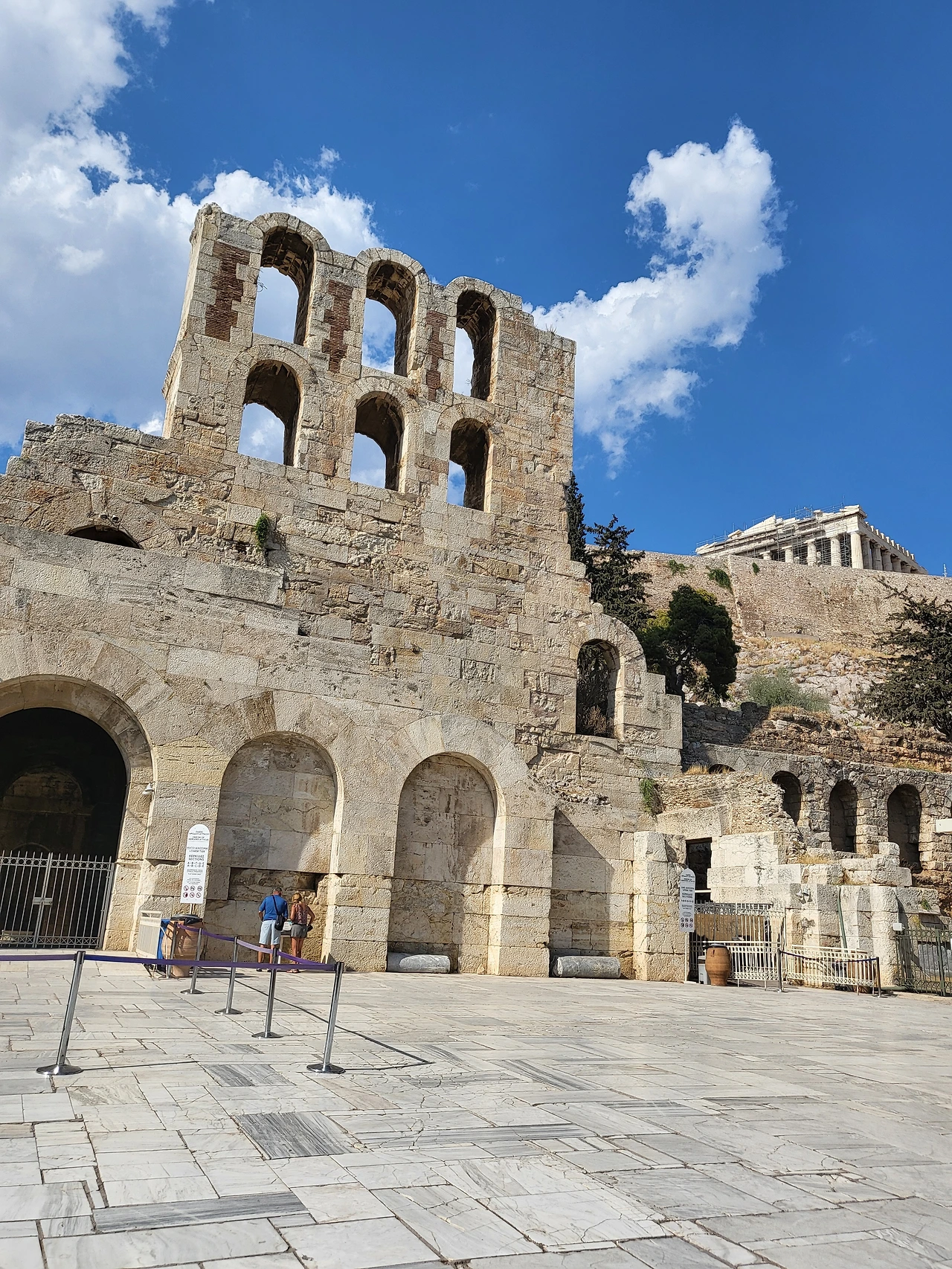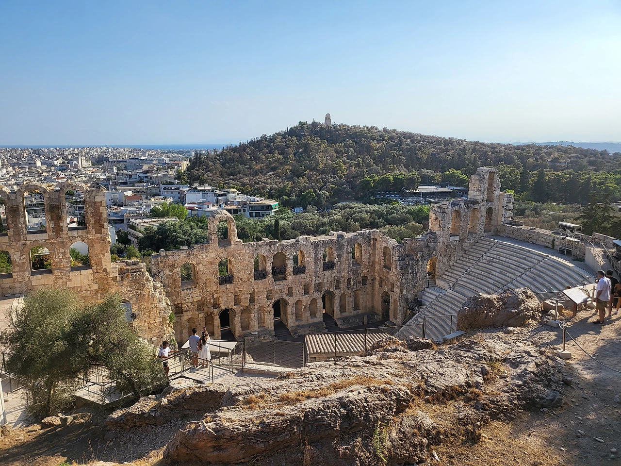 입구로 들어가 니케의 신전과 프로필라이아 문으로 들어가기 전, 아래쪽에는 커다란 헤로데스 아티쿠스 음악당이 있다. 지난번엔 오페라 <라 트라비아타> 리허설이 한창이었는데 지금은 공연이 없는지 음악당이 깔끔하게 정리된 모습으로 나타났다.