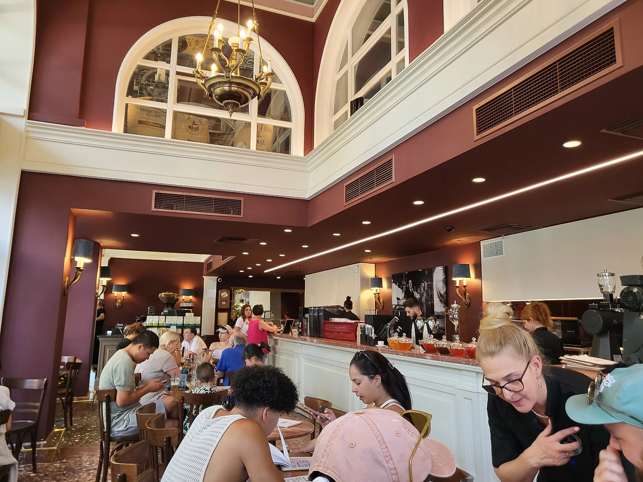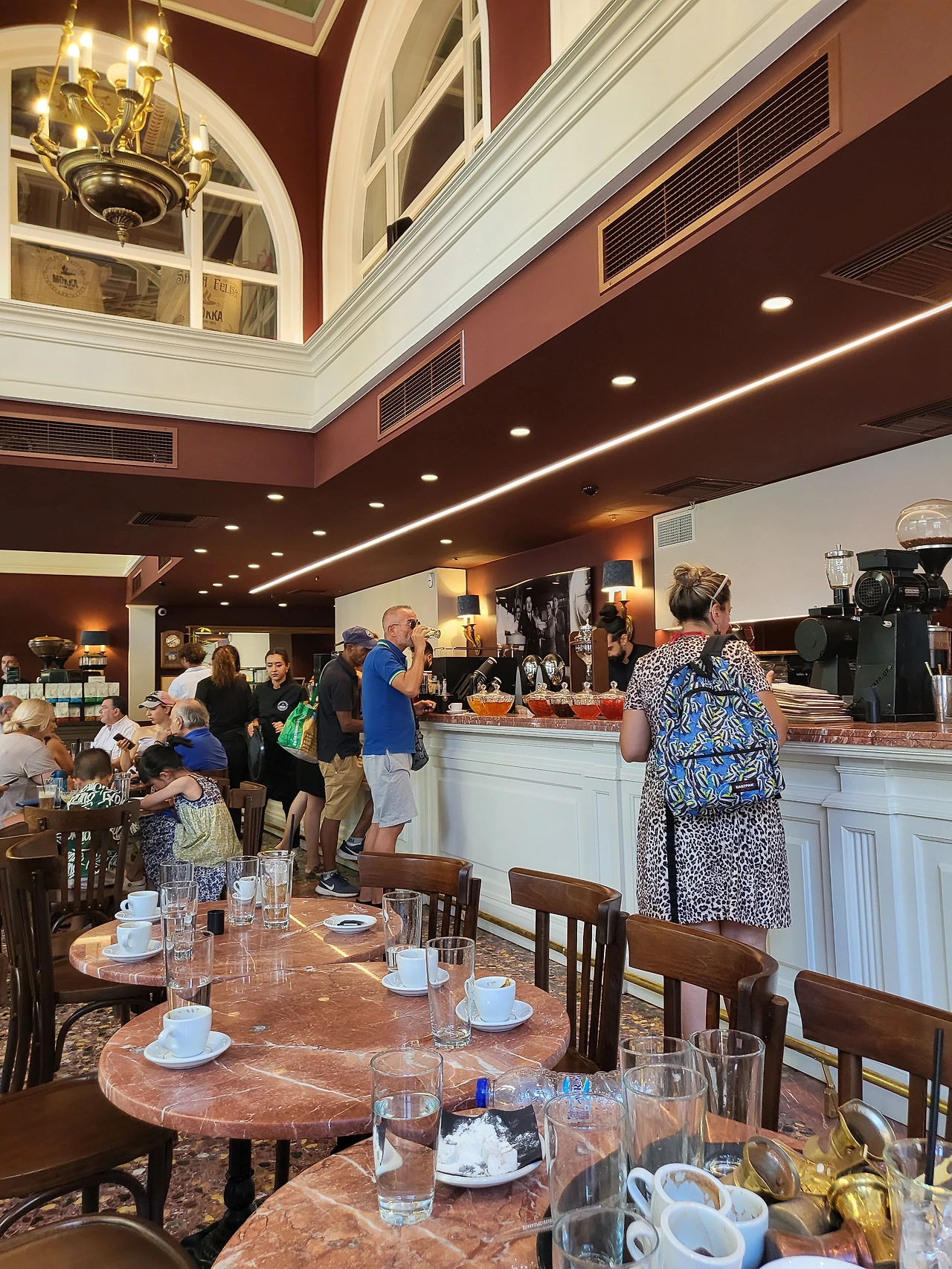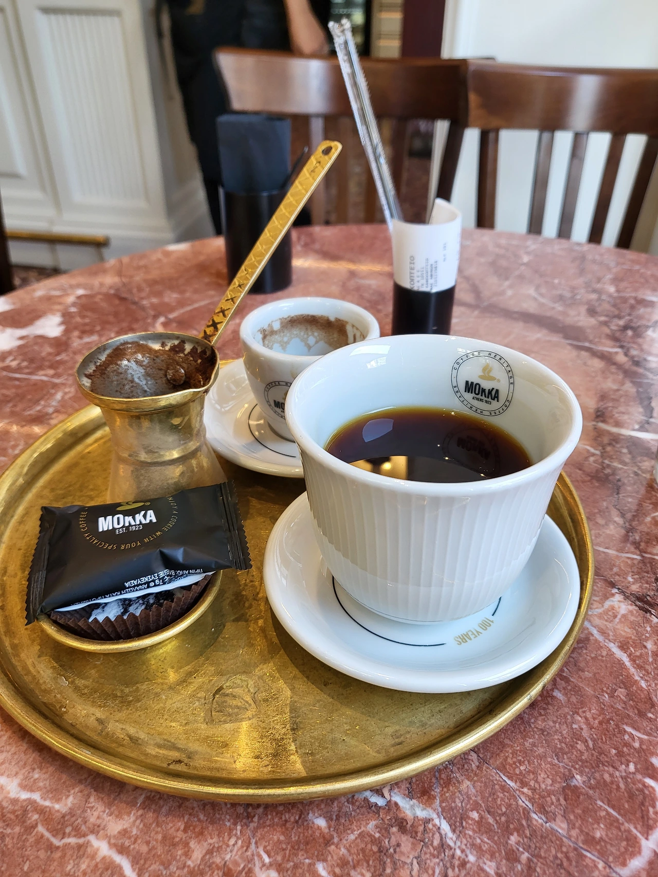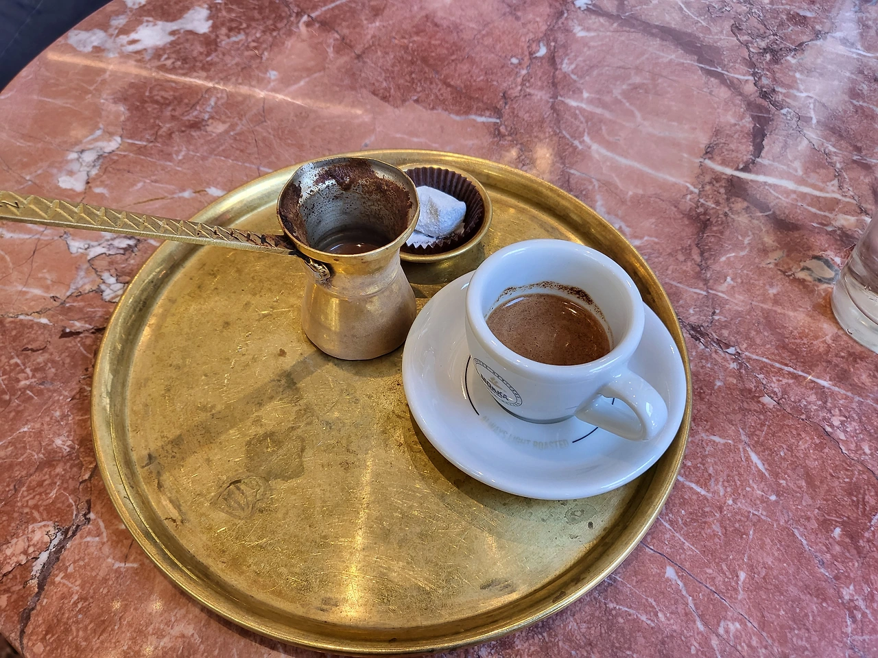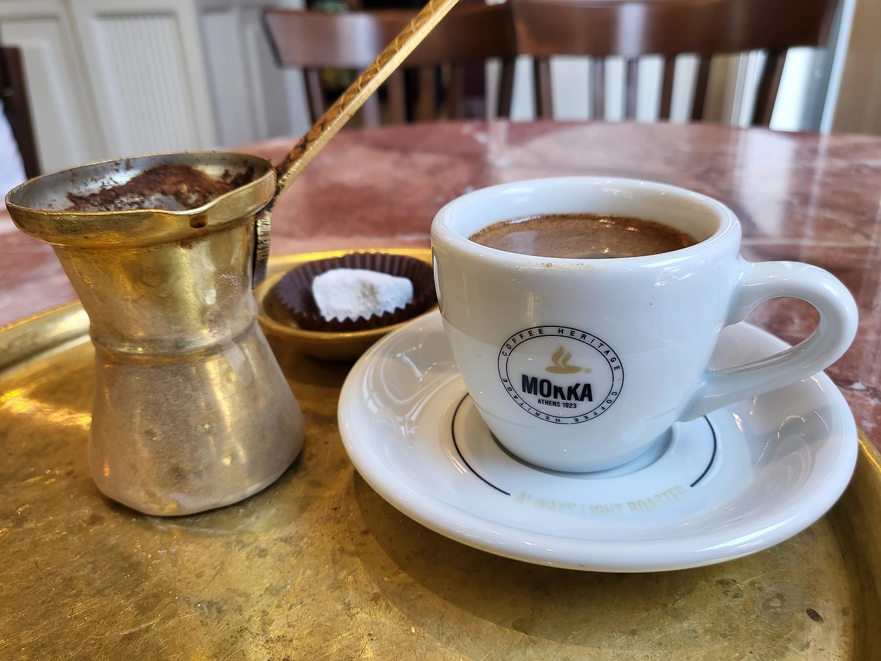 분명 신타그마 광장에 분점인 카페 모카(Mokka)가 있는 것을 보고 길 찾기를 했는데, 구글맵이 꽤 오랫동안 걷는 길로 안내했다. 그렇게 걷다 보니 세상에나...... 오모니아 광장에 있는 본점까지 걸어간 것. 100년 된 이 카페는 오모니아 광장의 한편에서 손님을 맞이하고 있었다. 오래된 카페답게 찾는 이들도 많았다. 그리스식 커피라고 하는데, 정확히 이것을 그리스식 커피라고 해야 할지 튀르키예식이라고 해야 할지 모르겠다. 데운 모래 위에 이브릭을 올려 끓여내는 커피라서 튀르키예식이라고 하는 게 나을까. 아마도 15세기에 동로마 제국이 멸망한 이후 오스만 투르크 지배를 받으며 커피 문화도 달라졌을 테니 투르크식 커피라고 하는 게 옳을지도 모르겠다. 투르크식 커피 한잔과 드립커피 한잔을 각각 시켰다. 각각의 다른 맛을 느끼고 싶었기 때문이기도 하다. 투르크식 커피는 설탕을 넣어서 끓였기 때문에 약간의 단맛이 있는 걸쭉한 가루 커피 맛이고, 드립커피는 내 입맛에 익숙한 느낌이랄까. 커피를 다 마시고 나오면서 이곳에서 로스팅한 커피 원두 네 봉지를 샀다. 250g에 10유로, 혹은 15유로 정도, 결국 커피 원두 1 kg을 산 것이다. 여행 가방 무게가 그만큼 늘어나겠다.