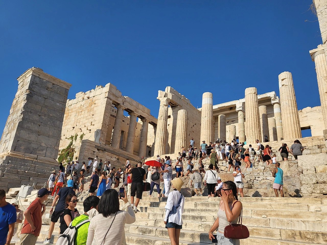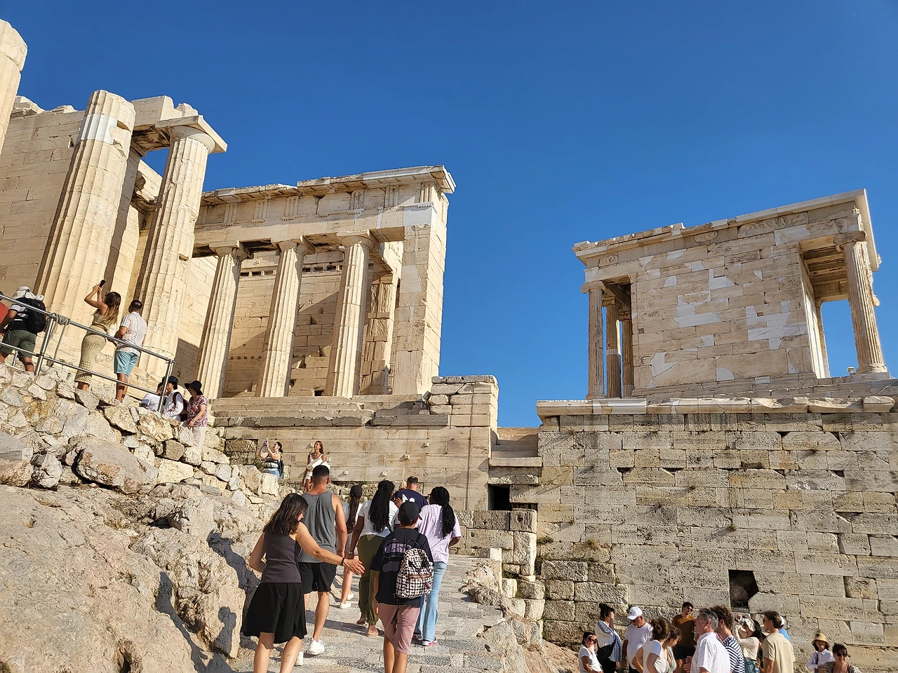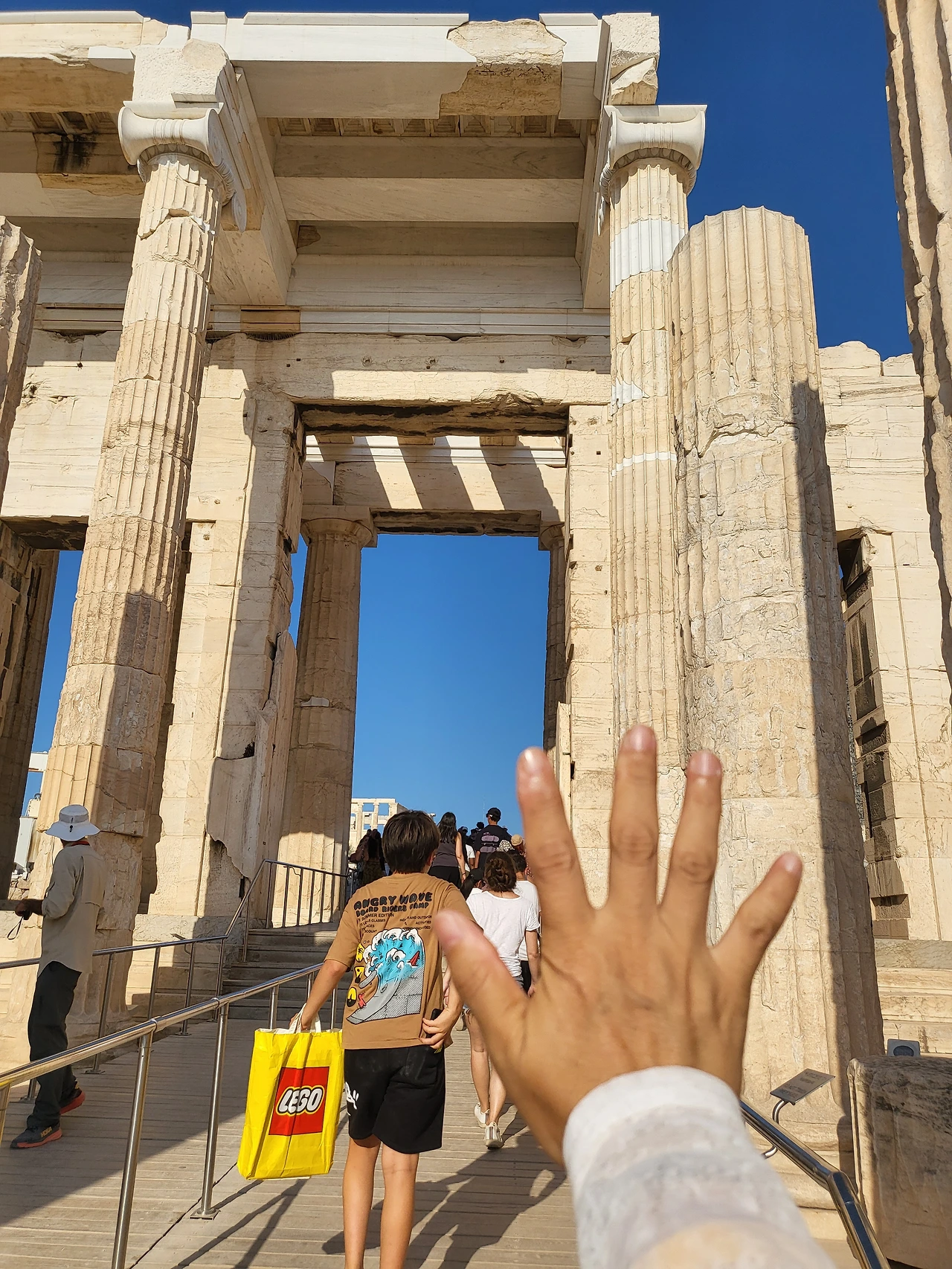 이곳을 지나 파르테논 쪽으로 올라가기 위해 니케의 신전 쪽으로 사람들을 따라간다. 니케의 신전을 지나 서 있는 기둥들이 아크로폴리스의 입구인 프로필라이아라는 것을 보여준다.