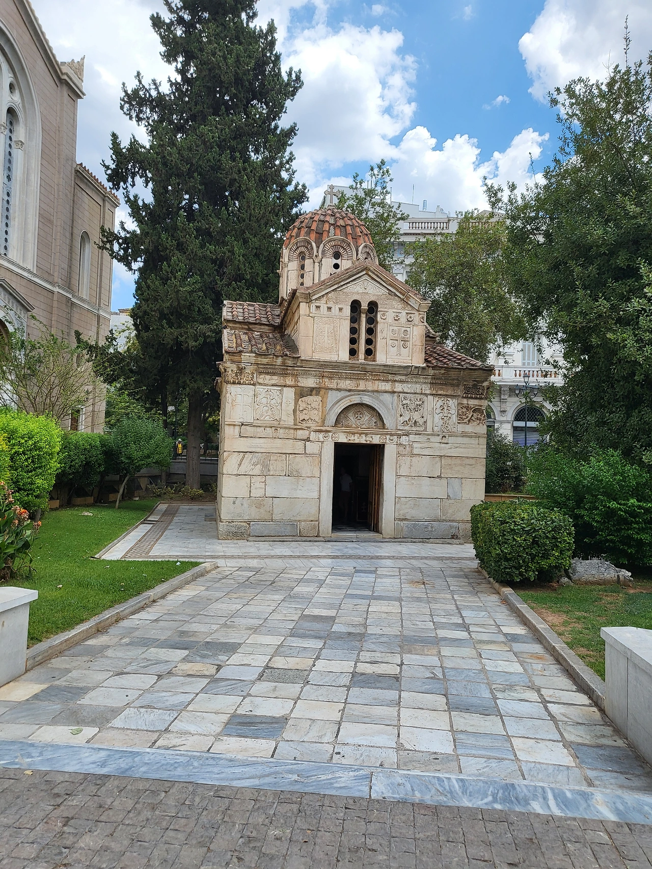 그런데 커피 1 kg은 가벼운 것이 아니다. 그래서 숙소에 커피를 두고 다시 나왔다. 그러고 나서 모나스티라키 광장 근처에 가서 소소한 기념품 쇼핑을 했다. 관광객들이 잘 산다고 하는 기념품 중 사고 싶었던 것을 대략 생각해 두고 나온 터라, 생각했던 것이 눈에 보이면 몇 군데 가게를 돌아다니며 가격을 알아보고, 적절한 곳에서 물건을 샀다. 싸게 산 것은 아닐 테지만, 그래도 터무니없이 비싸게 산 것은 아니라고 생각하면서. 그래도 가장 그리스적인 느낌이 나는 물건을 고르느라 고생은 좀 했다. 그러다 보면 물건이 많아진다. 무겁지는 않으나 주렁주렁 들고 다니는 것이 싫어서 숙소에 다시 와서 짐을 내려놓고 이번엔 플라카 거리 쪽으로 갔다. 숙소에서 플라카 거리 쪽으로 가다 보면 아테네 대성당을 만난다. 단정한 모습의 아테네 대성당 앞에는 많은 관광객들이 있었다. 아무래도 주말이다 보니 더 많은 사람들이 거리로 몰려들게 된다. 대성당 옆의 자그마한 교회는 아기오스 엘리프테리오스 교회라고 알려져 있으며, 12세기 비잔틴 건축 양식으로 지어진 것이라 한다. 고대 신전처럼 대리석으로 만들어진 곳이라 하는데, 지난번에 왔을 때는 닫혀 있어서 내부를 볼 수 없었다. 이번에는 조심스레 내부를 들여다볼 수 있었다. 자그마한, 그러면서 평온하고 소박한 교회였다.