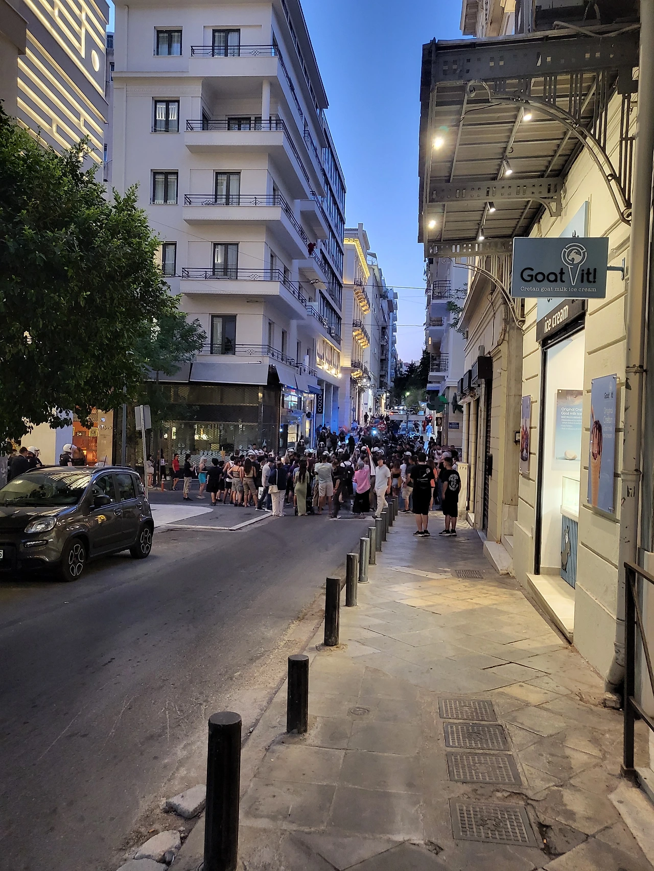 숙소로 돌아오는 길, 소규모의 시위대가 시위를 벌이고 있었다. 펄럭이는 깃발은 팔레스타인 국기이다. 이날, 이스라엘군이 팔레스타인 가자 지구 피난민 대피학교를 무차별 폭격했다고 한다. 이스라엘 군은 학교 내부의 하마스 지휘 통제 본부와 하마스 테러리스트들을 정밀 타격했다고 하지만, 이날 폭격으로 노인과 어린이, 여성을 포함한 100여 명이 사망했다고 하는 뉴스를 보았다. 그에 대한 소규모 시위가 아테네에서도 일어나고 있는 모양이다. 경찰이 주변에 있었고 시위는 평화적으로 진행되고 있었다.
