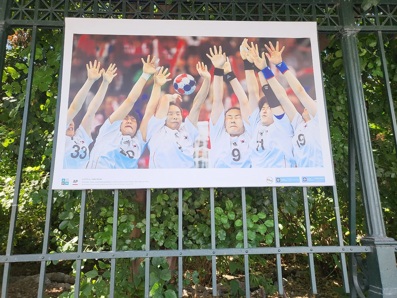 베나키 박물관을 나와 구글 검색을 하여 모카 카페를 찾아갔다. 국립 정원의 외부 벽에는, 현재 파리 올림픽 기간이라 과거 올림픽에서의 멋진 장면을 찍은 사진들을 내건 야외 전시가 이루어지고 있었다. 마침, 2012 런던 올림픽 당시 우리나라와러시아의 여자 핸드볼 8강전 경기 중 우리나라 선수들을 찍은 장면이 있어서 한컷.