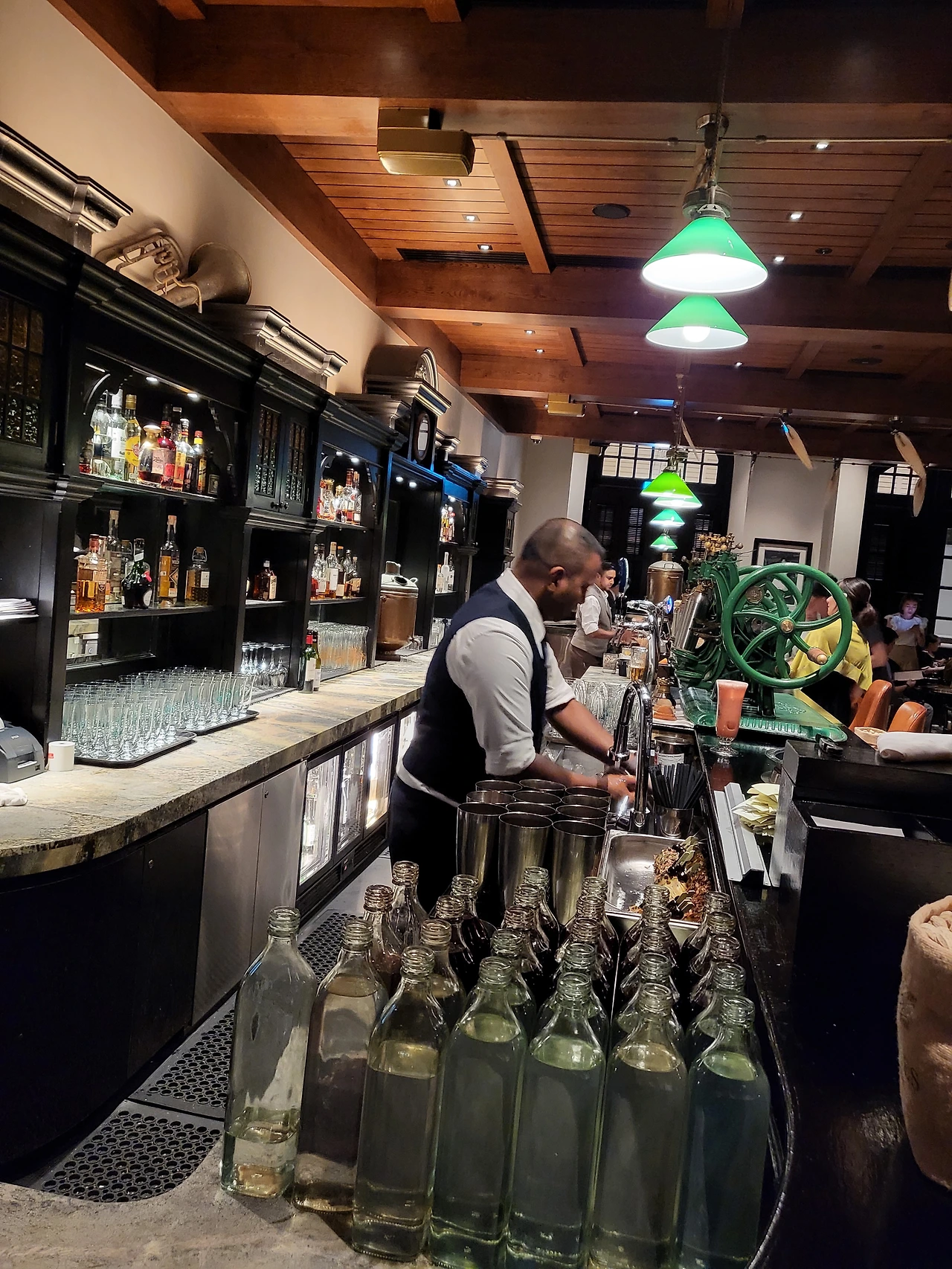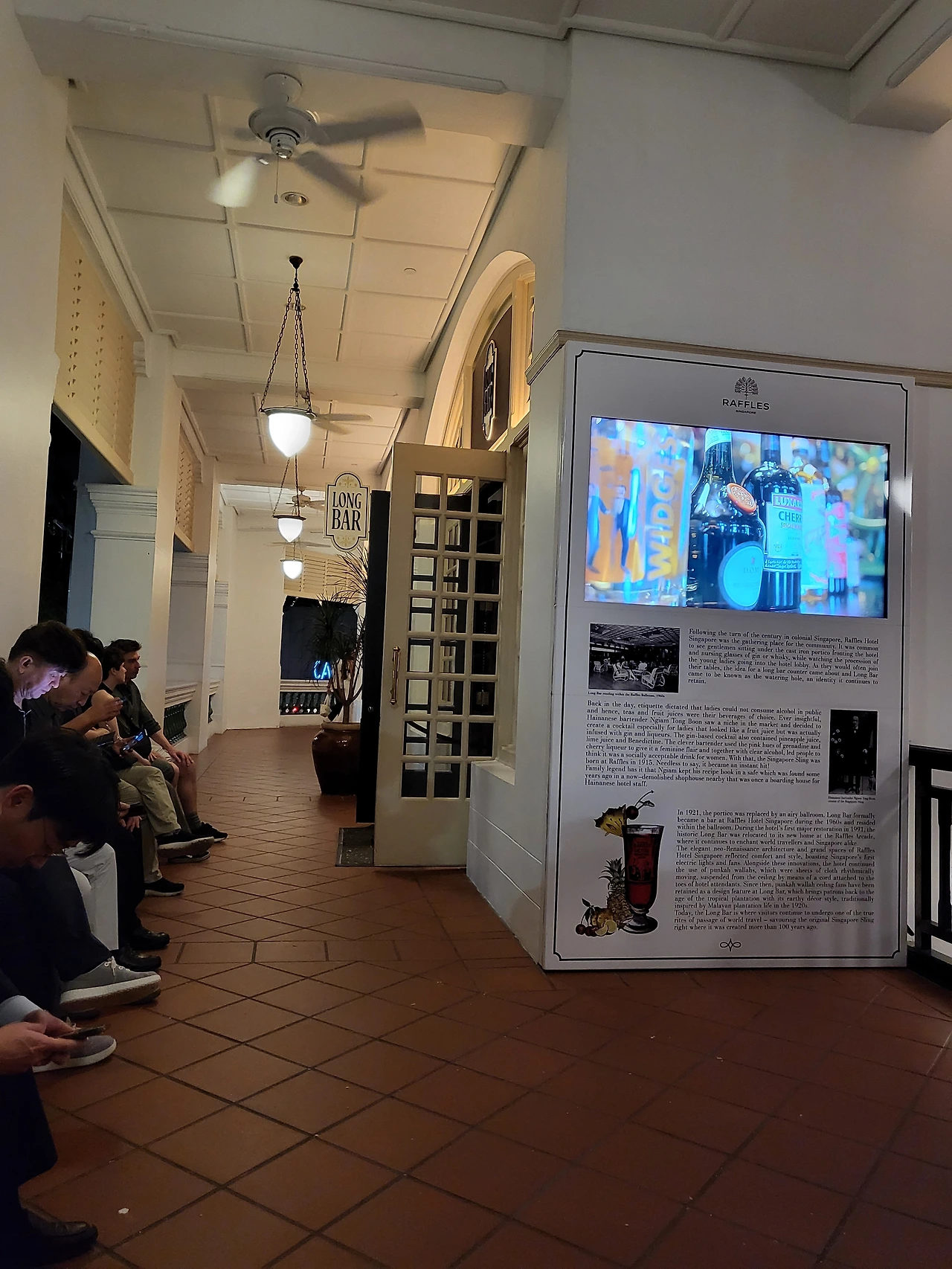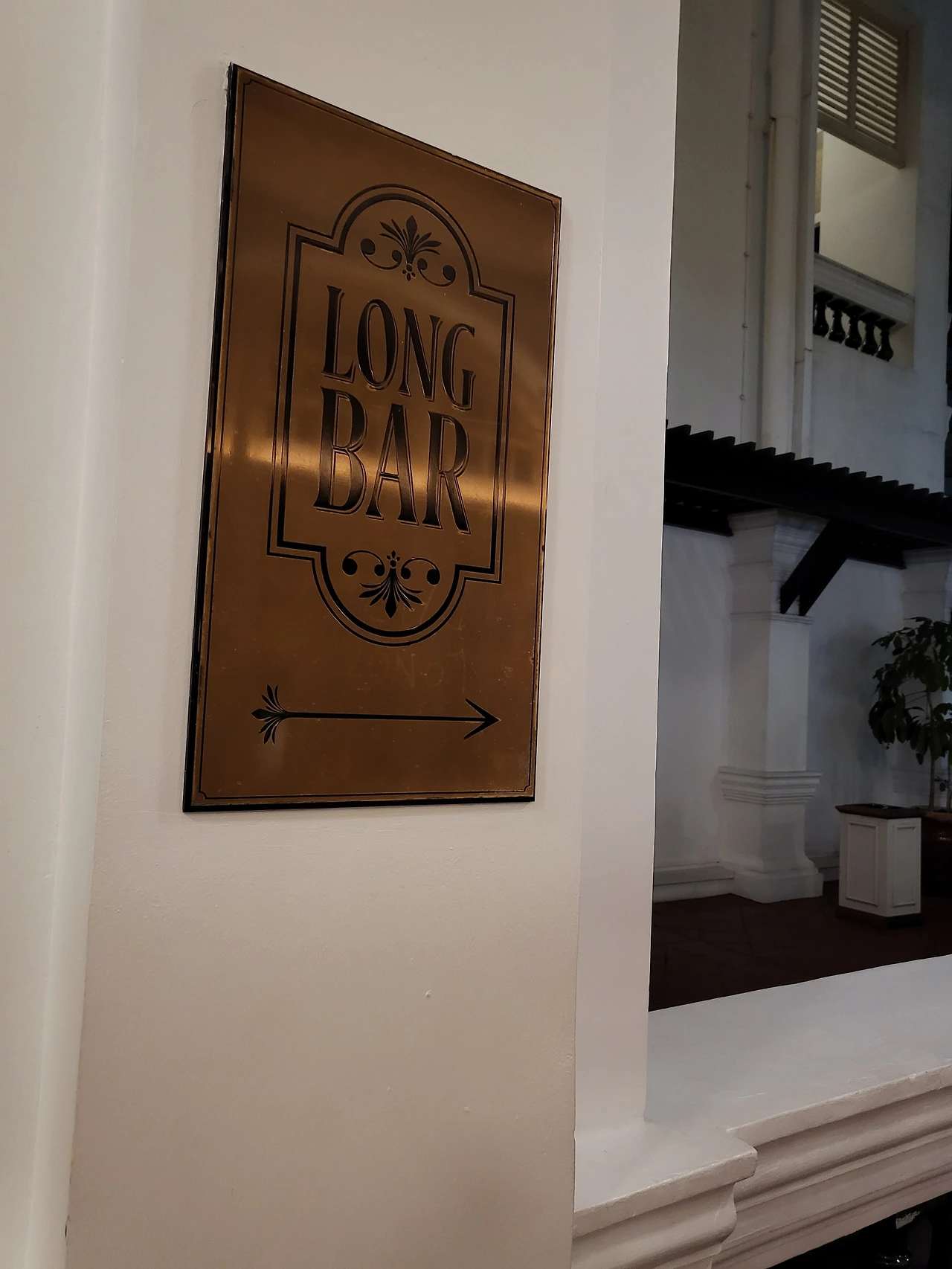 롱바는 1887년에 세워진 래플스 호텔 2층에 자리 잡고 있었다. 유명한 바이기에 이 시간에는 당연히 웨이팅이 있었다. 약 20여분쯤 지났을까. 자리가 났고 혼자라서 바텐더가 칵테일 만드는 모습을 볼 수 있는 바 좌석에 앉았다. 착석하면 웨이터가 커다란 땅콩자루를 내어주는데 이 땅콩을 까먹으며 싱가포르 슬링을 기다리면 된다. 땅콩껍질은 그냥 바닥에 버려도 된다는 것 역시 재미있다. 아무런 가책 없이 쓰레기를 버려도 되는 즐거움을 느낄 수 있다.
