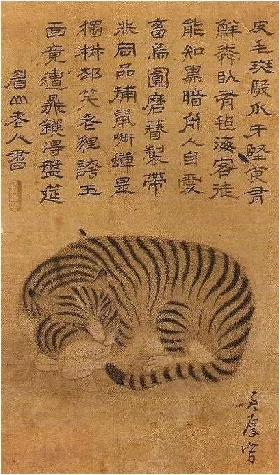18세기 조선화가 양촌(陽村) 마군후의 <반묘가수(班猫假睡; 얼룩고양이의 풋잠, 18세기 경)>. 그림 위쪽에는 화제(畫題)로 여겨지는 시가 쓰여있고 아래쪽에는 호랑이를 닮은 얼룩고양이가, 요즘 말하는 '식빵 자세'를 하고 눈을 가늘게 뜨고 있다. 앞을 보고 있지만 동시에 편안한 상태로, 아마 고양이는 잠에 빠질지도 모르겠다. 그런데 시의 내용은 고양이가 알면 잠에서 벌떡 일어나 줄행랑치겠다. 그 내용은 다음과 같다.