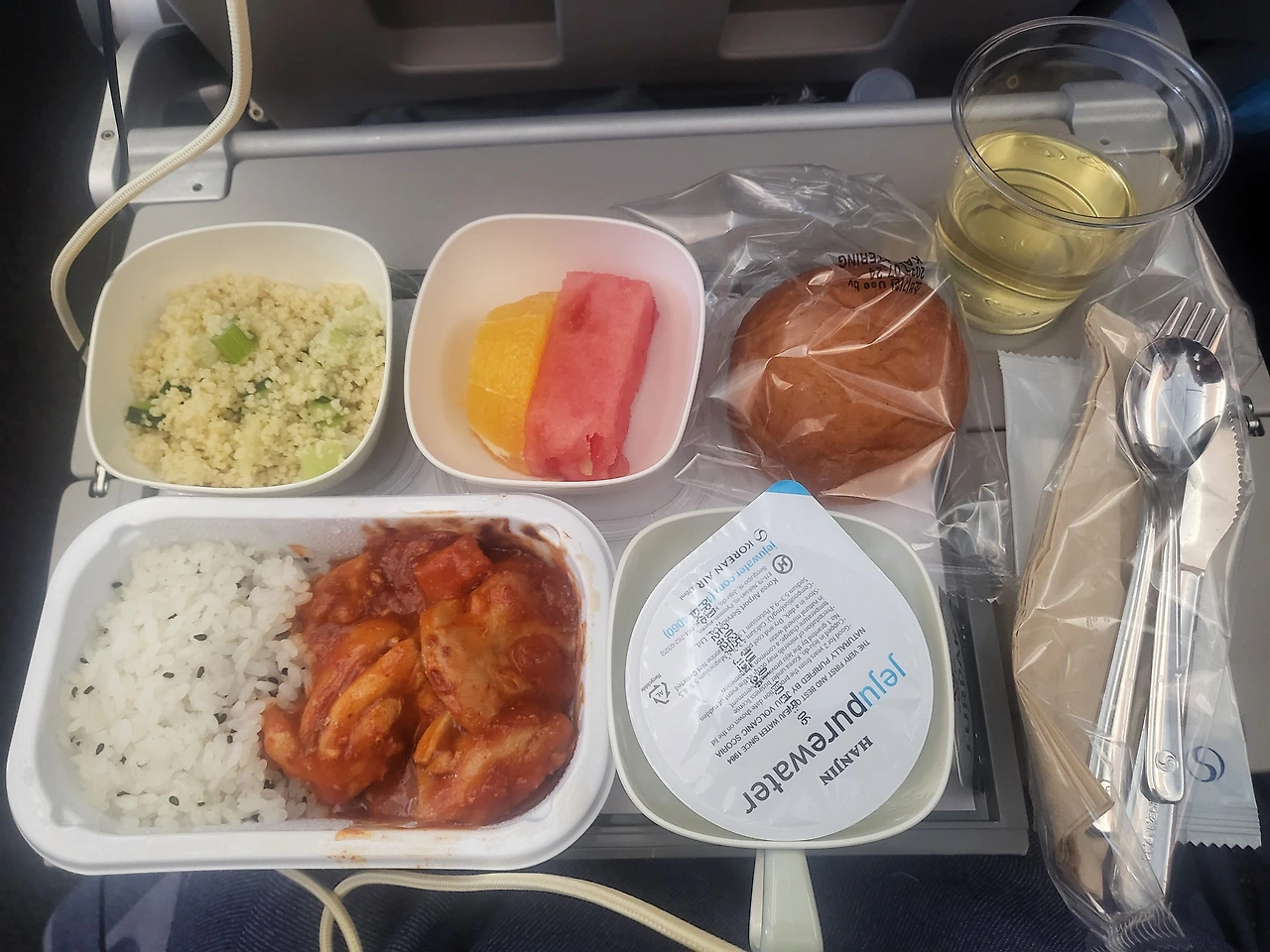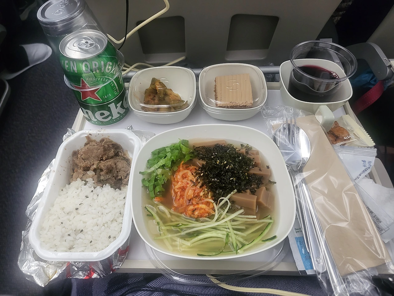 국적기를 타고 가면 좋은 것이 입맛에 맞는 우리 음식이 기내식으로 나온다는 것과 기내 서비스 언어가 기본적으로 우리말이라는 것이 편하다. 비행기가 안정적인 고도에 이르니 기내식 서비스 시작. 한동안은 한식을 먹을지 어떨지 모르겠다. 냄새에 민감한 사람이고 나이 들수록 음식에 대한 호불호가 심해져서 튀르키예 음식도 예전처럼 맛있게 느껴질지는 모르니까 일단은 한식으로 맛있게 기내식 먹기. 하이네켄과 레드 와인을 곁들였다.