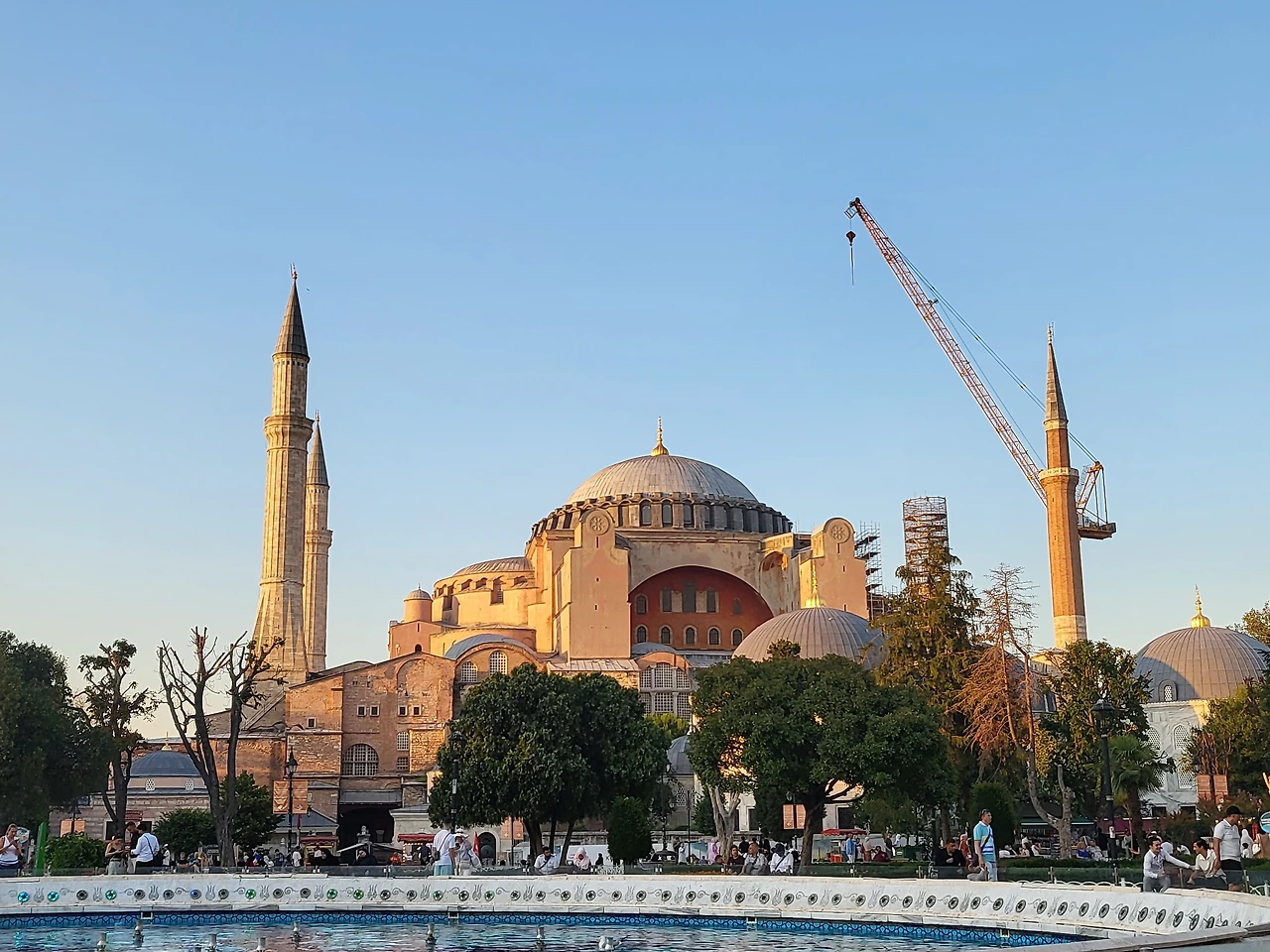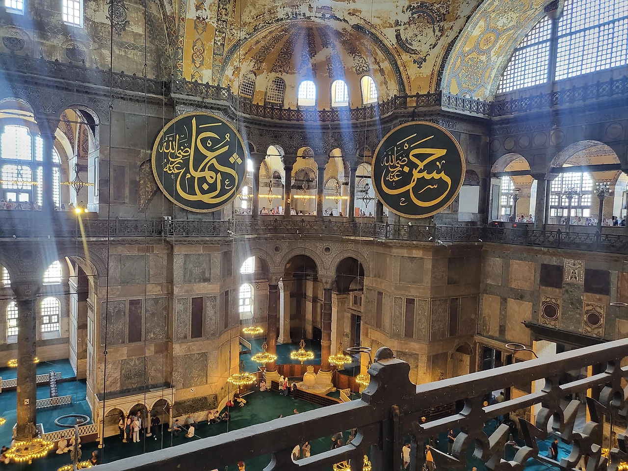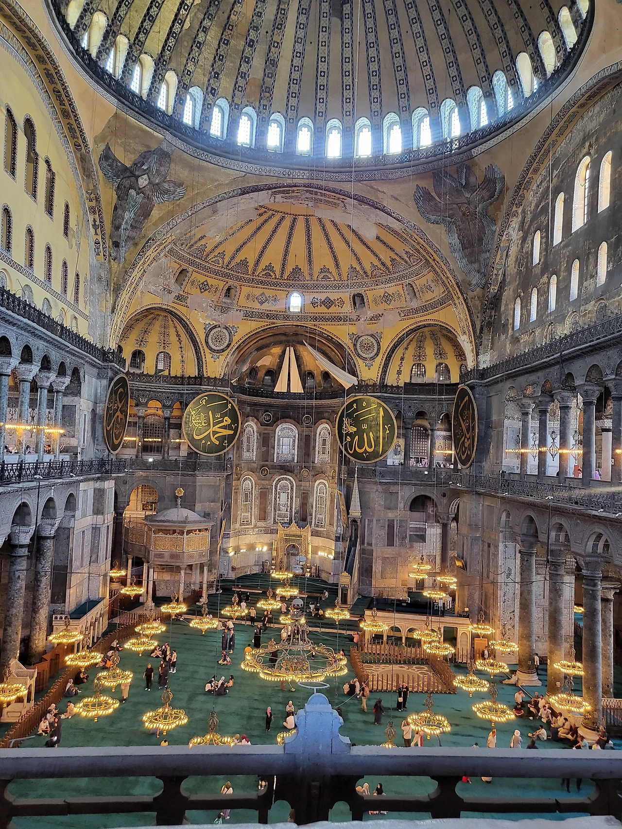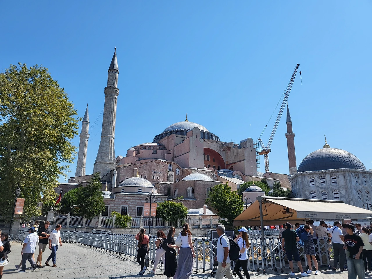 아야 소피아를 가볼지 어떨지 고민했다. 튀르키예의 각종 박물관의 입장료는 어마어마하게 올라 있었다. 아야 소피아만 해도 입장료가 파리의 유명한 미술관보다 더 비싸다. 그리고 박물관이었던 아야 소피아를 모스크로 바꿔버렸기에 예전처럼 자유롭게 작품들을 감상할 수도 없고, 1층은 신자가 아니면 들어갈 수도 없다. 게다가 머리를 가릴 수 있는 스카프가 없으면 아야 소피아에 들어가지 못한다. 맞은편의 술탄아흐멧 모스크의 경우에는 가리는 스카프를 무상으로 대여했는데 아야 소피아에서는 2유로에 판매하고 있었다(후에 알아보니 술탄 아흐멧 모스크에서도 스카프가 유료였다). 그래서 숙소에 가서 스카프를 갖고 오기로 했다. 사실 아침에 그 스카프를 들었다 놨었는데 결국 머리가 나쁘면 손발이 고생하기 마련이다. 숙소로 다시 가서 스카프를 가져왔다. 표는 이미 구입했기 때문에 스카프를 두르고 입장하면 되었다. 1층이 입장 금지되어 있기 때문에 바로 2층으로 입장하게 되는데 이곳에서 1층을 내려다보면 이슬람 신도들이 편안하게 앉아 있는 모습을 볼 수 있다. 모스크이기 때문에, 아야 소피아의 유명한 천장의 성모자 상은 1층에서는 잘 보이지 않게 가려져 있다. 2층에서만 가려진 천 너머로 볼 수 있을 뿐이다. 이스탄불에 왔기에 들러봐야 할 곳이기는 하지만, 예전처럼 즐겁게 볼 수 없다는 것이 아쉬웠다. 튀르키예 정부의 방침이겠지만, 굳이 박물관이었던 아야 소피아까지 모스크로 꼭 바꿔야 했을까. 모스크가 아니라 박물관으로 유지하고 입장료를 올렸다면 그래도 좀 덜 아쉬울 텐데 하는 생각이 들었다.