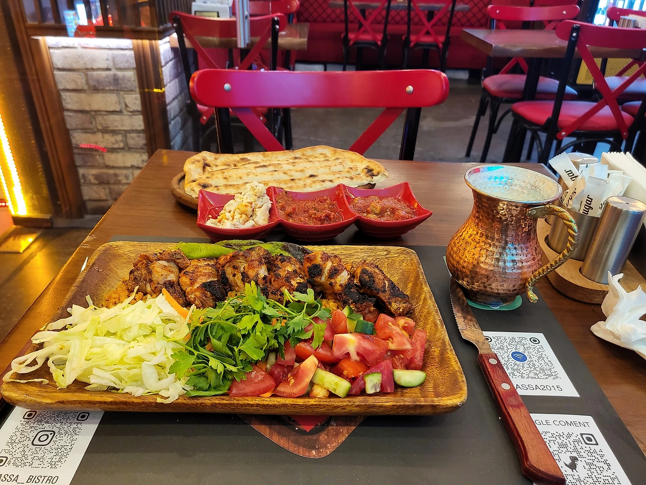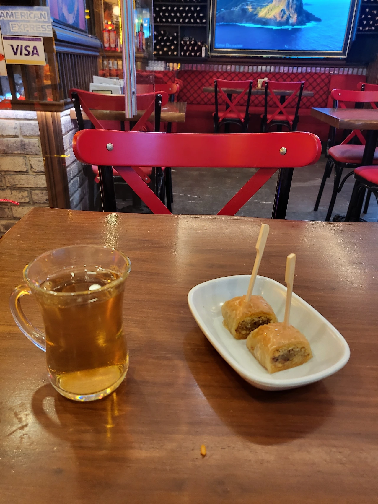 저녁이 되니 이제 뭔가 좀 제대로 된 식사를 하고 싶다는 생각이 들었다. 구글맵을 검색하여 평점이 괜찮은 식당을 찾았고 그곳에서 닭날개와 닭봉 케밥에 아이란을 시켰다. 식전 빵도 같이 나오는데 음식은 맛있지만 혼자 먹기엔 늘 양이 많다. 그래도 역시 닭고기는 딱 좋았다. 치킨엔 맥주가 딱 궁합이 좋지만 오늘은 아이란으로 만족하기. 후식으로 나온 차이와 바클라바도 맛있었다.