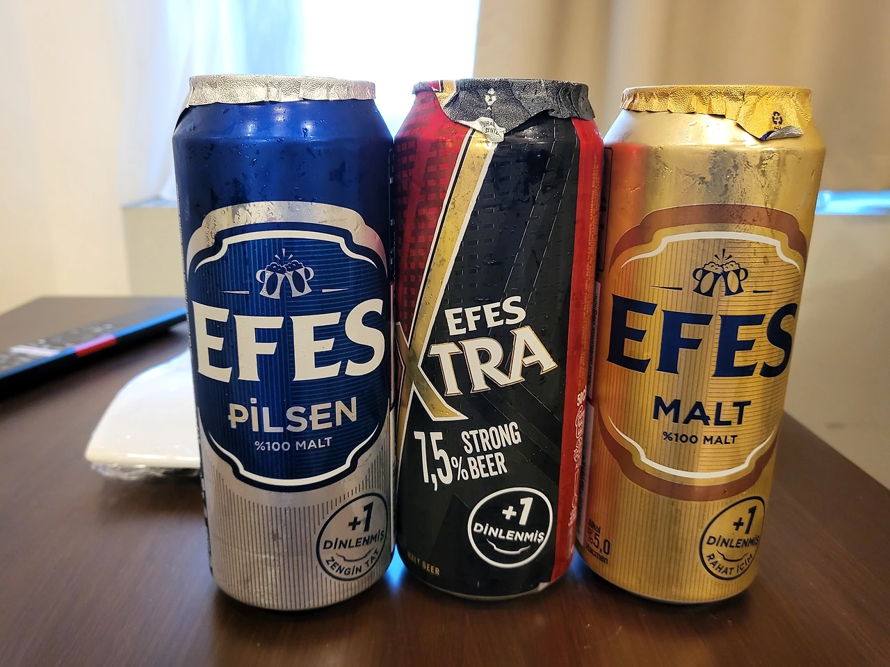 기차로 장거리 이동밖에 한 것이 없는데 피로는 몰려오고, 숙소로 돌아왔는데 이것저것 정리하고 식료품점 미그로스(Migros)에서 산 에페스. 이스탄불에선 맥주를 살 틈이 없어서 1식 1 맥도 못했고 숙소에서도 한잔 못했는데 이번엔 술 고프니까 맥주 세 캔을 샀다. 그중 하나는 에페스 엑스트라로 알코올 7.5%이다. 시원하게 오늘은 맥주를 마셔봤다. 역시 여름엔 맥주다.
