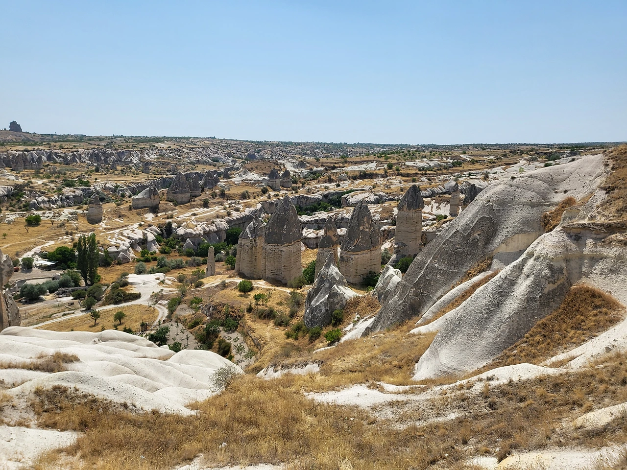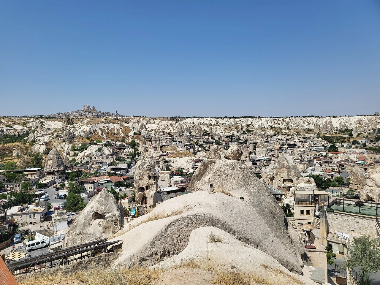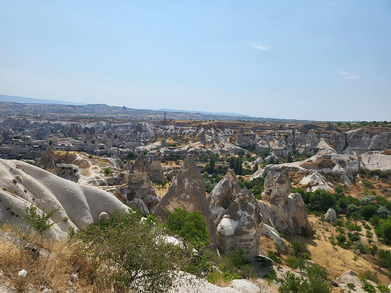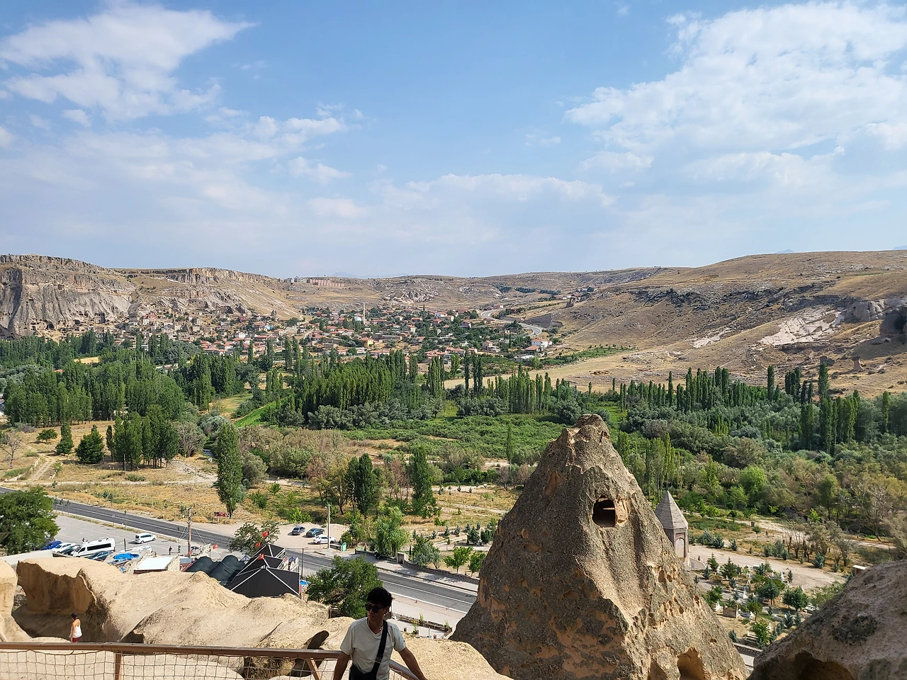 다음날 조식을 먹고 짐을 꾸린 후 체크 아웃을 했다. 짐은 숙소에 맡겨놓고, 전망대로 향했다. 땡볕에 걸어가는 길이 쉬운 것은 아니었지만 그래도 습하지는 않아서 괜찮은 편이다. 아무 생각 없이 위로 올라가는데 뒤쪽에서 아저씨가 소리쳐 부른다. 이 전망대 30리라의 입장료가 있었다. 입장료를 지불하고 전망대로 올라오니 괴레메 시내와 멀리까지 한눈에 들어왔다. 그리고 남근석을 닮은 바위들이 솟아있는 러브밸리까지 눈에 들어왔다. 이쯤에 들어서니 예전에 처음 이곳에 왔을 때 숙소가 이 부근의 동굴호텔이었던 것으로 기억이 났다. 그러나 지금은 대부분 커다란 동굴 호텔이 있어서 내가 한때 머물렀던 그곳이 어디인지는 알 수가 없다. 전망대에서 사진을 찍으며 시간을 보내고 있는데 한국인 가족을 만났다. 초등학생으로 보이는 아이와 함께 온 부부였다. 이번 여행에서 이렇게 아이와 함께 온 부모님들을 종종 만났다. 힘들어하지만 그래도 자신이 하고 싶은 것을 하고 있다는 것에 대한 자부심도 있었다고 해야 할까. 아무튼 그렇게 아이를 데리고 다니는 부모님들이 정말 대단해 보였다.