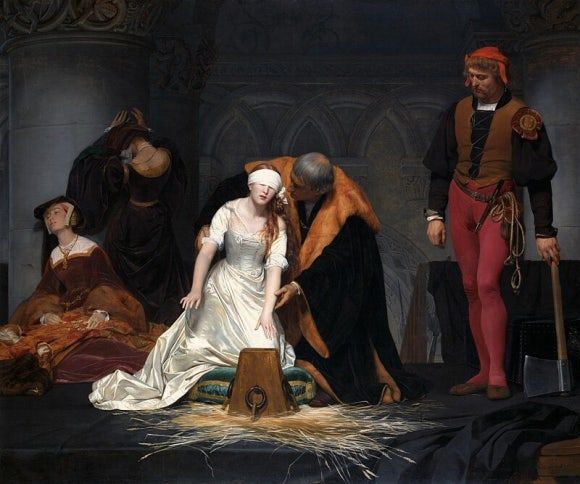 19세기 프랑스 화가 이폴리트 폴 들라로슈(Hippolyte-Paul Delaroche)의 <레이디 제인 그레이의 처형(The Execution of Lady Jane Grey, 1833)>. 그림 속에는 총 다섯 명이 등장하는데, 이 중에서 가운데 빛나는 흰 드레스를 입고 눈을 가린 채 안내자의 부축을 받으면 손을 더듬어 앞에 놓인 것을 만지려는 여인이 레이디 제인 그레이이다. 그녀 앞에 놓인 손잡이 달린 작은 판에 그녀가 머리를 놓고 엎드리면 처형이 준비된다. 그녀를 부축한 이는 아마 이 처형의 관리관일 것이다. 오른편에 도끼를 짚고 그녀를 내려다보는 이는 사형 집행인. 그녀에게 도끼를 휘두를 그도 엄숙한 표정으로 처형의 준비를 기다린다. 사형 집행인의 반대편에서 한 여인은 벽에 기대어 오열하고 있고 한 여인은 벽에 기댄 채 절망의 눈물을 흘리는 듯하다. 그녀들은 레이디 제인 그레이의 시녀들로 보인다. 모시고 있던 상전의 처형을 속절없이 바라보아야 하는 그녀들의 마음도 찢어졌을 것이다. 이 끔찍한 장면은 어떻게 재현된 것일까.