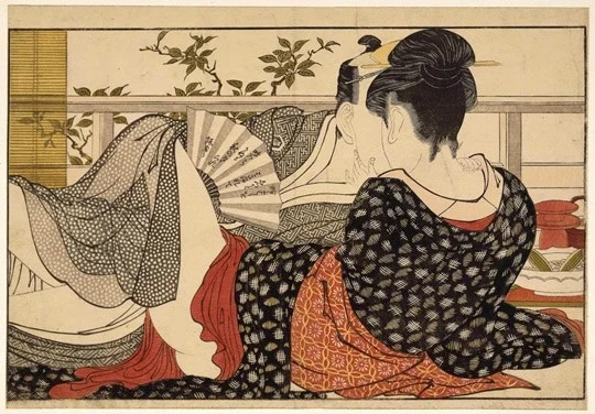 18세기 일본 우키요에 화가 기타가와 우타마로[喜多川歌麿]의 <찻집 위층방의 연인들; 베개의 시(1788)>. 배경에 솟은 나무는 난간 뒤로 뻗쳐져 있고 방안에서는 두 남녀가 서로 얽혀있다. 섬세하게 빗어 올린 머리 아래로 하얀 목덜미가 보이는 여인의 상반신은 옷으로 잘 감춰져 있는 반면, 하반신의 엉덩이가 그대로 드러나 있다. 남자의 옷인지 아니면 얇게 비쳐 보이는 천으로 된 시트인지 모르지만 그 아래로 여인의 가느다란 다리가 남자의 하체를 휘감고 있다. 마치 덩굴식물이 강한 나무를 휘감은 듯한, 그래서 더 관능적으로 보이는 작품이 아닐지. 여인의 입술에 키스하는 남자는, 잘 보이지 않지만 자세히 보면 여인의 귀와 머리가 이어지는 부분쯤에 가느다랗게 눈을 뜨고 있다. 여인의 표정을 살피는 것일까. 여인의 가느다란 다리와 남자의 하체가 얽힌, 분명히 묘하게 섹시한 느낌을 가져다주는 그림이다. 게다가 여인의 다리와 겹쳐진 부분, 그 은밀한 위치에, 아마도 남자의 손이 들고 있었을 부채에 적힌 시 역시 의미심장하게 관능적이다. 그 내용은 다음과 같다.