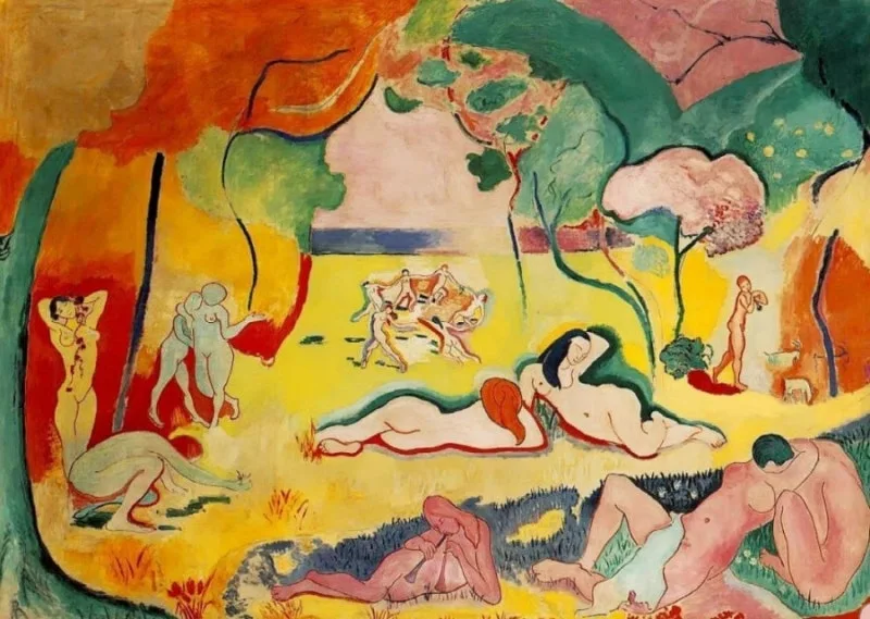 독일 화가이자 조각가 막스 에른스트(Max Ernst)의 <삶의 기쁨(1936)>. 멀리서 보면 이 작품은 프랑스 화가 앙리 루소의 그림 같은 푸른색 가득한 식물들이 펼쳐져 색감으로 볼 때는 편안하다. 그러나 그림을 가까이서 자세히 보면 중앙 아래쪽에는 날카로운 눈을 뜬 채 아래를 응시하는 사마귀의 형상이 보이고, 그 앞쪽에는 실체를 알지 못하는 생명체가 위협하듯 입을 벌리고 있다. 그리고 그 생명체가 펼친 기이하게 긴 팔의 한쪽 끝은 엄지와 검지를 동그랗게 말고 두 손가락을 펼친 손이 보이고 반대쪽 팔의 끝에는 아래로 향해진 꽃을 움켜잡은 푸른 손이 보인다. 꽃들은 탐스럽지 않고 시든 모습이다. 꽃을 움켜잡은 손을 따라 위로 시선을 돌리면 엷은 색의 작은 여인의 모습이 보이고 그 앞을 지키는 듯한 머리는 말과 개를 닮은 듯한 괴수의 형상이 보인다. 전체적인 색감은 녹색이지만 그림 속이 형상들은 대부분 불안한 느낌을 준다. 화가는 이 그림에 '삶의 기쁨'이라는 어울리지 않는 이름을 붙여주었다. 자세히 보면 그리 기뻐 보이지 않는 그림을 이렇게 명명한 이유는 무엇일까. 설명에 따르면 이 그림은 프랑스 화가 앙리 마티스의 <삶의 기쁨(1905-1906)>을 풍자한 것이라 한다. 다음 그림이 마티스의 작품이다.
