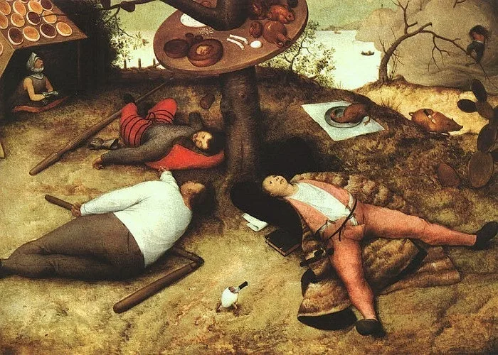 16세기 플랑드르 화가 대(大) 피테르 브뢰헬(Pieter Brueghel the Elder)의 <게으름뱅이의 천국(1567)>. 그림 속의 사람들은 모두 배부르게 먹고 누워있다. 나무의 작은 테이블에는 음식이 놓여있다. 그림의 정면 두 사람 사이에는 작은 달걀이 보이는데 스푼이 담겨 있고 작은 발로 보아 움직일 수 있어 보인다. 그뿐만이 아니라 구워진 칠면조는 쟁반에 누워있고, 걸어 다니는 돼지에게는 칼이 꽂혀있다. 자세히 보면 꽂힌 칼 위쪽으로 잘려나간 자국도 보인다. 멀리 흐르는 강물은 하얗다. 혹시 계절이 겨울이라 언 강물에 눈이 덮인 게 아닐까 하는 의심도 들지만, 떠있는 조각배들로 보아 겨울도, 눈도 아닌 듯하다. 오히려 강물이 물이 아닌지도 모르겠다. 그림의 왼쪽 윗부분에 있는 집 지붕의 기와는 맛있는 파이이다. 그 지붕 아래, 멍하니 하늘을 쳐다보는 기사가 보인다. 그의 표정을 읽을 수 없지만 조금은 무료해 보인다. 누워있는 사람들의 표정은 그리 밝아 보이지만은 않는다. 분명히 배가 부르고 편안한 상태인데도 그들은 그다지 만족스럽게 보이지는 않는다. 그림의 제목에서 말해주듯, 이곳은 게으름뱅이의 천국. 아무것도 하지 않고 게으름만 피워도 모든 것이 이뤄지는 나라에서 행복할 수 있을까.