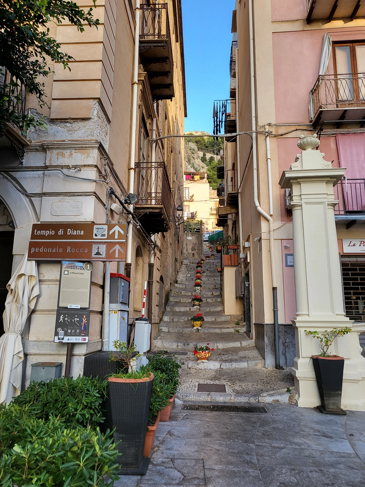 식사를 한 이후에 대성당 쪽으로 다시 간다. 혹시나 성당 내부는 입장할 수 있지 않을까 하는 생각이 들었던 탓이다. 저녁 햇살이 비스듬히 비치는 시칠리아의 골목길과 그 길의 끝에서 올려다보는 라 로카의 모습이 매력적이었다.