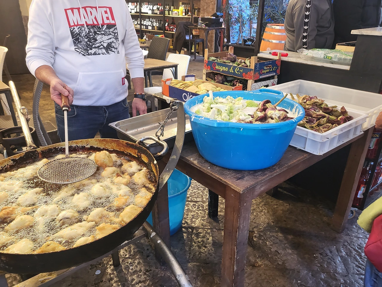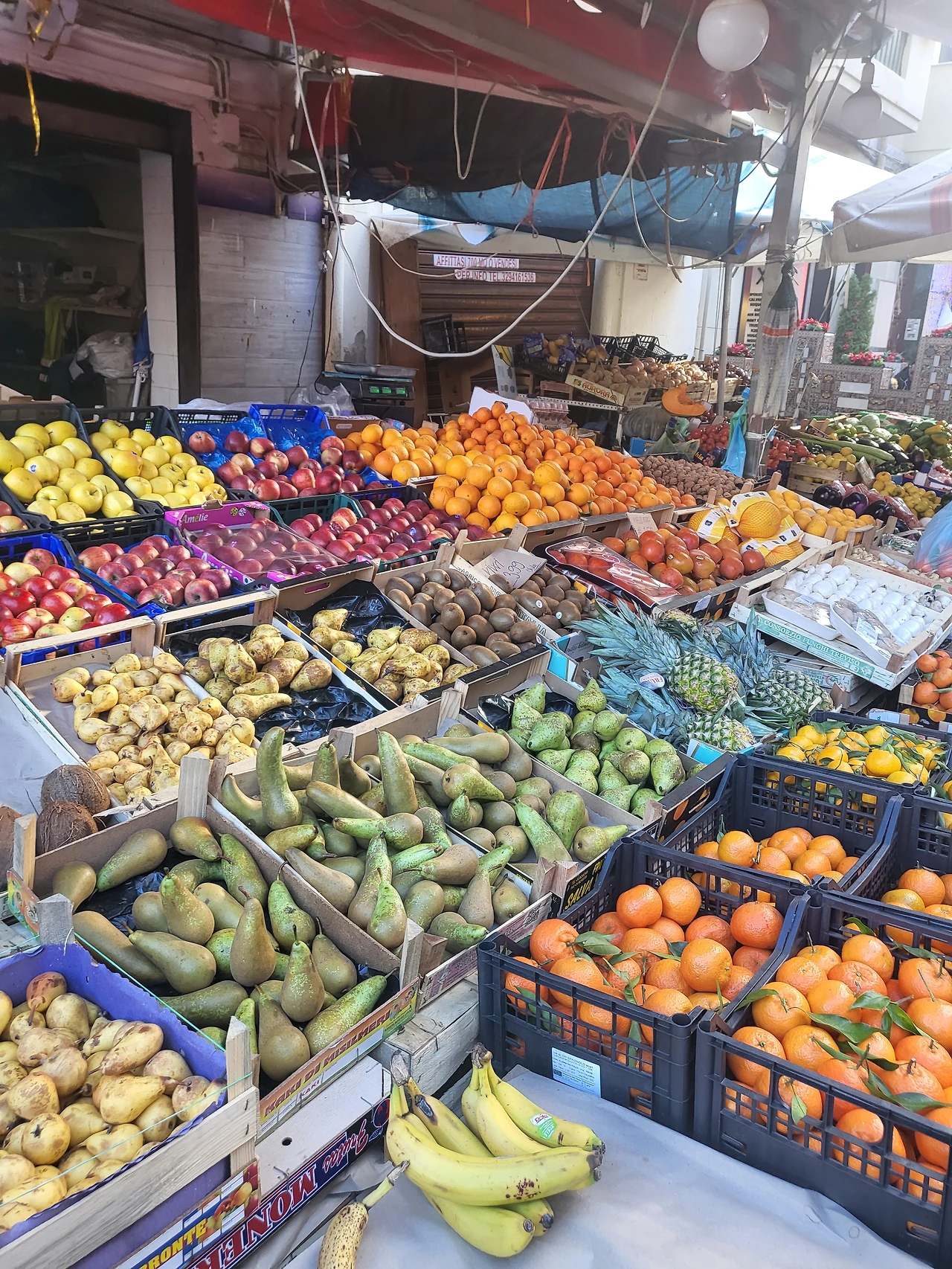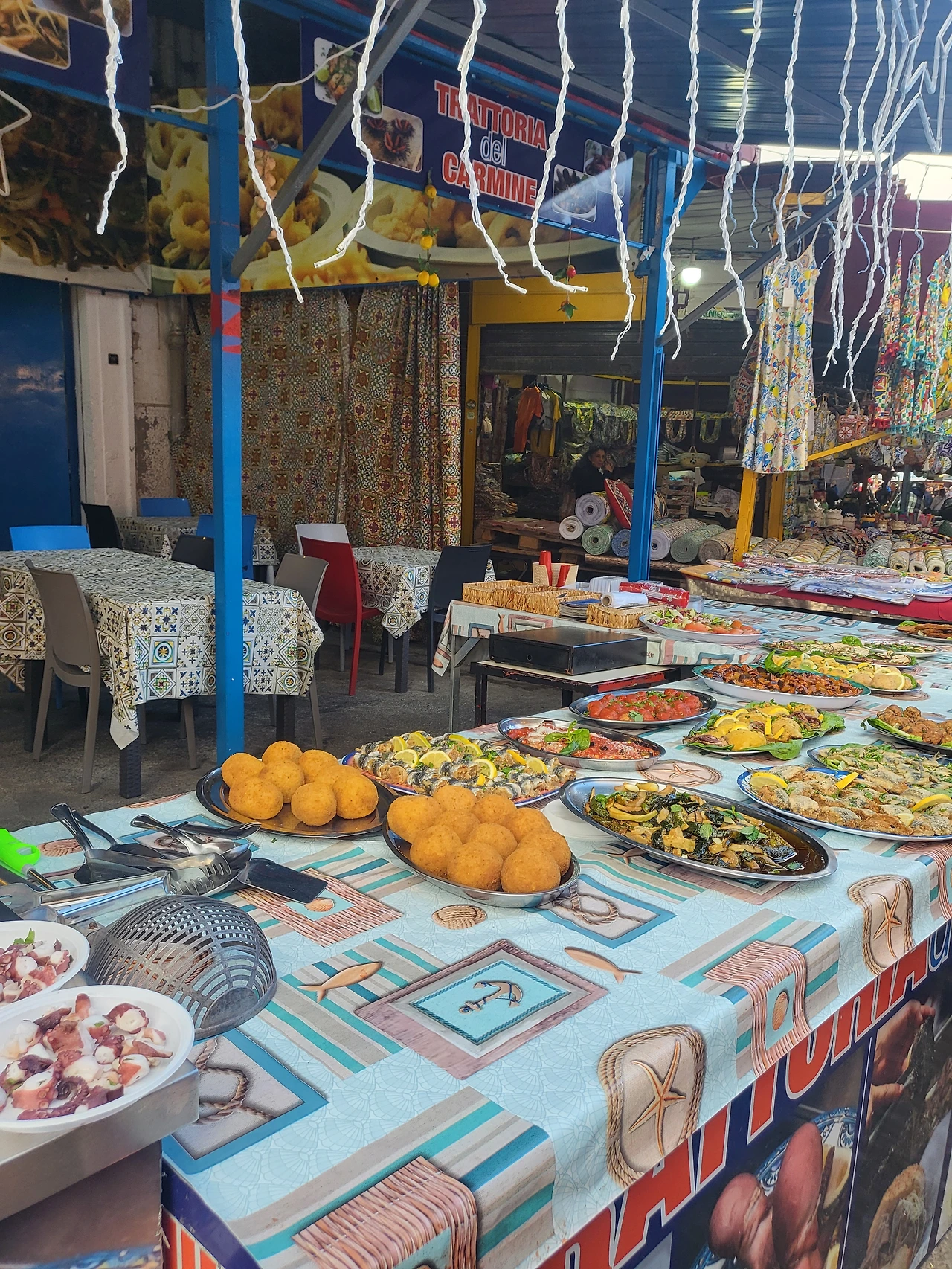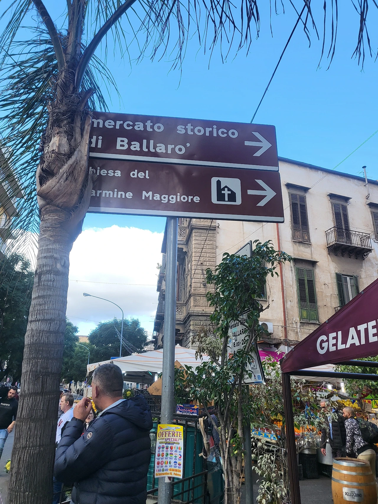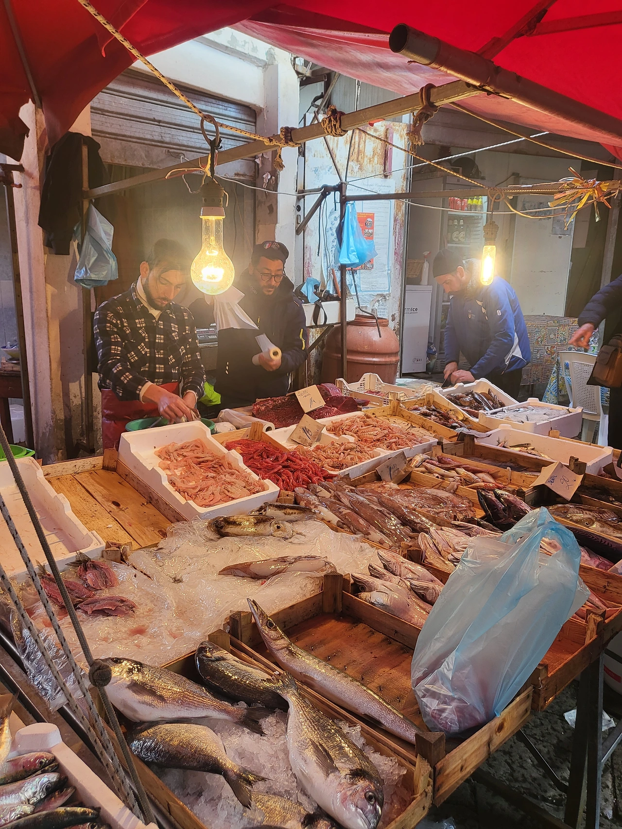 십여 분쯤 걸었을까. 중앙역에 도착했다. 기차표를 알아보니 가까운 시간의 차표는 매진이었고 한 시간 반쯤 후의 표가 있었다. 표를 구입하고 근처 카페에서 카푸치노와 크라상으로 잠시 쉬었다가, 역 부근에 있는 팔레르모의 큰 시장인 발라로 시장을 잠시 둘러보았다. 겨울에도 따스한 지중해 지역이라 그런지 과일과 채소도 많았고, 섬이어서 그런지 해산물도 풍부했다. 노점에서 파는 먹거리들도 풍성하여 보는 즐거움도 쏠쏠했다.