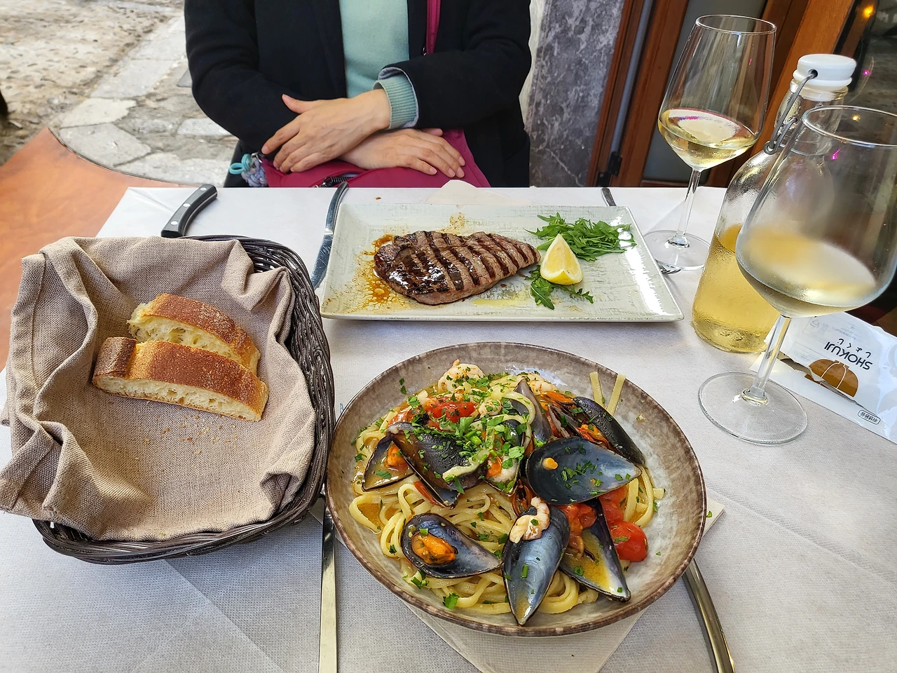 돌아다니다 보니 어느새 점심시간을 놓쳤다. 조금 늦은 점심을 먹기 위해 다시 바닷가 쪽으로 내려갔다. 맛집에 대한 정보를 찾아가는 편이 아니라 어쩔 수 없이 구글 맛집과 평점을 참고한다. 성당 앞에도 자리는 많았지만 그다지 먹고 싶은 것이 없었다. 그래서 다시 포르타 마리나 쪽에 위치한 '아 마리나(A'Marina)'에서 늦은 점심 식사를 한다. 봉골레 파스타와 스테이크, 화이트와인을 곁들인 평범하지만 맛있는 식사를 외부 테이블에서 즐겼다. 1월이지만 적당히 따스한 바람, 따스한 공기를 즐기면서. 아, 물론 길가인지라 여러 가지 소음도 뒤따라왔지만.
